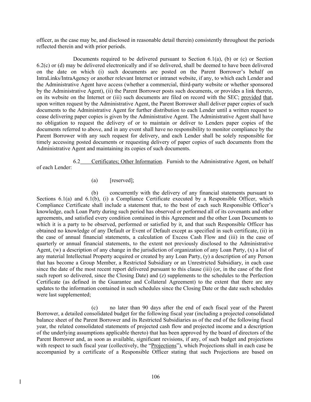 officer, as the case may be, and disclosed in reasonable detail therein) consistently throughout the periods reflected therein and with prior periods. Documents required to be delivered pursuant to Section 6.1(a), (b) or (c) or Section 6.2(c) or (d) may be delivered electronically and if so delivered, shall be deemed to have been delivered on the date on which (i) such documents are posted on the Parent Borrower’s behalf on IntraLinks/IntraAgency or another relevant Internet or intranet website, if any, to which each Lender and the Administrative Agent have access (whether a commercial, third-party website or whether sponsored by the Administrative Agent), (ii) the Parent Borrower posts such documents, or provides a link thereto, on its website on the Internet or (iii) such documents are filed on record with the SEC; provided that, upon written request by the Administrative Agent, the Parent Borrower shall deliver paper copies of such documents to the Administrative Agent for further distribution to each Lender until a written request to cease delivering paper copies is given by the Administrative Agent. The Administrative Agent shall have no obligation to request the delivery of or to maintain or deliver to Lenders paper copies of the documents referred to above, and in any event shall have no responsibility to monitor compliance by the Parent Borrower with any such request for delivery, and each Lender shall be solely responsible for timely accessing posted documents or requesting delivery of paper copies of such documents from the Administrative Agent and maintaining its copies of such documents. 6.2 Certificates; Other Information. Furnish to the Administrative Agent, on behalf of each Lender: (a) [reserved]; (b) concurrently with the delivery of any financial statements pursuant to Sections 6.1(a) and 6.1(b), (i) a Compliance Certificate executed by a Responsible Officer, which Compliance Certificate shall include a statement that, to the best of each such Responsible Officer’s knowledge, each Loan Party during such period has observed or performed all of its covenants and other agreements, and satisfied every condition contained in this Agreement and the other Loan Documents to which it is a party to be observed, performed or satisfied by it, and that such Responsible Officer has obtained no knowledge of any Default or Event of Default except as specified in such certificate, (ii) in the case of annual financial statements, a calculation of Excess Cash Flow and (iii) in the case of quarterly or annual financial statements, to the extent not previously disclosed to the Administrative Agent, (w) a description of any change in the jurisdiction of organization of any Loan Party, (x) a list of any material Intellectual Property acquired or created by any Loan Party, (y) a description of any Person that has become a Group Member, a Restricted Subsidiary or an Unrestricted Subsidiary, in each case since the date of the most recent report delivered pursuant to this clause (iii) (or, in the case of the first such report so delivered, since the Closing Date) and (z) supplements to the schedules to the Perfection Certificate (as defined in the Guarantee and Collateral Agreement) to the extent that there are any updates to the information contained in such schedules since the Closing Date or the date such schedules were last supplemented; (c) no later than 90 days after the end of each fiscal year of the Parent Borrower, a detailed consolidated budget for the following fiscal year (including a projected consolidated balance sheet of the Parent Borrower and its Restricted Subsidiaries as of the end of the following fiscal year, the related consolidated statements of projected cash flow and projected income and a description of the underlying assumptions applicable thereto) that has been approved by the board of directors of the Parent Borrower and, as soon as available, significant revisions, if any, of such budget and projections with respect to such fiscal year (collectively, the “Projections”), which Projections shall in each case be accompanied by a certificate of a Responsible Officer stating that such Projections are based on 106