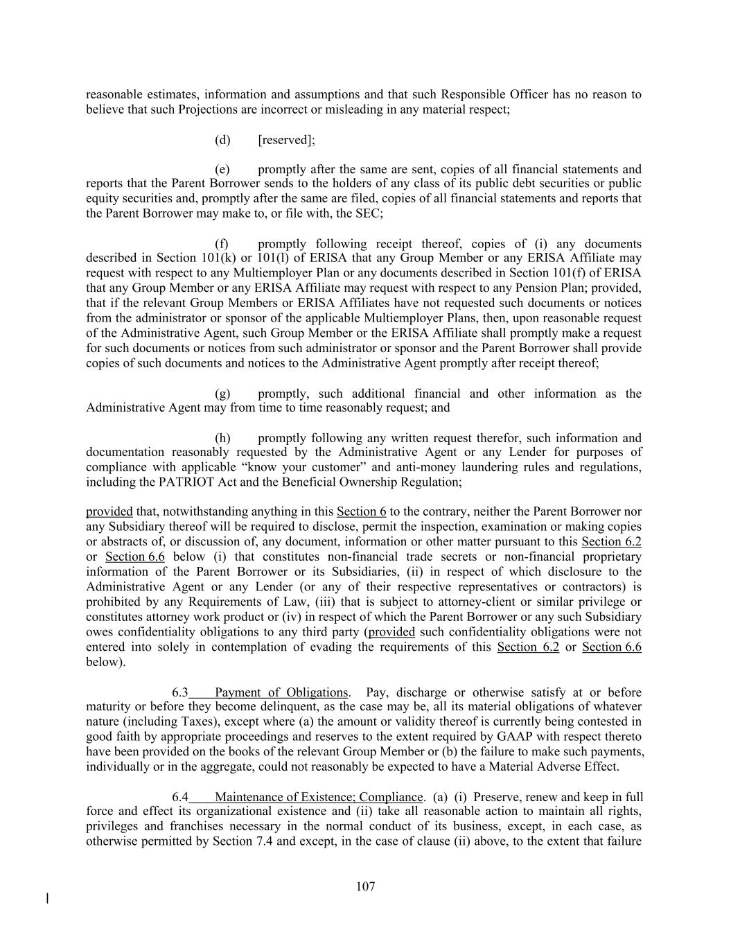 reasonable estimates, information and assumptions and that such Responsible Officer has no reason to believe that such Projections are incorrect or misleading in any material respect; (d) [reserved]; (e) promptly after the same are sent, copies of all financial statements and reports that the Parent Borrower sends to the holders of any class of its public debt securities or public equity securities and, promptly after the same are filed, copies of all financial statements and reports that the Parent Borrower may make to, or file with, the SEC; (f) promptly following receipt thereof, copies of (i) any documents described in Section 101(k) or 101(l) of ERISA that any Group Member or any ERISA Affiliate may request with respect to any Multiemployer Plan or any documents described in Section 101(f) of ERISA that any Group Member or any ERISA Affiliate may request with respect to any Pension Plan; provided, that if the relevant Group Members or ERISA Affiliates have not requested such documents or notices from the administrator or sponsor of the applicable Multiemployer Plans, then, upon reasonable request of the Administrative Agent, such Group Member or the ERISA Affiliate shall promptly make a request for such documents or notices from such administrator or sponsor and the Parent Borrower shall provide copies of such documents and notices to the Administrative Agent promptly after receipt thereof; (g) promptly, such additional financial and other information as the Administrative Agent may from time to time reasonably request; and (h) promptly following any written request therefor, such information and documentation reasonably requested by the Administrative Agent or any Lender for purposes of compliance with applicable “know your customer” and anti-money laundering rules and regulations, including the PATRIOT Act and the Beneficial Ownership Regulation; provided that, notwithstanding anything in this Section 6 to the contrary, neither the Parent Borrower nor any Subsidiary thereof will be required to disclose, permit the inspection, examination or making copies or abstracts of, or discussion of, any document, information or other matter pursuant to this Section 6.2 or Section 6.6 below (i) that constitutes non-financial trade secrets or non-financial proprietary information of the Parent Borrower or its Subsidiaries, (ii) in respect of which disclosure to the Administrative Agent or any Lender (or any of their respective representatives or contractors) is prohibited by any Requirements of Law, (iii) that is subject to attorney-client or similar privilege or constitutes attorney work product or (iv) in respect of which the Parent Borrower or any such Subsidiary owes confidentiality obligations to any third party (provided such confidentiality obligations were not entered into solely in contemplation of evading the requirements of this Section 6.2 or Section 6.6 below). 6.3 Payment of Obligations. Pay, discharge or otherwise satisfy at or before maturity or before they become delinquent, as the case may be, all its material obligations of whatever nature (including Taxes), except where (a) the amount or validity thereof is currently being contested in good faith by appropriate proceedings and reserves to the extent required by GAAP with respect thereto have been provided on the books of the relevant Group Member or (b) the failure to make such payments, individually or in the aggregate, could not reasonably be expected to have a Material Adverse Effect. 6.4 Maintenance of Existence; Compliance. (a) (i) Preserve, renew and keep in full force and effect its organizational existence and (ii) take all reasonable action to maintain all rights, privileges and franchises necessary in the normal conduct of its business, except, in each case, as otherwise permitted by Section 7.4 and except, in the case of clause (ii) above, to the extent that failure 107