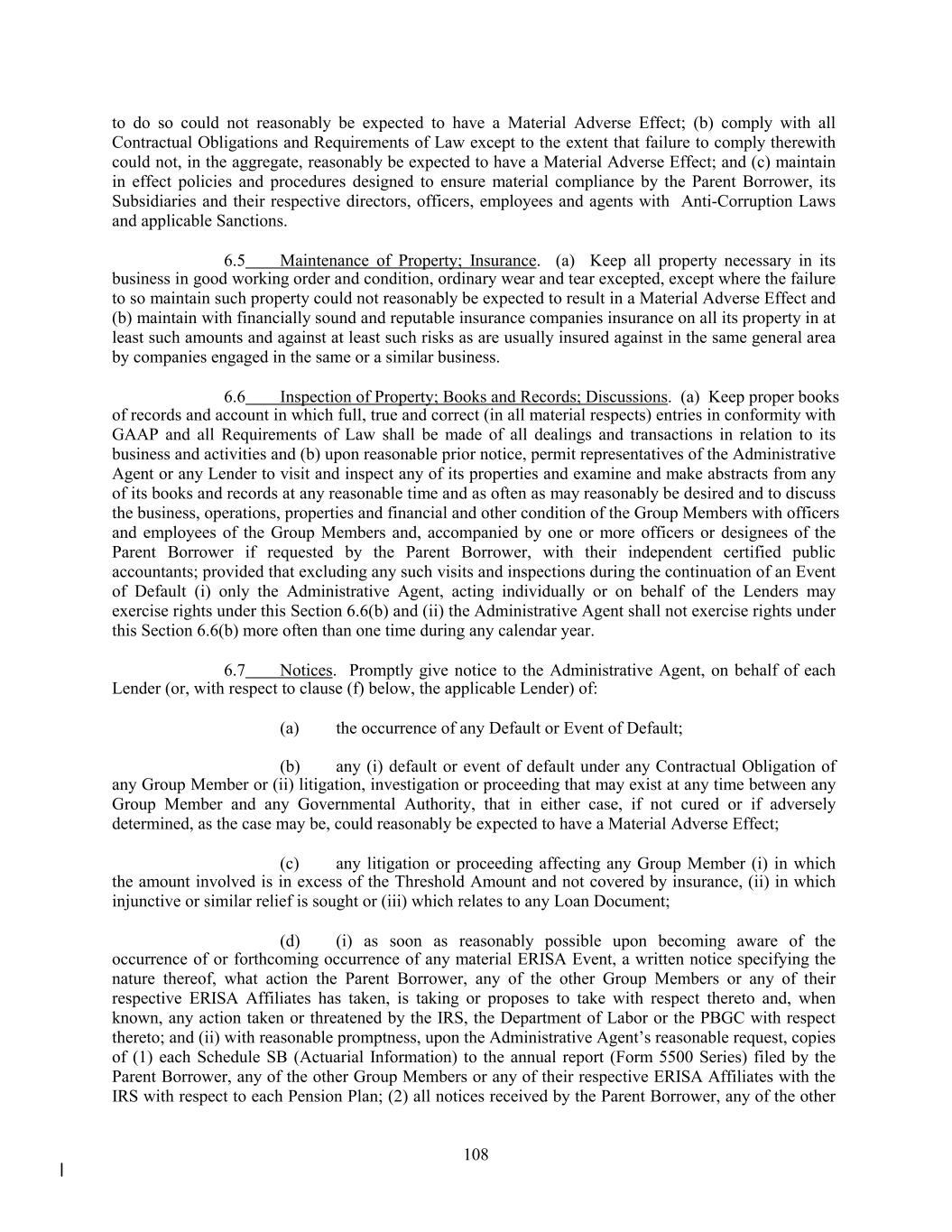 to do so could not reasonably be expected to have a Material Adverse Effect; (b) comply with all Contractual Obligations and Requirements of Law except to the extent that failure to comply therewith could not, in the aggregate, reasonably be expected to have a Material Adverse Effect; and (c) maintain in effect policies and procedures designed to ensure material compliance by the Parent Borrower, its Subsidiaries and their respective directors, officers, employees and agents with Anti-Corruption Laws and applicable Sanctions. 6.5 Maintenance of Property; Insurance. (a) Keep all property necessary in its business in good working order and condition, ordinary wear and tear excepted, except where the failure to so maintain such property could not reasonably be expected to result in a Material Adverse Effect and (b) maintain with financially sound and reputable insurance companies insurance on all its property in at least such amounts and against at least such risks as are usually insured against in the same general area by companies engaged in the same or a similar business. 6.6 Inspection of Property; Books and Records; Discussions. (a) Keep proper books of records and account in which full, true and correct (in all material respects) entries in conformity with GAAP and all Requirements of Law shall be made of all dealings and transactions in relation to its business and activities and (b) upon reasonable prior notice, permit representatives of the Administrative Agent or any Lender to visit and inspect any of its properties and examine and make abstracts from any of its books and records at any reasonable time and as often as may reasonably be desired and to discuss the business, operations, properties and financial and other condition of the Group Members with officers and employees of the Group Members and, accompanied by one or more officers or designees of the Parent Borrower if requested by the Parent Borrower, with their independent certified public accountants; provided that excluding any such visits and inspections during the continuation of an Event of Default (i) only the Administrative Agent, acting individually or on behalf of the Lenders may exercise rights under this Section 6.6(b) and (ii) the Administrative Agent shall not exercise rights under this Section 6.6(b) more often than one time during any calendar year. 6.7 Notices. Promptly give notice to the Administrative Agent, on behalf of each Lender (or, with respect to clause (f) below, the applicable Lender) of: (a) the occurrence of any Default or Event of Default; (b) any (i) default or event of default under any Contractual Obligation of any Group Member or (ii) litigation, investigation or proceeding that may exist at any time between any Group Member and any Governmental Authority, that in either case, if not cured or if adversely determined, as the case may be, could reasonably be expected to have a Material Adverse Effect; (c) any litigation or proceeding affecting any Group Member (i) in which the amount involved is in excess of the Threshold Amount and not covered by insurance, (ii) in which injunctive or similar relief is sought or (iii) which relates to any Loan Document; (d) (i) as soon as reasonably possible upon becoming aware of the occurrence of or forthcoming occurrence of any material ERISA Event, a written notice specifying the nature thereof, what action the Parent Borrower, any of the other Group Members or any of their respective ERISA Affiliates has taken, is taking or proposes to take with respect thereto and, when known, any action taken or threatened by the IRS, the Department of Labor or the PBGC with respect thereto; and (ii) with reasonable promptness, upon the Administrative Agent’s reasonable request, copies of (1) each Schedule SB (Actuarial Information) to the annual report (Form 5500 Series) filed by the Parent Borrower, any of the other Group Members or any of their respective ERISA Affiliates with the IRS with respect to each Pension Plan; (2) all notices received by the Parent Borrower, any of the other 108