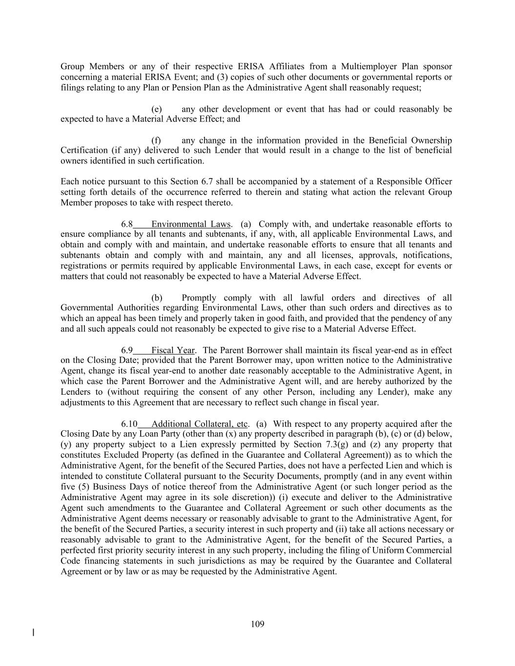 Group Members or any of their respective ERISA Affiliates from a Multiemployer Plan sponsor concerning a material ERISA Event; and (3) copies of such other documents or governmental reports or filings relating to any Plan or Pension Plan as the Administrative Agent shall reasonably request; (e) any other development or event that has had or could reasonably be expected to have a Material Adverse Effect; and (f) any change in the information provided in the Beneficial Ownership Certification (if any) delivered to such Lender that would result in a change to the list of beneficial owners identified in such certification. Each notice pursuant to this Section 6.7 shall be accompanied by a statement of a Responsible Officer setting forth details of the occurrence referred to therein and stating what action the relevant Group Member proposes to take with respect thereto. 6.8 Environmental Laws. (a) Comply with, and undertake reasonable efforts to ensure compliance by all tenants and subtenants, if any, with, all applicable Environmental Laws, and obtain and comply with and maintain, and undertake reasonable efforts to ensure that all tenants and subtenants obtain and comply with and maintain, any and all licenses, approvals, notifications, registrations or permits required by applicable Environmental Laws, in each case, except for events or matters that could not reasonably be expected to have a Material Adverse Effect. (b) Promptly comply with all lawful orders and directives of all Governmental Authorities regarding Environmental Laws, other than such orders and directives as to which an appeal has been timely and properly taken in good faith, and provided that the pendency of any and all such appeals could not reasonably be expected to give rise to a Material Adverse Effect. 6.9 Fiscal Year. The Parent Borrower shall maintain its fiscal year-end as in effect on the Closing Date; provided that the Parent Borrower may, upon written notice to the Administrative Agent, change its fiscal year-end to another date reasonably acceptable to the Administrative Agent, in which case the Parent Borrower and the Administrative Agent will, and are hereby authorized by the Lenders to (without requiring the consent of any other Person, including any Lender), make any adjustments to this Agreement that are necessary to reflect such change in fiscal year. 6.10 Additional Collateral, etc. (a) With respect to any property acquired after the Closing Date by any Loan Party (other than (x) any property described in paragraph (b), (c) or (d) below, (y) any property subject to a Lien expressly permitted by Section 7.3(g) and (z) any property that constitutes Excluded Property (as defined in the Guarantee and Collateral Agreement)) as to which the Administrative Agent, for the benefit of the Secured Parties, does not have a perfected Lien and which is intended to constitute Collateral pursuant to the Security Documents, promptly (and in any event within five (5) Business Days of notice thereof from the Administrative Agent (or such longer period as the Administrative Agent may agree in its sole discretion)) (i) execute and deliver to the Administrative Agent such amendments to the Guarantee and Collateral Agreement or such other documents as the Administrative Agent deems necessary or reasonably advisable to grant to the Administrative Agent, for the benefit of the Secured Parties, a security interest in such property and (ii) take all actions necessary or reasonably advisable to grant to the Administrative Agent, for the benefit of the Secured Parties, a perfected first priority security interest in any such property, including the filing of Uniform Commercial Code financing statements in such jurisdictions as may be required by the Guarantee and Collateral Agreement or by law or as may be requested by the Administrative Agent. 109