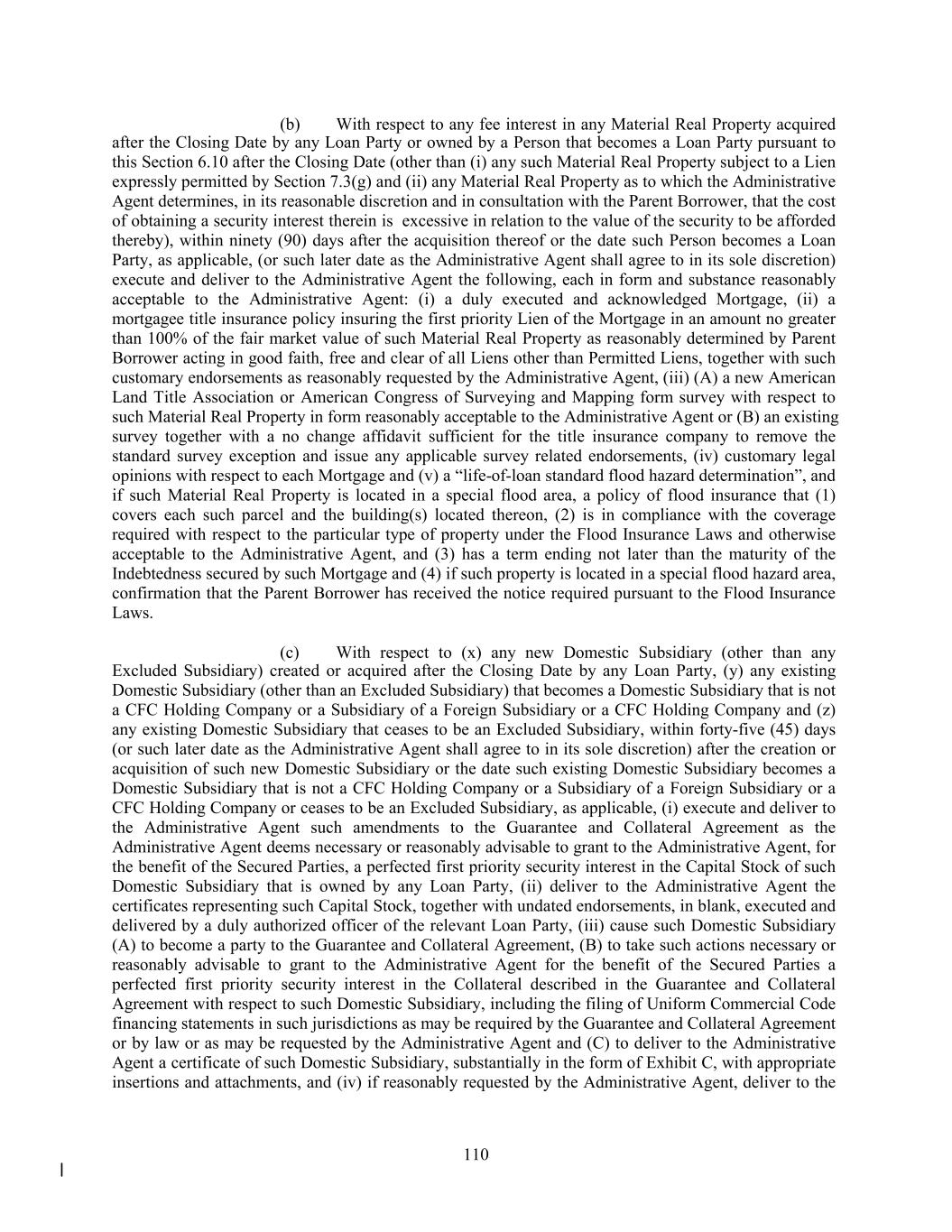 (b) With respect to any fee interest in any Material Real Property acquired after the Closing Date by any Loan Party or owned by a Person that becomes a Loan Party pursuant to this Section 6.10 after the Closing Date (other than (i) any such Material Real Property subject to a Lien expressly permitted by Section 7.3(g) and (ii) any Material Real Property as to which the Administrative Agent determines, in its reasonable discretion and in consultation with the Parent Borrower, that the cost of obtaining a security interest therein is excessive in relation to the value of the security to be afforded thereby), within ninety (90) days after the acquisition thereof or the date such Person becomes a Loan Party, as applicable, (or such later date as the Administrative Agent shall agree to in its sole discretion) execute and deliver to the Administrative Agent the following, each in form and substance reasonably acceptable to the Administrative Agent: (i) a duly executed and acknowledged Mortgage, (ii) a mortgagee title insurance policy insuring the first priority Lien of the Mortgage in an amount no greater than 100% of the fair market value of such Material Real Property as reasonably determined by Parent Borrower acting in good faith, free and clear of all Liens other than Permitted Liens, together with such customary endorsements as reasonably requested by the Administrative Agent, (iii) (A) a new American Land Title Association or American Congress of Surveying and Mapping form survey with respect to such Material Real Property in form reasonably acceptable to the Administrative Agent or (B) an existing survey together with a no change affidavit sufficient for the title insurance company to remove the standard survey exception and issue any applicable survey related endorsements, (iv) customary legal opinions with respect to each Mortgage and (v) a “life-of-loan standard flood hazard determination”, and if such Material Real Property is located in a special flood area, a policy of flood insurance that (1) covers each such parcel and the building(s) located thereon, (2) is in compliance with the coverage required with respect to the particular type of property under the Flood Insurance Laws and otherwise acceptable to the Administrative Agent, and (3) has a term ending not later than the maturity of the Indebtedness secured by such Mortgage and (4) if such property is located in a special flood hazard area, confirmation that the Parent Borrower has received the notice required pursuant to the Flood Insurance Laws. (c) With respect to (x) any new Domestic Subsidiary (other than any Excluded Subsidiary) created or acquired after the Closing Date by any Loan Party, (y) any existing Domestic Subsidiary (other than an Excluded Subsidiary) that becomes a Domestic Subsidiary that is not a CFC Holding Company or a Subsidiary of a Foreign Subsidiary or a CFC Holding Company and (z) any existing Domestic Subsidiary that ceases to be an Excluded Subsidiary, within forty-five (45) days (or such later date as the Administrative Agent shall agree to in its sole discretion) after the creation or acquisition of such new Domestic Subsidiary or the date such existing Domestic Subsidiary becomes a Domestic Subsidiary that is not a CFC Holding Company or a Subsidiary of a Foreign Subsidiary or a CFC Holding Company or ceases to be an Excluded Subsidiary, as applicable, (i) execute and deliver to the Administrative Agent such amendments to the Guarantee and Collateral Agreement as the Administrative Agent deems necessary or reasonably advisable to grant to the Administrative Agent, for the benefit of the Secured Parties, a perfected first priority security interest in the Capital Stock of such Domestic Subsidiary that is owned by any Loan Party, (ii) deliver to the Administrative Agent the certificates representing such Capital Stock, together with undated endorsements, in blank, executed and delivered by a duly authorized officer of the relevant Loan Party, (iii) cause such Domestic Subsidiary (A) to become a party to the Guarantee and Collateral Agreement, (B) to take such actions necessary or reasonably advisable to grant to the Administrative Agent for the benefit of the Secured Parties a perfected first priority security interest in the Collateral described in the Guarantee and Collateral Agreement with respect to such Domestic Subsidiary, including the filing of Uniform Commercial Code financing statements in such jurisdictions as may be required by the Guarantee and Collateral Agreement or by law or as may be requested by the Administrative Agent and (C) to deliver to the Administrative Agent a certificate of such Domestic Subsidiary, substantially in the form of Exhibit C, with appropriate insertions and attachments, and (iv) if reasonably requested by the Administrative Agent, deliver to the 110
