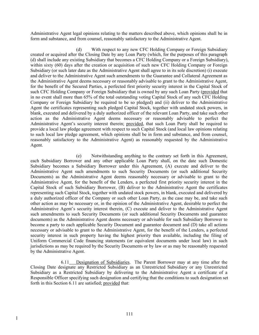 Administrative Agent legal opinions relating to the matters described above, which opinions shall be in form and substance, and from counsel, reasonably satisfactory to the Administrative Agent. (d) With respect to any new CFC Holding Company or Foreign Subsidiary created or acquired after the Closing Date by any Loan Party (which, for the purposes of this paragraph (d) shall include any existing Subsidiary that becomes a CFC Holding Company or a Foreign Subsidiary), within sixty (60) days after the creation or acquisition of such new CFC Holding Company or Foreign Subsidiary (or such later date as the Administrative Agent shall agree to in its sole discretion) (i) execute and deliver to the Administrative Agent such amendments to the Guarantee and Collateral Agreement as the Administrative Agent deems necessary or reasonably advisable to grant to the Administrative Agent, for the benefit of the Secured Parties, a perfected first priority security interest in the Capital Stock of such CFC Holding Company or Foreign Subsidiary that is owned by any such Loan Party (provided that in no event shall more than 65% of the total outstanding voting Capital Stock of any such CFC Holding Company or Foreign Subsidiary be required to be so pledged) and (ii) deliver to the Administrative Agent the certificates representing such pledged Capital Stock, together with undated stock powers, in blank, executed and delivered by a duly authorized officer of the relevant Loan Party, and take such other action as the Administrative Agent deems necessary or reasonably advisable to perfect the Administrative Agent’s security interest therein; provided, that such Loan Party shall be required to provide a local law pledge agreement with respect to such Capital Stock (and local law opinions relating to such local law pledge agreement, which opinions shall be in form and substance, and from counsel, reasonably satisfactory to the Administrative Agent) as reasonably requested by the Administrative Agent. (e) Notwithstanding anything to the contrary set forth in this Agreement, each Subsidiary Borrower and any other applicable Loan Party shall, on the date such Domestic Subsidiary becomes a Subsidiary Borrower under this Agreement, (A) execute and deliver to the Administrative Agent such amendments to such Security Documents (or such additional Security Documents) as the Administrative Agent deems reasonably necessary or advisable to grant to the Administrative Agent, for the benefit of the Lenders, a perfected first priority security interest in the Capital Stock of such Subsidiary Borrower, (B) deliver to the Administrative Agent the certificates representing such Capital Stock, together with undated stock powers, in blank, executed and delivered by a duly authorized officer of the Company or such other Loan Party, as the case may be, and take such other action as may be necessary or, in the opinion of the Administrative Agent, desirable to perfect the Administrative Agent’s security interest therein, (C) execute and deliver to the Administrative Agent such amendments to such Security Documents (or such additional Security Documents and guarantee documents) as the Administrative Agent deems necessary or advisable for such Subsidiary Borrower to become a party to each applicable Security Document and guarantee document and (D) take all actions necessary or advisable to grant to the Administrative Agent, for the benefit of the Lenders, a perfected security interest in such property having the highest priority then available, including the filing of Uniform Commercial Code financing statements (or equivalent documents under local law) in such jurisdictions as may be required by the Security Documents or by law or as may be reasonably requested by the Administrative Agent. 6.11 Designation of Subsidiaries. The Parent Borrower may at any time after the Closing Date designate any Restricted Subsidiary as an Unrestricted Subsidiary or any Unrestricted Subsidiary as a Restricted Subsidiary by delivering to the Administrative Agent a certificate of a Responsible Officer specifying such designation and certifying that the conditions to such designation set forth in this Section 6.11 are satisfied; provided that: 111