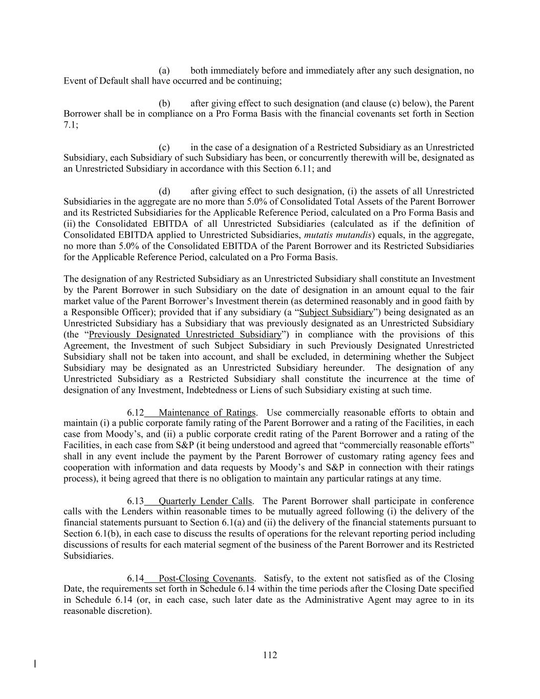 (a) both immediately before and immediately after any such designation, no Event of Default shall have occurred and be continuing; (b) after giving effect to such designation (and clause (c) below), the Parent Borrower shall be in compliance on a Pro Forma Basis with the financial covenants set forth in Section 7.1; (c) in the case of a designation of a Restricted Subsidiary as an Unrestricted Subsidiary, each Subsidiary of such Subsidiary has been, or concurrently therewith will be, designated as an Unrestricted Subsidiary in accordance with this Section 6.11; and (d) after giving effect to such designation, (i) the assets of all Unrestricted Subsidiaries in the aggregate are no more than 5.0% of Consolidated Total Assets of the Parent Borrower and its Restricted Subsidiaries for the Applicable Reference Period, calculated on a Pro Forma Basis and (ii) the Consolidated EBITDA of all Unrestricted Subsidiaries (calculated as if the definition of Consolidated EBITDA applied to Unrestricted Subsidiaries, mutatis mutandis) equals, in the aggregate, no more than 5.0% of the Consolidated EBITDA of the Parent Borrower and its Restricted Subsidiaries for the Applicable Reference Period, calculated on a Pro Forma Basis. The designation of any Restricted Subsidiary as an Unrestricted Subsidiary shall constitute an Investment by the Parent Borrower in such Subsidiary on the date of designation in an amount equal to the fair market value of the Parent Borrower’s Investment therein (as determined reasonably and in good faith by a Responsible Officer); provided that if any subsidiary (a “Subject Subsidiary”) being designated as an Unrestricted Subsidiary has a Subsidiary that was previously designated as an Unrestricted Subsidiary (the “Previously Designated Unrestricted Subsidiary”) in compliance with the provisions of this Agreement, the Investment of such Subject Subsidiary in such Previously Designated Unrestricted Subsidiary shall not be taken into account, and shall be excluded, in determining whether the Subject Subsidiary may be designated as an Unrestricted Subsidiary hereunder. The designation of any Unrestricted Subsidiary as a Restricted Subsidiary shall constitute the incurrence at the time of designation of any Investment, Indebtedness or Liens of such Subsidiary existing at such time. 6.12 Maintenance of Ratings. Use commercially reasonable efforts to obtain and maintain (i) a public corporate family rating of the Parent Borrower and a rating of the Facilities, in each case from Moody’s, and (ii) a public corporate credit rating of the Parent Borrower and a rating of the Facilities, in each case from S&P (it being understood and agreed that “commercially reasonable efforts” shall in any event include the payment by the Parent Borrower of customary rating agency fees and cooperation with information and data requests by Moody’s and S&P in connection with their ratings process), it being agreed that there is no obligation to maintain any particular ratings at any time. 6.13 Quarterly Lender Calls. The Parent Borrower shall participate in conference calls with the Lenders within reasonable times to be mutually agreed following (i) the delivery of the financial statements pursuant to Section 6.1(a) and (ii) the delivery of the financial statements pursuant to Section 6.1(b), in each case to discuss the results of operations for the relevant reporting period including discussions of results for each material segment of the business of the Parent Borrower and its Restricted Subsidiaries. 6.14 Post-Closing Covenants. Satisfy, to the extent not satisfied as of the Closing Date, the requirements set forth in Schedule 6.14 within the time periods after the Closing Date specified in Schedule 6.14 (or, in each case, such later date as the Administrative Agent may agree to in its reasonable discretion). 112
