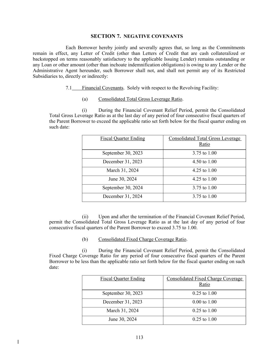 113 3.75 to 1.00 December 31, 2023 Consolidated Total Gross Leverage Ratio December 31, 2024 4.50 to 1.00 3.75 to 1.00 SECTION 7. NEGATIVE COVENANTS Each Borrower hereby jointly and severally agrees that, so long as the Commitments remain in effect, any Letter of Credit (other than Letters of Credit that are cash collateralized or backstopped on terms reasonably satisfactory to the applicable Issuing Lender) remains outstanding or any Loan or other amount (other than inchoate indemnification obligations) is owing to any Lender or the Administrative Agent hereunder, such Borrower shall not, and shall not permit any of its Restricted Subsidiaries to, directly or indirectly: 7.1 Financial Covenants. Solely with respect to the Revolving Facility: (a) Consolidated Total Gross Leverage Ratio. (i) During the Financial Covenant Relief Period, permit the Consolidated Total Gross Leverage Ratio as at the last day of any period of four consecutive fiscal quarters of the Parent Borrower to exceed the applicable ratio set forth below for the fiscal quarter ending on such date: (ii) Upon and after the termination of the Financial Covenant Relief Period, permit the Consolidated Total Gross Leverage Ratio as at the last day of any period of four consecutive fiscal quarters of the Parent Borrower to exceed 3.75 to 1.00. (b) Consolidated Fixed Charge Coverage Ratio. (i) During the Financial Covenant Relief Period, permit the Consolidated Fixed Charge Coverage Ratio for any period of four consecutive fiscal quarters of the Parent Borrower to be less than the applicable ratio set forth below for the fiscal quarter ending on such date: Fiscal Quarter Ending Consolidated Fixed Charge Coverage Ratio March 31, 2024 September 30, 2023 4.25 to 1.00 0.25 to 1.00 September 30, 2023 December 31, 2023 0.00 to 1.00 June 30, 2024 3.75 to 1.00 March 31, 2024 4.25 to 1.00 0.25 to 1.00 Fiscal Quarter Ending June 30, 2024 0.25 to 1.00 September 30, 2024