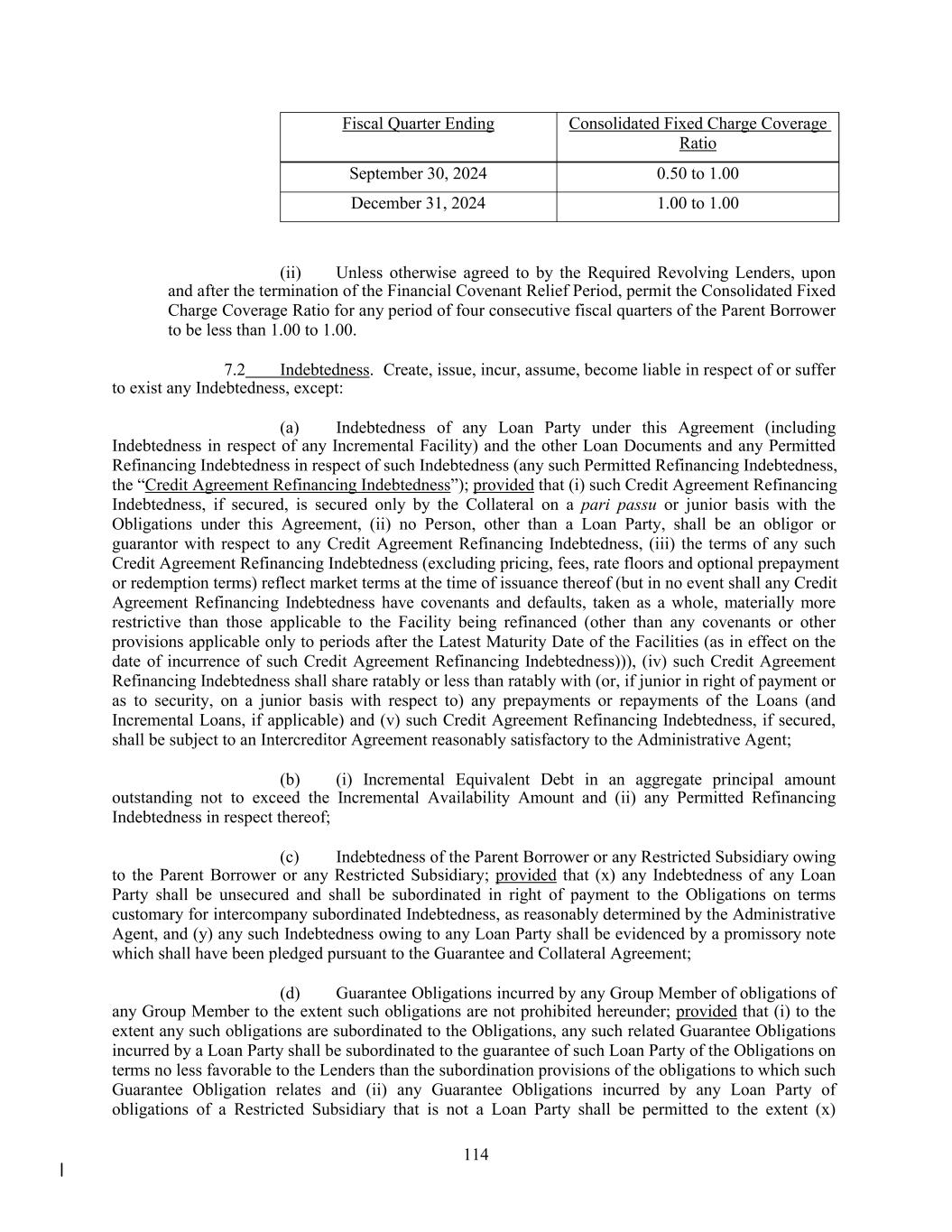 114 September 30, 2024 Fiscal Quarter Ending 0.50 to 1.00 Consolidated Fixed Charge Coverage Ratio December 31, 2024 1.00 to 1.00 (ii) Unless otherwise agreed to by the Required Revolving Lenders, upon and after the termination of the Financial Covenant Relief Period, permit the Consolidated Fixed Charge Coverage Ratio for any period of four consecutive fiscal quarters of the Parent Borrower to be less than 1.00 to 1.00. 7.2 Indebtedness. Create, issue, incur, assume, become liable in respect of or suffer to exist any Indebtedness, except: (a) Indebtedness of any Loan Party under this Agreement (including Indebtedness in respect of any Incremental Facility) and the other Loan Documents and any Permitted Refinancing Indebtedness in respect of such Indebtedness (any such Permitted Refinancing Indebtedness, the “Credit Agreement Refinancing Indebtedness”); provided that (i) such Credit Agreement Refinancing Indebtedness, if secured, is secured only by the Collateral on a pari passu or junior basis with the Obligations under this Agreement, (ii) no Person, other than a Loan Party, shall be an obligor or guarantor with respect to any Credit Agreement Refinancing Indebtedness, (iii) the terms of any such Credit Agreement Refinancing Indebtedness (excluding pricing, fees, rate floors and optional prepayment or redemption terms) reflect market terms at the time of issuance thereof (but in no event shall any Credit Agreement Refinancing Indebtedness have covenants and defaults, taken as a whole, materially more restrictive than those applicable to the Facility being refinanced (other than any covenants or other provisions applicable only to periods after the Latest Maturity Date of the Facilities (as in effect on the date of incurrence of such Credit Agreement Refinancing Indebtedness))), (iv) such Credit Agreement Refinancing Indebtedness shall share ratably or less than ratably with (or, if junior in right of payment or as to security, on a junior basis with respect to) any prepayments or repayments of the Loans (and Incremental Loans, if applicable) and (v) such Credit Agreement Refinancing Indebtedness, if secured, shall be subject to an Intercreditor Agreement reasonably satisfactory to the Administrative Agent; (b) (i) Incremental Equivalent Debt in an aggregate principal amount outstanding not to exceed the Incremental Availability Amount and (ii) any Permitted Refinancing Indebtedness in respect thereof; (c) Indebtedness of the Parent Borrower or any Restricted Subsidiary owing to the Parent Borrower or any Restricted Subsidiary; provided that (x) any Indebtedness of any Loan Party shall be unsecured and shall be subordinated in right of payment to the Obligations on terms customary for intercompany subordinated Indebtedness, as reasonably determined by the Administrative Agent, and (y) any such Indebtedness owing to any Loan Party shall be evidenced by a promissory note which shall have been pledged pursuant to the Guarantee and Collateral Agreement; (d) Guarantee Obligations incurred by any Group Member of obligations of any Group Member to the extent such obligations are not prohibited hereunder; provided that (i) to the extent any such obligations are subordinated to the Obligations, any such related Guarantee Obligations incurred by a Loan Party shall be subordinated to the guarantee of such Loan Party of the Obligations on terms no less favorable to the Lenders than the subordination provisions of the obligations to which such Guarantee Obligation relates and (ii) any Guarantee Obligations incurred by any Loan Party of obligations of a Restricted Subsidiary that is not a Loan Party shall be permitted to the extent (x)