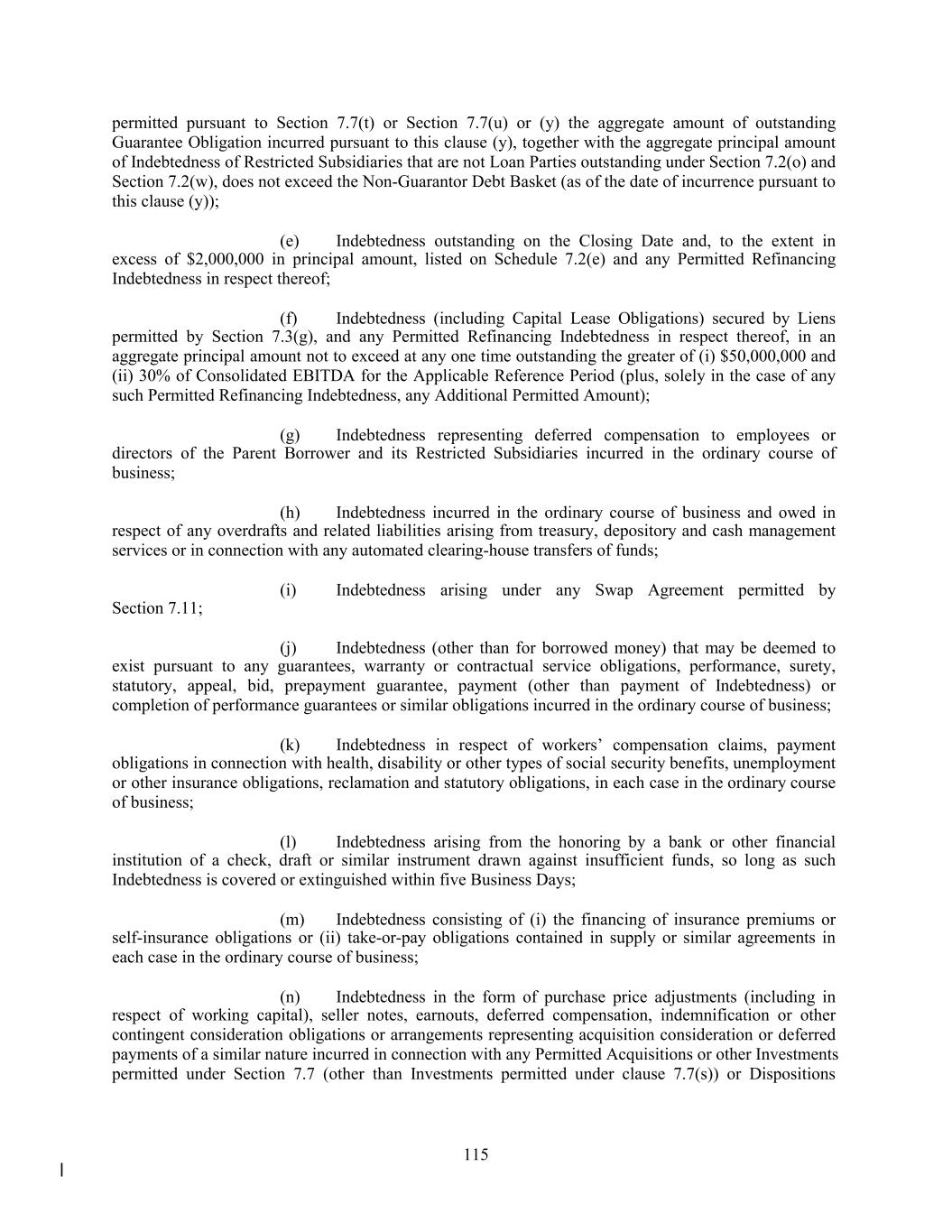 permitted pursuant to Section 7.7(t) or Section 7.7(u) or (y) the aggregate amount of outstanding Guarantee Obligation incurred pursuant to this clause (y), together with the aggregate principal amount of Indebtedness of Restricted Subsidiaries that are not Loan Parties outstanding under Section 7.2(o) and Section 7.2(w), does not exceed the Non-Guarantor Debt Basket (as of the date of incurrence pursuant to this clause (y)); (e) Indebtedness outstanding on the Closing Date and, to the extent in excess of $2,000,000 in principal amount, listed on Schedule 7.2(e) and any Permitted Refinancing Indebtedness in respect thereof; (f) Indebtedness (including Capital Lease Obligations) secured by Liens permitted by Section 7.3(g), and any Permitted Refinancing Indebtedness in respect thereof, in an aggregate principal amount not to exceed at any one time outstanding the greater of (i) $50,000,000 and (ii) 30% of Consolidated EBITDA for the Applicable Reference Period (plus, solely in the case of any such Permitted Refinancing Indebtedness, any Additional Permitted Amount); (g) Indebtedness representing deferred compensation to employees or directors of the Parent Borrower and its Restricted Subsidiaries incurred in the ordinary course of business; (h) Indebtedness incurred in the ordinary course of business and owed in respect of any overdrafts and related liabilities arising from treasury, depository and cash management services or in connection with any automated clearing-house transfers of funds; (i) Indebtedness arising under any Swap Agreement permitted by Section 7.11; (j) Indebtedness (other than for borrowed money) that may be deemed to exist pursuant to any guarantees, warranty or contractual service obligations, performance, surety, statutory, appeal, bid, prepayment guarantee, payment (other than payment of Indebtedness) or completion of performance guarantees or similar obligations incurred in the ordinary course of business; (k) Indebtedness in respect of workers’ compensation claims, payment obligations in connection with health, disability or other types of social security benefits, unemployment or other insurance obligations, reclamation and statutory obligations, in each case in the ordinary course of business; (l) Indebtedness arising from the honoring by a bank or other financial institution of a check, draft or similar instrument drawn against insufficient funds, so long as such Indebtedness is covered or extinguished within five Business Days; (m) Indebtedness consisting of (i) the financing of insurance premiums or self-insurance obligations or (ii) take-or-pay obligations contained in supply or similar agreements in each case in the ordinary course of business; (n) Indebtedness in the form of purchase price adjustments (including in respect of working capital), seller notes, earnouts, deferred compensation, indemnification or other contingent consideration obligations or arrangements representing acquisition consideration or deferred payments of a similar nature incurred in connection with any Permitted Acquisitions or other Investments permitted under Section 7.7 (other than Investments permitted under clause 7.7(s)) or Dispositions 115