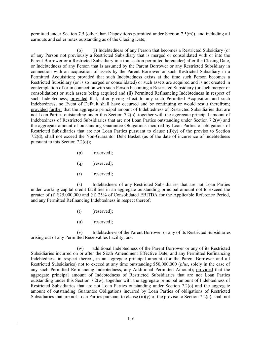 permitted under Section 7.5 (other than Dispositions permitted under Section 7.5(m)), and including all earnouts and seller notes outstanding as of the Closing Date; (o) (i) Indebtedness of any Person that becomes a Restricted Subsidiary (or of any Person not previously a Restricted Subsidiary that is merged or consolidated with or into the Parent Borrower or a Restricted Subsidiary in a transaction permitted hereunder) after the Closing Date, or Indebtedness of any Person that is assumed by the Parent Borrower or any Restricted Subsidiary in connection with an acquisition of assets by the Parent Borrower or such Restricted Subsidiary in a Permitted Acquisition; provided that such Indebtedness exists at the time such Person becomes a Restricted Subsidiary (or is so merged or consolidated) or such assets are acquired and is not created in contemplation of or in connection with such Person becoming a Restricted Subsidiary (or such merger or consolidation) or such assets being acquired and (ii) Permitted Refinancing Indebtedness in respect of such Indebtedness; provided that, after giving effect to any such Permitted Acquisition and such Indebtedness, no Event of Default shall have occurred and be continuing or would result therefrom; provided further that the aggregate principal amount of Indebtedness of Restricted Subsidiaries that are not Loan Parties outstanding under this Section 7.2(o), together with the aggregate principal amount of Indebtedness of Restricted Subsidiaries that are not Loan Parties outstanding under Section 7.2(w) and the aggregate amount of outstanding Guarantee Obligations incurred by Loan Parties of obligations of Restricted Subsidiaries that are not Loan Parties pursuant to clause (ii)(y) of the proviso to Section 7.2(d), shall not exceed the Non-Guarantor Debt Basket (as of the date of incurrence of Indebtedness pursuant to this Section 7.2(o)); (p) [reserved]; (q) [reserved]; (r) [reserved]; (s) Indebtedness of any Restricted Subsidiaries that are not Loan Parties under working capital credit facilities in an aggregate outstanding principal amount not to exceed the greater of (i) $25,000,000 and (ii) 25% of Consolidated EBITDA for the Applicable Reference Period, and any Permitted Refinancing Indebtedness in respect thereof; (t) [reserved]; (u) [reserved]; (v) Indebtedness of the Parent Borrower or any of its Restricted Subsidiaries arising out of any Permitted Receivables Facility; and (w) additional Indebtedness of the Parent Borrower or any of its Restricted Subsidiaries incurred on or after the Sixth Amendment Effective Date, and any Permitted Refinancing Indebtedness in respect thereof, in an aggregate principal amount (for the Parent Borrower and all Restricted Subsidiaries) not to exceed at any time outstanding $50,000,000 (plus, solely in the case of any such Permitted Refinancing Indebtedness, any Additional Permitted Amount); provided that the aggregate principal amount of Indebtedness of Restricted Subsidiaries that are not Loan Parties outstanding under this Section 7.2(w), together with the aggregate principal amount of Indebtedness of Restricted Subsidiaries that are not Loan Parties outstanding under Section 7.2(o) and the aggregate amount of outstanding Guarantee Obligations incurred by Loan Parties of obligations of Restricted Subsidiaries that are not Loan Parties pursuant to clause (ii)(y) of the proviso to Section 7.2(d), shall not 116