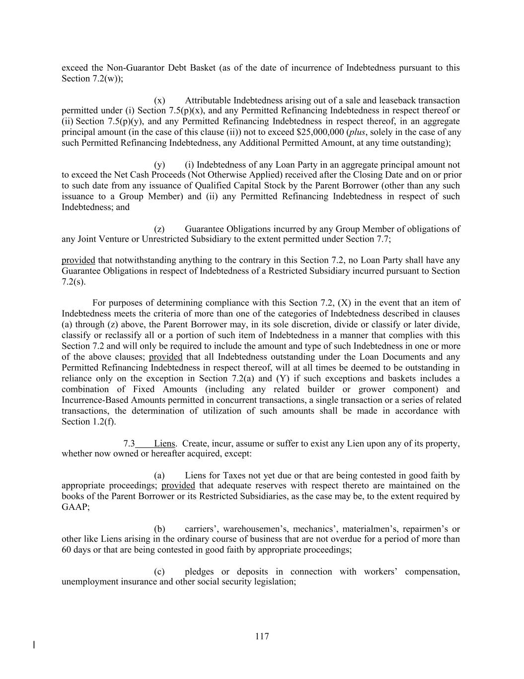 exceed the Non-Guarantor Debt Basket (as of the date of incurrence of Indebtedness pursuant to this Section 7.2(w)); (x) Attributable Indebtedness arising out of a sale and leaseback transaction permitted under (i) Section 7.5(p)(x), and any Permitted Refinancing Indebtedness in respect thereof or (ii) Section 7.5(p)(y), and any Permitted Refinancing Indebtedness in respect thereof, in an aggregate principal amount (in the case of this clause (ii)) not to exceed $25,000,000 (plus, solely in the case of any such Permitted Refinancing Indebtedness, any Additional Permitted Amount, at any time outstanding); (y) (i) Indebtedness of any Loan Party in an aggregate principal amount not to exceed the Net Cash Proceeds (Not Otherwise Applied) received after the Closing Date and on or prior to such date from any issuance of Qualified Capital Stock by the Parent Borrower (other than any such issuance to a Group Member) and (ii) any Permitted Refinancing Indebtedness in respect of such Indebtedness; and (z) Guarantee Obligations incurred by any Group Member of obligations of any Joint Venture or Unrestricted Subsidiary to the extent permitted under Section 7.7; provided that notwithstanding anything to the contrary in this Section 7.2, no Loan Party shall have any Guarantee Obligations in respect of Indebtedness of a Restricted Subsidiary incurred pursuant to Section 7.2(s). For purposes of determining compliance with this Section 7.2, (X) in the event that an item of Indebtedness meets the criteria of more than one of the categories of Indebtedness described in clauses (a) through (z) above, the Parent Borrower may, in its sole discretion, divide or classify or later divide, classify or reclassify all or a portion of such item of Indebtedness in a manner that complies with this Section 7.2 and will only be required to include the amount and type of such Indebtedness in one or more of the above clauses; provided that all Indebtedness outstanding under the Loan Documents and any Permitted Refinancing Indebtedness in respect thereof, will at all times be deemed to be outstanding in reliance only on the exception in Section 7.2(a) and (Y) if such exceptions and baskets includes a combination of Fixed Amounts (including any related builder or grower component) and Incurrence-Based Amounts permitted in concurrent transactions, a single transaction or a series of related transactions, the determination of utilization of such amounts shall be made in accordance with Section 1.2(f). 7.3 Liens. Create, incur, assume or suffer to exist any Lien upon any of its property, whether now owned or hereafter acquired, except: (a) Liens for Taxes not yet due or that are being contested in good faith by appropriate proceedings; provided that adequate reserves with respect thereto are maintained on the books of the Parent Borrower or its Restricted Subsidiaries, as the case may be, to the extent required by GAAP; (b) carriers’, warehousemen’s, mechanics’, materialmen’s, repairmen’s or other like Liens arising in the ordinary course of business that are not overdue for a period of more than 60 days or that are being contested in good faith by appropriate proceedings; (c) pledges or deposits in connection with workers’ compensation, unemployment insurance and other social security legislation; 117
