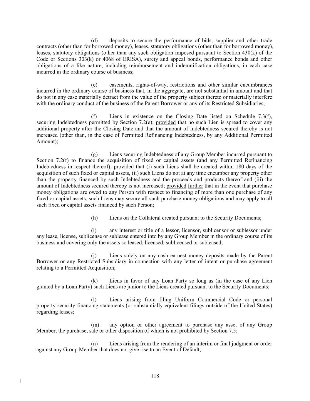 (d) deposits to secure the performance of bids, supplier and other trade contracts (other than for borrowed money), leases, statutory obligations (other than for borrowed money), leases, statutory obligations (other than any such obligation imposed pursuant to Section 430(k) of the Code or Sections 303(k) or 4068 of ERISA), surety and appeal bonds, performance bonds and other obligations of a like nature, including reimbursement and indemnification obligations, in each case incurred in the ordinary course of business; (e) easements, rights-of-way, restrictions and other similar encumbrances incurred in the ordinary course of business that, in the aggregate, are not substantial in amount and that do not in any case materially detract from the value of the property subject thereto or materially interfere with the ordinary conduct of the business of the Parent Borrower or any of its Restricted Subsidiaries; (f) Liens in existence on the Closing Date listed on Schedule 7.3(f), securing Indebtedness permitted by Section 7.2(e); provided that no such Lien is spread to cover any additional property after the Closing Date and that the amount of Indebtedness secured thereby is not increased (other than, in the case of Permitted Refinancing Indebtedness, by any Additional Permitted Amount); (g) Liens securing Indebtedness of any Group Member incurred pursuant to Section 7.2(f) to finance the acquisition of fixed or capital assets (and any Permitted Refinancing Indebtedness in respect thereof); provided that (i) such Liens shall be created within 180 days of the acquisition of such fixed or capital assets, (ii) such Liens do not at any time encumber any property other than the property financed by such Indebtedness and the proceeds and products thereof and (iii) the amount of Indebtedness secured thereby is not increased; provided further that in the event that purchase money obligations are owed to any Person with respect to financing of more than one purchase of any fixed or capital assets, such Liens may secure all such purchase money obligations and may apply to all such fixed or capital assets financed by such Person; (h) Liens on the Collateral created pursuant to the Security Documents; (i) any interest or title of a lessor, licensor, sublicensor or sublessor under any lease, license, sublicense or sublease entered into by any Group Member in the ordinary course of its business and covering only the assets so leased, licensed, sublicensed or subleased; (j) Liens solely on any cash earnest money deposits made by the Parent Borrower or any Restricted Subsidiary in connection with any letter of intent or purchase agreement relating to a Permitted Acquisition; (k) Liens in favor of any Loan Party so long as (in the case of any Lien granted by a Loan Party) such Liens are junior to the Liens created pursuant to the Security Documents; (l) Liens arising from filing Uniform Commercial Code or personal property security financing statements (or substantially equivalent filings outside of the United States) regarding leases; (m) any option or other agreement to purchase any asset of any Group Member, the purchase, sale or other disposition of which is not prohibited by Section 7.5; (n) Liens arising from the rendering of an interim or final judgment or order against any Group Member that does not give rise to an Event of Default; 118
