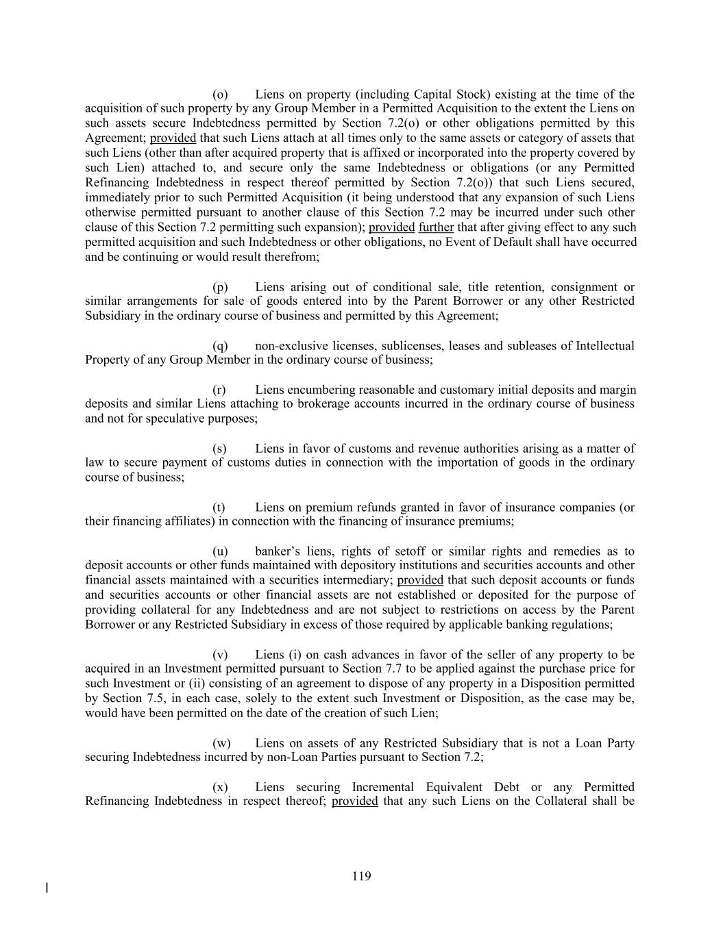 (o) Liens on property (including Capital Stock) existing at the time of the acquisition of such property by any Group Member in a Permitted Acquisition to the extent the Liens on such assets secure Indebtedness permitted by Section 7.2(o) or other obligations permitted by this Agreement; provided that such Liens attach at all times only to the same assets or category of assets that such Liens (other than after acquired property that is affixed or incorporated into the property covered by such Lien) attached to, and secure only the same Indebtedness or obligations (or any Permitted Refinancing Indebtedness in respect thereof permitted by Section 7.2(o)) that such Liens secured, immediately prior to such Permitted Acquisition (it being understood that any expansion of such Liens otherwise permitted pursuant to another clause of this Section 7.2 may be incurred under such other clause of this Section 7.2 permitting such expansion); provided further that after giving effect to any such permitted acquisition and such Indebtedness or other obligations, no Event of Default shall have occurred and be continuing or would result therefrom; (p) Liens arising out of conditional sale, title retention, consignment or similar arrangements for sale of goods entered into by the Parent Borrower or any other Restricted Subsidiary in the ordinary course of business and permitted by this Agreement; (q) non-exclusive licenses, sublicenses, leases and subleases of Intellectual Property of any Group Member in the ordinary course of business; (r) Liens encumbering reasonable and customary initial deposits and margin deposits and similar Liens attaching to brokerage accounts incurred in the ordinary course of business and not for speculative purposes; (s) Liens in favor of customs and revenue authorities arising as a matter of law to secure payment of customs duties in connection with the importation of goods in the ordinary course of business; (t) Liens on premium refunds granted in favor of insurance companies (or their financing affiliates) in connection with the financing of insurance premiums; (u) banker’s liens, rights of setoff or similar rights and remedies as to deposit accounts or other funds maintained with depository institutions and securities accounts and other financial assets maintained with a securities intermediary; provided that such deposit accounts or funds and securities accounts or other financial assets are not established or deposited for the purpose of providing collateral for any Indebtedness and are not subject to restrictions on access by the Parent Borrower or any Restricted Subsidiary in excess of those required by applicable banking regulations; (v) Liens (i) on cash advances in favor of the seller of any property to be acquired in an Investment permitted pursuant to Section 7.7 to be applied against the purchase price for such Investment or (ii) consisting of an agreement to dispose of any property in a Disposition permitted by Section 7.5, in each case, solely to the extent such Investment or Disposition, as the case may be, would have been permitted on the date of the creation of such Lien; (w) Liens on assets of any Restricted Subsidiary that is not a Loan Party securing Indebtedness incurred by non-Loan Parties pursuant to Section 7.2; (x) Liens securing Incremental Equivalent Debt or any Permitted Refinancing Indebtedness in respect thereof; provided that any such Liens on the Collateral shall be 119