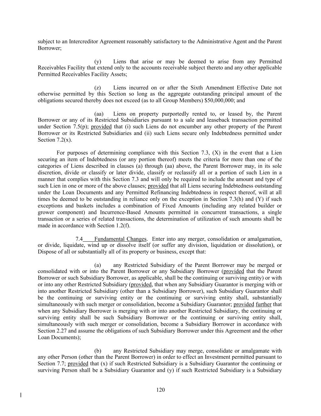 subject to an Intercreditor Agreement reasonably satisfactory to the Administrative Agent and the Parent Borrower; (y) Liens that arise or may be deemed to arise from any Permitted Receivables Facility that extend only to the accounts receivable subject thereto and any other applicable Permitted Receivables Facility Assets; (z) Liens incurred on or after the Sixth Amendment Effective Date not otherwise permitted by this Section so long as the aggregate outstanding principal amount of the obligations secured thereby does not exceed (as to all Group Members) $50,000,000; and (aa) Liens on property purportedly rented to, or leased by, the Parent Borrower or any of its Restricted Subsidiaries pursuant to a sale and leaseback transaction permitted under Section 7.5(p); provided that (i) such Liens do not encumber any other property of the Parent Borrower or its Restricted Subsidiaries and (ii) such Liens secure only Indebtedness permitted under Section 7.2(x). For purposes of determining compliance with this Section 7.3, (X) in the event that a Lien securing an item of Indebtedness (or any portion thereof) meets the criteria for more than one of the categories of Liens described in clauses (a) through (aa) above, the Parent Borrower may, in its sole discretion, divide or classify or later divide, classify or reclassify all or a portion of such Lien in a manner that complies with this Section 7.3 and will only be required to include the amount and type of such Lien in one or more of the above clauses; provided that all Liens securing Indebtedness outstanding under the Loan Documents and any Permitted Refinancing Indebtedness in respect thereof, will at all times be deemed to be outstanding in reliance only on the exception in Section 7.3(h) and (Y) if such exceptions and baskets includes a combination of Fixed Amounts (including any related builder or grower component) and Incurrence-Based Amounts permitted in concurrent transactions, a single transaction or a series of related transactions, the determination of utilization of such amounts shall be made in accordance with Section 1.2(f). 7.4 Fundamental Changes. Enter into any merger, consolidation or amalgamation, or divide, liquidate, wind up or dissolve itself (or suffer any division, liquidation or dissolution), or Dispose of all or substantially all of its property or business, except that: (a) any Restricted Subsidiary of the Parent Borrower may be merged or consolidated with or into the Parent Borrower or any Subsidiary Borrower (provided that the Parent Borrower or such Subsidiary Borrower, as applicable, shall be the continuing or surviving entity) or with or into any other Restricted Subsidiary (provided, that when any Subsidiary Guarantor is merging with or into another Restricted Subsidiary (other than a Subsidiary Borrower), such Subsidiary Guarantor shall be the continuing or surviving entity or the continuing or surviving entity shall, substantially simultaneously with such merger or consolidation, become a Subsidiary Guarantor; provided further that when any Subsidiary Borrower is merging with or into another Restricted Subsidiary, the continuing or surviving entity shall be such Subsidiary Borrower or the continuing or surviving entity shall, simultaneously with such merger or consolidation, become a Subsidiary Borrower in accordance with Section 2.27 and assume the obligations of such Subsidiary Borrower under this Agreement and the other Loan Documents); (b) any Restricted Subsidiary may merge, consolidate or amalgamate with any other Person (other than the Parent Borrower) in order to effect an Investment permitted pursuant to Section 7.7; provided that (x) if such Restricted Subsidiary is a Subsidiary Guarantor the continuing or surviving Person shall be a Subsidiary Guarantor and (y) if such Restricted Subsidiary is a Subsidiary 120