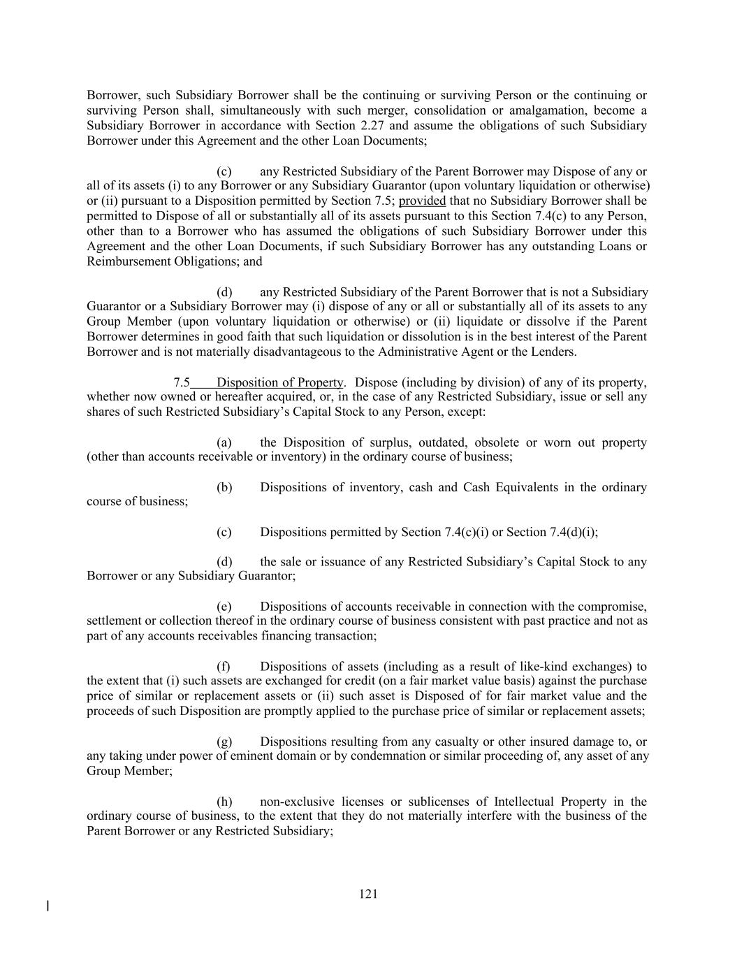 Borrower, such Subsidiary Borrower shall be the continuing or surviving Person or the continuing or surviving Person shall, simultaneously with such merger, consolidation or amalgamation, become a Subsidiary Borrower in accordance with Section 2.27 and assume the obligations of such Subsidiary Borrower under this Agreement and the other Loan Documents; (c) any Restricted Subsidiary of the Parent Borrower may Dispose of any or all of its assets (i) to any Borrower or any Subsidiary Guarantor (upon voluntary liquidation or otherwise) or (ii) pursuant to a Disposition permitted by Section 7.5; provided that no Subsidiary Borrower shall be permitted to Dispose of all or substantially all of its assets pursuant to this Section 7.4(c) to any Person, other than to a Borrower who has assumed the obligations of such Subsidiary Borrower under this Agreement and the other Loan Documents, if such Subsidiary Borrower has any outstanding Loans or Reimbursement Obligations; and (d) any Restricted Subsidiary of the Parent Borrower that is not a Subsidiary Guarantor or a Subsidiary Borrower may (i) dispose of any or all or substantially all of its assets to any Group Member (upon voluntary liquidation or otherwise) or (ii) liquidate or dissolve if the Parent Borrower determines in good faith that such liquidation or dissolution is in the best interest of the Parent Borrower and is not materially disadvantageous to the Administrative Agent or the Lenders. 7.5 Disposition of Property. Dispose (including by division) of any of its property, whether now owned or hereafter acquired, or, in the case of any Restricted Subsidiary, issue or sell any shares of such Restricted Subsidiary’s Capital Stock to any Person, except: (a) the Disposition of surplus, outdated, obsolete or worn out property (other than accounts receivable or inventory) in the ordinary course of business; (b) Dispositions of inventory, cash and Cash Equivalents in the ordinary course of business; (c) Dispositions permitted by Section 7.4(c)(i) or Section 7.4(d)(i); (d) the sale or issuance of any Restricted Subsidiary’s Capital Stock to any Borrower or any Subsidiary Guarantor; (e) Dispositions of accounts receivable in connection with the compromise, settlement or collection thereof in the ordinary course of business consistent with past practice and not as part of any accounts receivables financing transaction; (f) Dispositions of assets (including as a result of like-kind exchanges) to the extent that (i) such assets are exchanged for credit (on a fair market value basis) against the purchase price of similar or replacement assets or (ii) such asset is Disposed of for fair market value and the proceeds of such Disposition are promptly applied to the purchase price of similar or replacement assets; (g) Dispositions resulting from any casualty or other insured damage to, or any taking under power of eminent domain or by condemnation or similar proceeding of, any asset of any Group Member; (h) non-exclusive licenses or sublicenses of Intellectual Property in the ordinary course of business, to the extent that they do not materially interfere with the business of the Parent Borrower or any Restricted Subsidiary; 121