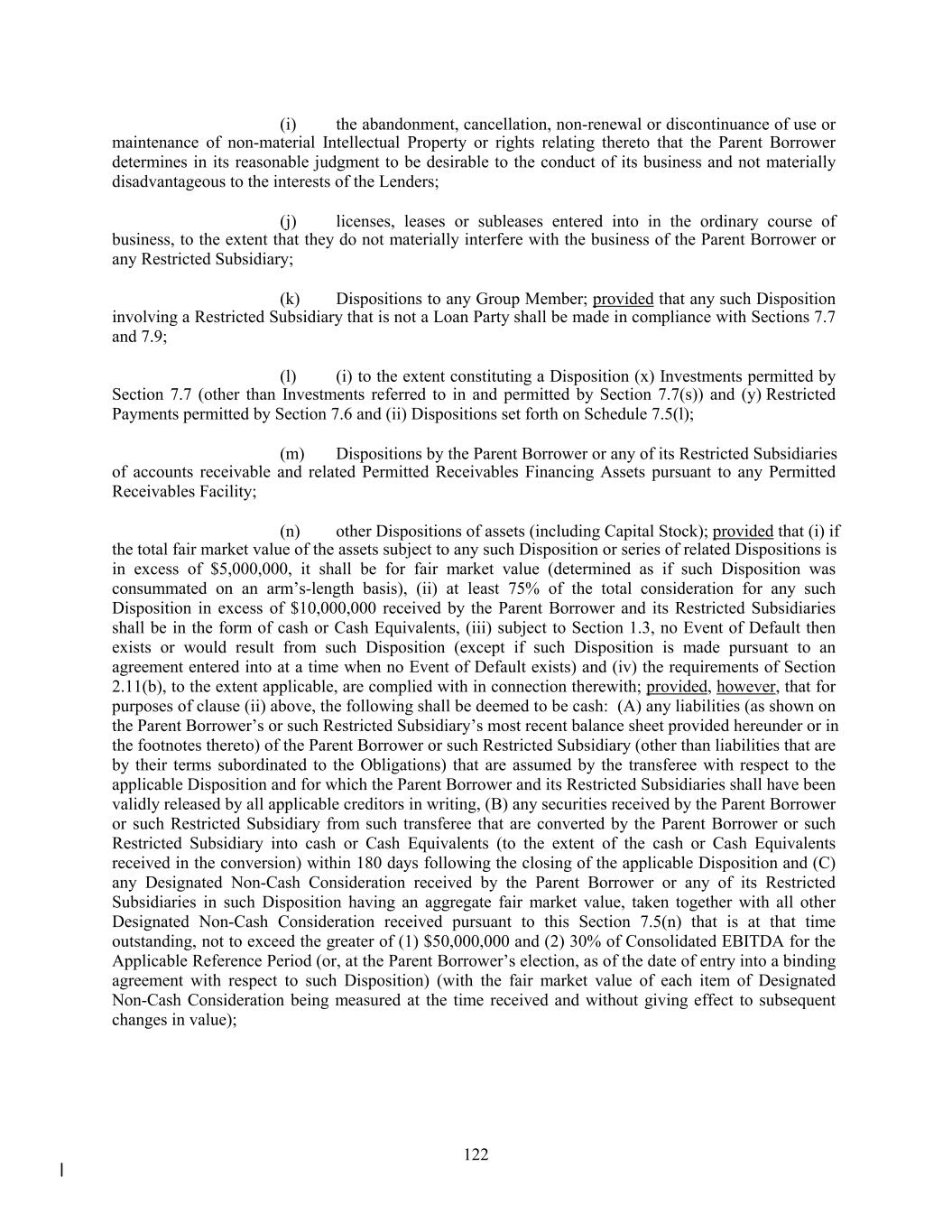 (i) the abandonment, cancellation, non-renewal or discontinuance of use or maintenance of non-material Intellectual Property or rights relating thereto that the Parent Borrower determines in its reasonable judgment to be desirable to the conduct of its business and not materially disadvantageous to the interests of the Lenders; (j) licenses, leases or subleases entered into in the ordinary course of business, to the extent that they do not materially interfere with the business of the Parent Borrower or any Restricted Subsidiary; (k) Dispositions to any Group Member; provided that any such Disposition involving a Restricted Subsidiary that is not a Loan Party shall be made in compliance with Sections 7.7 and 7.9; (l) (i) to the extent constituting a Disposition (x) Investments permitted by Section 7.7 (other than Investments referred to in and permitted by Section 7.7(s)) and (y) Restricted Payments permitted by Section 7.6 and (ii) Dispositions set forth on Schedule 7.5(l); (m) Dispositions by the Parent Borrower or any of its Restricted Subsidiaries of accounts receivable and related Permitted Receivables Financing Assets pursuant to any Permitted Receivables Facility; (n) other Dispositions of assets (including Capital Stock); provided that (i) if the total fair market value of the assets subject to any such Disposition or series of related Dispositions is in excess of $5,000,000, it shall be for fair market value (determined as if such Disposition was consummated on an arm’s-length basis), (ii) at least 75% of the total consideration for any such Disposition in excess of $10,000,000 received by the Parent Borrower and its Restricted Subsidiaries shall be in the form of cash or Cash Equivalents, (iii) subject to Section 1.3, no Event of Default then exists or would result from such Disposition (except if such Disposition is made pursuant to an agreement entered into at a time when no Event of Default exists) and (iv) the requirements of Section 2.11(b), to the extent applicable, are complied with in connection therewith; provided, however, that for purposes of clause (ii) above, the following shall be deemed to be cash: (A) any liabilities (as shown on the Parent Borrower’s or such Restricted Subsidiary’s most recent balance sheet provided hereunder or in the footnotes thereto) of the Parent Borrower or such Restricted Subsidiary (other than liabilities that are by their terms subordinated to the Obligations) that are assumed by the transferee with respect to the applicable Disposition and for which the Parent Borrower and its Restricted Subsidiaries shall have been validly released by all applicable creditors in writing, (B) any securities received by the Parent Borrower or such Restricted Subsidiary from such transferee that are converted by the Parent Borrower or such Restricted Subsidiary into cash or Cash Equivalents (to the extent of the cash or Cash Equivalents received in the conversion) within 180 days following the closing of the applicable Disposition and (C) any Designated Non-Cash Consideration received by the Parent Borrower or any of its Restricted Subsidiaries in such Disposition having an aggregate fair market value, taken together with all other Designated Non-Cash Consideration received pursuant to this Section 7.5(n) that is at that time outstanding, not to exceed the greater of (1) $50,000,000 and (2) 30% of Consolidated EBITDA for the Applicable Reference Period (or, at the Parent Borrower’s election, as of the date of entry into a binding agreement with respect to such Disposition) (with the fair market value of each item of Designated Non-Cash Consideration being measured at the time received and without giving effect to subsequent changes in value); 122