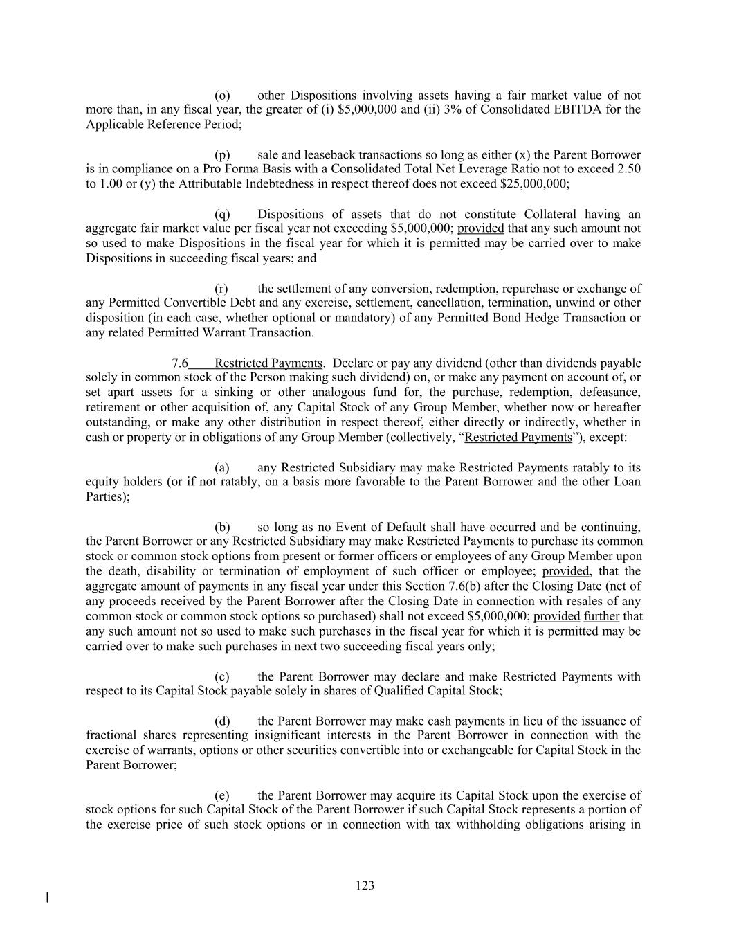 (o) other Dispositions involving assets having a fair market value of not more than, in any fiscal year, the greater of (i) $5,000,000 and (ii) 3% of Consolidated EBITDA for the Applicable Reference Period; (p) sale and leaseback transactions so long as either (x) the Parent Borrower is in compliance on a Pro Forma Basis with a Consolidated Total Net Leverage Ratio not to exceed 2.50 to 1.00 or (y) the Attributable Indebtedness in respect thereof does not exceed $25,000,000; (q) Dispositions of assets that do not constitute Collateral having an aggregate fair market value per fiscal year not exceeding $5,000,000; provided that any such amount not so used to make Dispositions in the fiscal year for which it is permitted may be carried over to make Dispositions in succeeding fiscal years; and (r) the settlement of any conversion, redemption, repurchase or exchange of any Permitted Convertible Debt and any exercise, settlement, cancellation, termination, unwind or other disposition (in each case, whether optional or mandatory) of any Permitted Bond Hedge Transaction or any related Permitted Warrant Transaction. 7.6 Restricted Payments. Declare or pay any dividend (other than dividends payable solely in common stock of the Person making such dividend) on, or make any payment on account of, or set apart assets for a sinking or other analogous fund for, the purchase, redemption, defeasance, retirement or other acquisition of, any Capital Stock of any Group Member, whether now or hereafter outstanding, or make any other distribution in respect thereof, either directly or indirectly, whether in cash or property or in obligations of any Group Member (collectively, “Restricted Payments”), except: (a) any Restricted Subsidiary may make Restricted Payments ratably to its equity holders (or if not ratably, on a basis more favorable to the Parent Borrower and the other Loan Parties); (b) so long as no Event of Default shall have occurred and be continuing, the Parent Borrower or any Restricted Subsidiary may make Restricted Payments to purchase its common stock or common stock options from present or former officers or employees of any Group Member upon the death, disability or termination of employment of such officer or employee; provided, that the aggregate amount of payments in any fiscal year under this Section 7.6(b) after the Closing Date (net of any proceeds received by the Parent Borrower after the Closing Date in connection with resales of any common stock or common stock options so purchased) shall not exceed $5,000,000; provided further that any such amount not so used to make such purchases in the fiscal year for which it is permitted may be carried over to make such purchases in next two succeeding fiscal years only; (c) the Parent Borrower may declare and make Restricted Payments with respect to its Capital Stock payable solely in shares of Qualified Capital Stock; (d) the Parent Borrower may make cash payments in lieu of the issuance of fractional shares representing insignificant interests in the Parent Borrower in connection with the exercise of warrants, options or other securities convertible into or exchangeable for Capital Stock in the Parent Borrower; (e) the Parent Borrower may acquire its Capital Stock upon the exercise of stock options for such Capital Stock of the Parent Borrower if such Capital Stock represents a portion of the exercise price of such stock options or in connection with tax withholding obligations arising in 123
