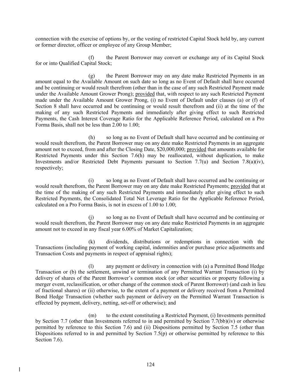 connection with the exercise of options by, or the vesting of restricted Capital Stock held by, any current or former director, officer or employee of any Group Member; (f) the Parent Borrower may convert or exchange any of its Capital Stock for or into Qualified Capital Stock; (g) the Parent Borrower may on any date make Restricted Payments in an amount equal to the Available Amount on such date so long as no Event of Default shall have occurred and be continuing or would result therefrom (other than in the case of any such Restricted Payment made under the Available Amount Grower Prong); provided that, with respect to any such Restricted Payment made under the Available Amount Grower Prong, (i) no Event of Default under clauses (a) or (f) of Section 8 shall have occurred and be continuing or would result therefrom and (ii) at the time of the making of any such Restricted Payments and immediately after giving effect to such Restricted Payments, the Cash Interest Coverage Ratio for the Applicable Reference Period, calculated on a Pro Forma Basis, shall not be less than 2.00 to 1.00; (h) so long as no Event of Default shall have occurred and be continuing or would result therefrom, the Parent Borrower may on any date make Restricted Payments in an aggregate amount not to exceed, from and after the Closing Date, $20,000,000; provided that amounts available for Restricted Payments under this Section 7.6(h) may be reallocated, without duplication, to make Investments and/or Restricted Debt Payments pursuant to Section 7.7(u) and Section 7.8(a)(iv), respectively; (i) so long as no Event of Default shall have occurred and be continuing or would result therefrom, the Parent Borrower may on any date make Restricted Payments; provided that at the time of the making of any such Restricted Payments and immediately after giving effect to such Restricted Payments, the Consolidated Total Net Leverage Ratio for the Applicable Reference Period, calculated on a Pro Forma Basis, is not in excess of 1.00 to 1.00; (j) so long as no Event of Default shall have occurred and be continuing or would result therefrom, the Parent Borrower may on any date make Restricted Payments in an aggregate amount not to exceed in any fiscal year 6.00% of Market Capitalization; (k) dividends, distributions or redemptions in connection with the Transactions (including payment of working capital, indemnities and/or purchase price adjustments and Transaction Costs and payments in respect of appraisal rights); (l) any payment or delivery in connection with (a) a Permitted Bond Hedge Transaction or (b) the settlement, unwind or termination of any Permitted Warrant Transaction (i) by delivery of shares of the Parent Borrower’s common stock (or other securities or property following a merger event, reclassification, or other change of the common stock of Parent Borrower) (and cash in lieu of fractional shares) or (ii) otherwise, to the extent of a payment or delivery received from a Permitted Bond Hedge Transaction (whether such payment or delivery on the Permitted Warrant Transaction is effected by payment, delivery, netting, set-off or otherwise); and (m) to the extent constituting a Restricted Payment, (i) Investments permitted by Section 7.7 (other than Investments referred to in and permitted by Section 7.7(bb)(iv) or otherwise permitted by reference to this Section 7.6) and (ii) Dispositions permitted by Section 7.5 (other than Dispositions referred to in and permitted by Section 7.5(p) or otherwise permitted by reference to this Section 7.6). 124