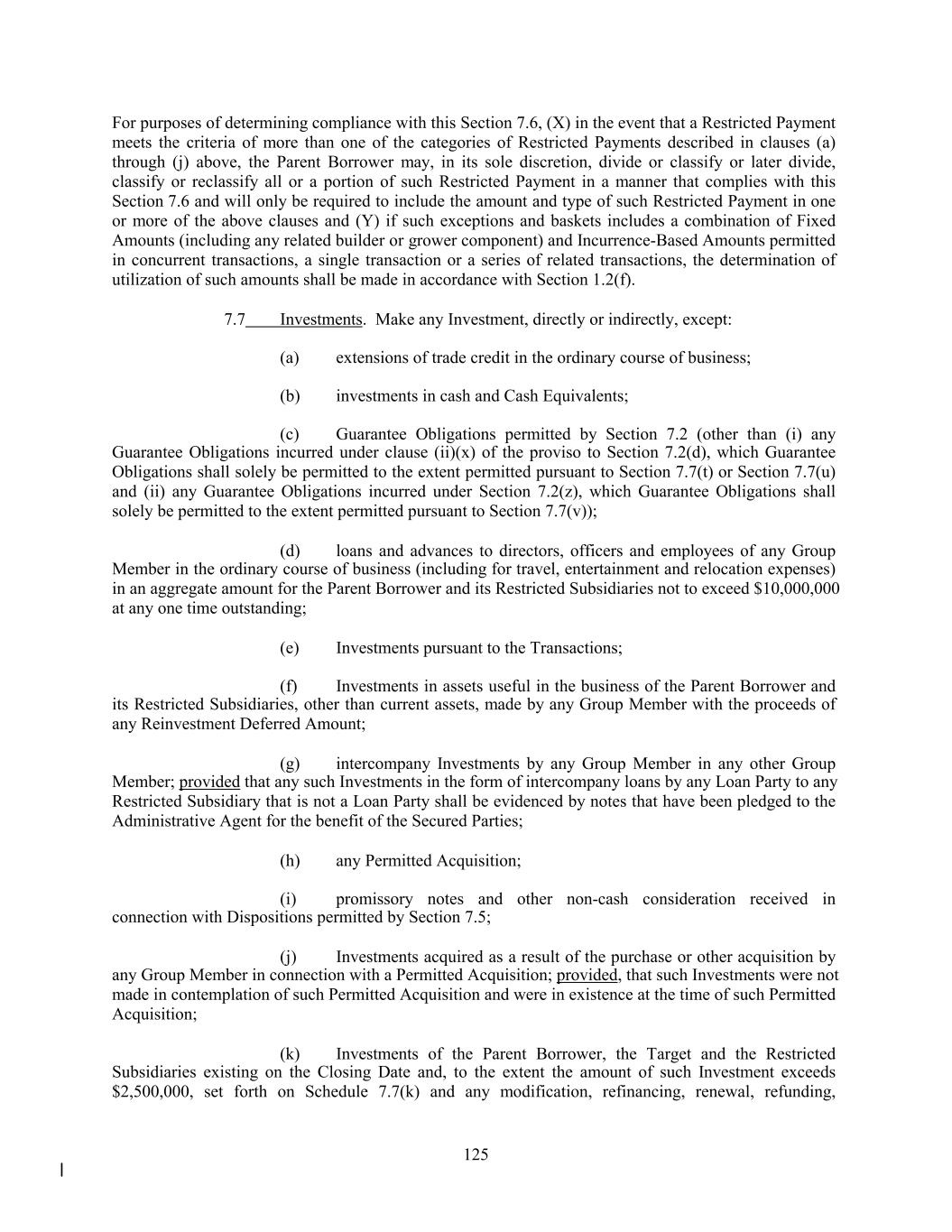 For purposes of determining compliance with this Section 7.6, (X) in the event that a Restricted Payment meets the criteria of more than one of the categories of Restricted Payments described in clauses (a) through (j) above, the Parent Borrower may, in its sole discretion, divide or classify or later divide, classify or reclassify all or a portion of such Restricted Payment in a manner that complies with this Section 7.6 and will only be required to include the amount and type of such Restricted Payment in one or more of the above clauses and (Y) if such exceptions and baskets includes a combination of Fixed Amounts (including any related builder or grower component) and Incurrence-Based Amounts permitted in concurrent transactions, a single transaction or a series of related transactions, the determination of utilization of such amounts shall be made in accordance with Section 1.2(f). 7.7 Investments. Make any Investment, directly or indirectly, except: (a) extensions of trade credit in the ordinary course of business; (b) investments in cash and Cash Equivalents; (c) Guarantee Obligations permitted by Section 7.2 (other than (i) any Guarantee Obligations incurred under clause (ii)(x) of the proviso to Section 7.2(d), which Guarantee Obligations shall solely be permitted to the extent permitted pursuant to Section 7.7(t) or Section 7.7(u) and (ii) any Guarantee Obligations incurred under Section 7.2(z), which Guarantee Obligations shall solely be permitted to the extent permitted pursuant to Section 7.7(v)); (d) loans and advances to directors, officers and employees of any Group Member in the ordinary course of business (including for travel, entertainment and relocation expenses) in an aggregate amount for the Parent Borrower and its Restricted Subsidiaries not to exceed $10,000,000 at any one time outstanding; (e) Investments pursuant to the Transactions; (f) Investments in assets useful in the business of the Parent Borrower and its Restricted Subsidiaries, other than current assets, made by any Group Member with the proceeds of any Reinvestment Deferred Amount; (g) intercompany Investments by any Group Member in any other Group Member; provided that any such Investments in the form of intercompany loans by any Loan Party to any Restricted Subsidiary that is not a Loan Party shall be evidenced by notes that have been pledged to the Administrative Agent for the benefit of the Secured Parties; (h) any Permitted Acquisition; (i) promissory notes and other non-cash consideration received in connection with Dispositions permitted by Section 7.5; (j) Investments acquired as a result of the purchase or other acquisition by any Group Member in connection with a Permitted Acquisition; provided, that such Investments were not made in contemplation of such Permitted Acquisition and were in existence at the time of such Permitted Acquisition; (k) Investments of the Parent Borrower, the Target and the Restricted Subsidiaries existing on the Closing Date and, to the extent the amount of such Investment exceeds $2,500,000, set forth on Schedule 7.7(k) and any modification, refinancing, renewal, refunding, 125
