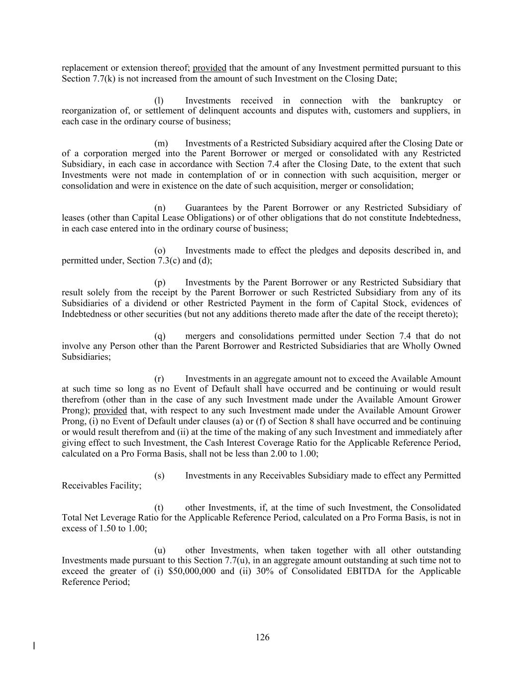 replacement or extension thereof; provided that the amount of any Investment permitted pursuant to this Section 7.7(k) is not increased from the amount of such Investment on the Closing Date; (l) Investments received in connection with the bankruptcy or reorganization of, or settlement of delinquent accounts and disputes with, customers and suppliers, in each case in the ordinary course of business; (m) Investments of a Restricted Subsidiary acquired after the Closing Date or of a corporation merged into the Parent Borrower or merged or consolidated with any Restricted Subsidiary, in each case in accordance with Section 7.4 after the Closing Date, to the extent that such Investments were not made in contemplation of or in connection with such acquisition, merger or consolidation and were in existence on the date of such acquisition, merger or consolidation; (n) Guarantees by the Parent Borrower or any Restricted Subsidiary of leases (other than Capital Lease Obligations) or of other obligations that do not constitute Indebtedness, in each case entered into in the ordinary course of business; (o) Investments made to effect the pledges and deposits described in, and permitted under, Section 7.3(c) and (d); (p) Investments by the Parent Borrower or any Restricted Subsidiary that result solely from the receipt by the Parent Borrower or such Restricted Subsidiary from any of its Subsidiaries of a dividend or other Restricted Payment in the form of Capital Stock, evidences of Indebtedness or other securities (but not any additions thereto made after the date of the receipt thereto); (q) mergers and consolidations permitted under Section 7.4 that do not involve any Person other than the Parent Borrower and Restricted Subsidiaries that are Wholly Owned Subsidiaries; (r) Investments in an aggregate amount not to exceed the Available Amount at such time so long as no Event of Default shall have occurred and be continuing or would result therefrom (other than in the case of any such Investment made under the Available Amount Grower Prong); provided that, with respect to any such Investment made under the Available Amount Grower Prong, (i) no Event of Default under clauses (a) or (f) of Section 8 shall have occurred and be continuing or would result therefrom and (ii) at the time of the making of any such Investment and immediately after giving effect to such Investment, the Cash Interest Coverage Ratio for the Applicable Reference Period, calculated on a Pro Forma Basis, shall not be less than 2.00 to 1.00; (s) Investments in any Receivables Subsidiary made to effect any Permitted Receivables Facility; (t) other Investments, if, at the time of such Investment, the Consolidated Total Net Leverage Ratio for the Applicable Reference Period, calculated on a Pro Forma Basis, is not in excess of 1.50 to 1.00; (u) other Investments, when taken together with all other outstanding Investments made pursuant to this Section 7.7(u), in an aggregate amount outstanding at such time not to exceed the greater of (i) $50,000,000 and (ii) 30% of Consolidated EBITDA for the Applicable Reference Period; 126