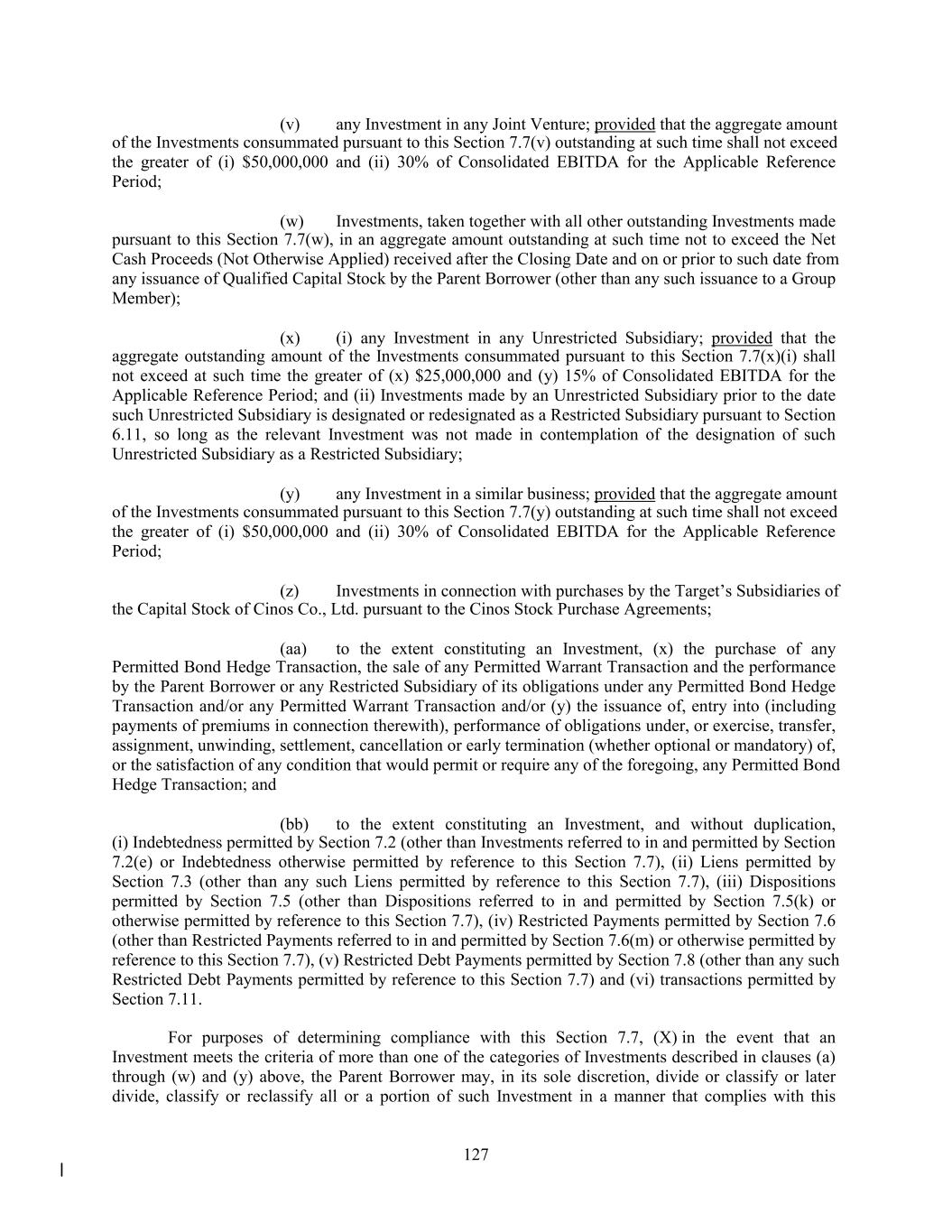 (v) any Investment in any Joint Venture; provided that the aggregate amount of the Investments consummated pursuant to this Section 7.7(v) outstanding at such time shall not exceed the greater of (i) $50,000,000 and (ii) 30% of Consolidated EBITDA for the Applicable Reference Period; (w) Investments, taken together with all other outstanding Investments made pursuant to this Section 7.7(w), in an aggregate amount outstanding at such time not to exceed the Net Cash Proceeds (Not Otherwise Applied) received after the Closing Date and on or prior to such date from any issuance of Qualified Capital Stock by the Parent Borrower (other than any such issuance to a Group Member); (x) (i) any Investment in any Unrestricted Subsidiary; provided that the aggregate outstanding amount of the Investments consummated pursuant to this Section 7.7(x)(i) shall not exceed at such time the greater of (x) $25,000,000 and (y) 15% of Consolidated EBITDA for the Applicable Reference Period; and (ii) Investments made by an Unrestricted Subsidiary prior to the date such Unrestricted Subsidiary is designated or redesignated as a Restricted Subsidiary pursuant to Section 6.11, so long as the relevant Investment was not made in contemplation of the designation of such Unrestricted Subsidiary as a Restricted Subsidiary; (y) any Investment in a similar business; provided that the aggregate amount of the Investments consummated pursuant to this Section 7.7(y) outstanding at such time shall not exceed the greater of (i) $50,000,000 and (ii) 30% of Consolidated EBITDA for the Applicable Reference Period; (z) Investments in connection with purchases by the Target’s Subsidiaries of the Capital Stock of Cinos Co., Ltd. pursuant to the Cinos Stock Purchase Agreements; (aa) to the extent constituting an Investment, (x) the purchase of any Permitted Bond Hedge Transaction, the sale of any Permitted Warrant Transaction and the performance by the Parent Borrower or any Restricted Subsidiary of its obligations under any Permitted Bond Hedge Transaction and/or any Permitted Warrant Transaction and/or (y) the issuance of, entry into (including payments of premiums in connection therewith), performance of obligations under, or exercise, transfer, assignment, unwinding, settlement, cancellation or early termination (whether optional or mandatory) of, or the satisfaction of any condition that would permit or require any of the foregoing, any Permitted Bond Hedge Transaction; and (bb) to the extent constituting an Investment, and without duplication, (i) Indebtedness permitted by Section 7.2 (other than Investments referred to in and permitted by Section 7.2(e) or Indebtedness otherwise permitted by reference to this Section 7.7), (ii) Liens permitted by Section 7.3 (other than any such Liens permitted by reference to this Section 7.7), (iii) Dispositions permitted by Section 7.5 (other than Dispositions referred to in and permitted by Section 7.5(k) or otherwise permitted by reference to this Section 7.7), (iv) Restricted Payments permitted by Section 7.6 (other than Restricted Payments referred to in and permitted by Section 7.6(m) or otherwise permitted by reference to this Section 7.7), (v) Restricted Debt Payments permitted by Section 7.8 (other than any such Restricted Debt Payments permitted by reference to this Section 7.7) and (vi) transactions permitted by Section 7.11. For purposes of determining compliance with this Section 7.7, (X) in the event that an Investment meets the criteria of more than one of the categories of Investments described in clauses (a) through (w) and (y) above, the Parent Borrower may, in its sole discretion, divide or classify or later divide, classify or reclassify all or a portion of such Investment in a manner that complies with this 127