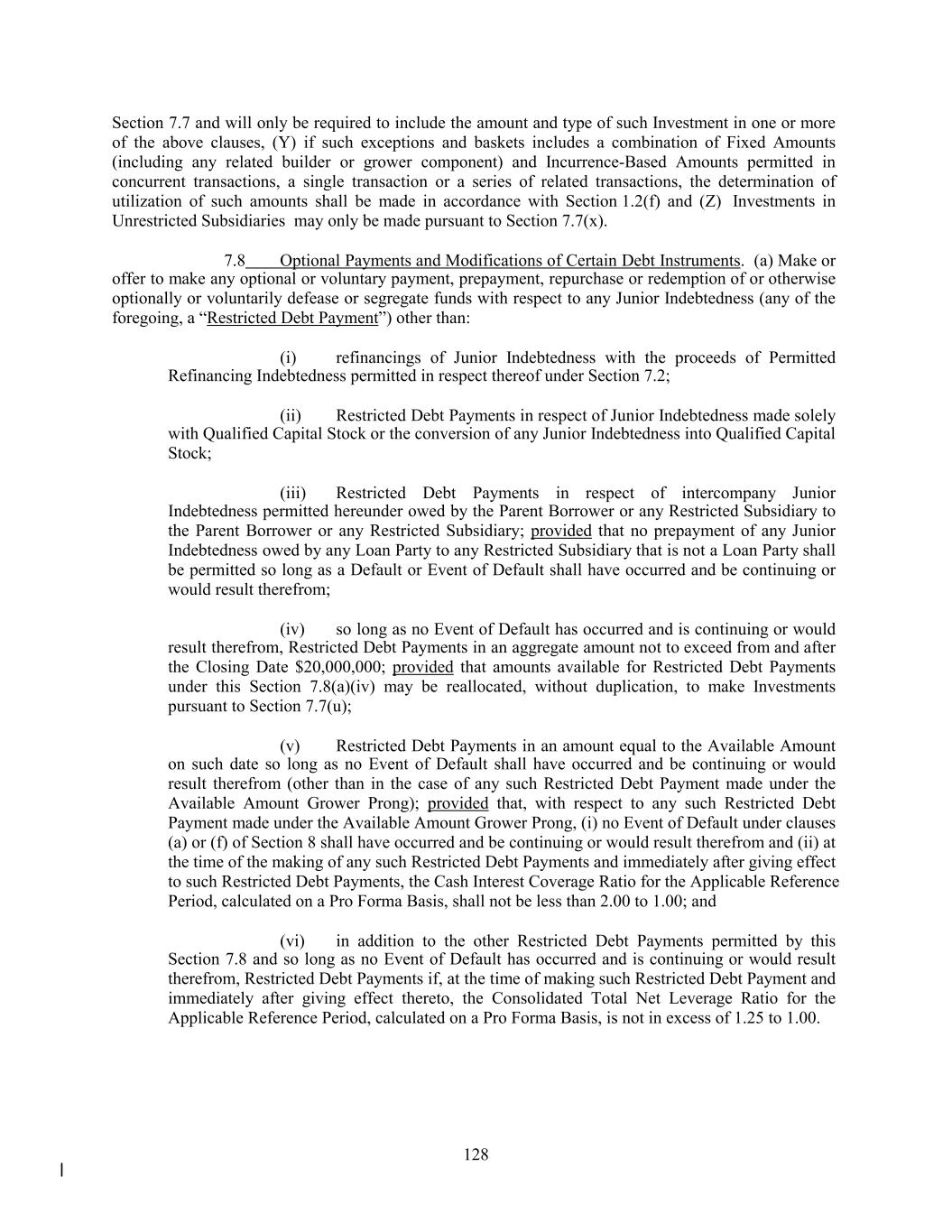 Section 7.7 and will only be required to include the amount and type of such Investment in one or more of the above clauses, (Y) if such exceptions and baskets includes a combination of Fixed Amounts (including any related builder or grower component) and Incurrence-Based Amounts permitted in concurrent transactions, a single transaction or a series of related transactions, the determination of utilization of such amounts shall be made in accordance with Section 1.2(f) and (Z) Investments in Unrestricted Subsidiaries may only be made pursuant to Section 7.7(x). 7.8 Optional Payments and Modifications of Certain Debt Instruments. (a) Make or offer to make any optional or voluntary payment, prepayment, repurchase or redemption of or otherwise optionally or voluntarily defease or segregate funds with respect to any Junior Indebtedness (any of the foregoing, a “Restricted Debt Payment”) other than: (i) refinancings of Junior Indebtedness with the proceeds of Permitted Refinancing Indebtedness permitted in respect thereof under Section 7.2; (ii) Restricted Debt Payments in respect of Junior Indebtedness made solely with Qualified Capital Stock or the conversion of any Junior Indebtedness into Qualified Capital Stock; (iii) Restricted Debt Payments in respect of intercompany Junior Indebtedness permitted hereunder owed by the Parent Borrower or any Restricted Subsidiary to the Parent Borrower or any Restricted Subsidiary; provided that no prepayment of any Junior Indebtedness owed by any Loan Party to any Restricted Subsidiary that is not a Loan Party shall be permitted so long as a Default or Event of Default shall have occurred and be continuing or would result therefrom; (iv) so long as no Event of Default has occurred and is continuing or would result therefrom, Restricted Debt Payments in an aggregate amount not to exceed from and after the Closing Date $20,000,000; provided that amounts available for Restricted Debt Payments under this Section 7.8(a)(iv) may be reallocated, without duplication, to make Investments pursuant to Section 7.7(u); (v) Restricted Debt Payments in an amount equal to the Available Amount on such date so long as no Event of Default shall have occurred and be continuing or would result therefrom (other than in the case of any such Restricted Debt Payment made under the Available Amount Grower Prong); provided that, with respect to any such Restricted Debt Payment made under the Available Amount Grower Prong, (i) no Event of Default under clauses (a) or (f) of Section 8 shall have occurred and be continuing or would result therefrom and (ii) at the time of the making of any such Restricted Debt Payments and immediately after giving effect to such Restricted Debt Payments, the Cash Interest Coverage Ratio for the Applicable Reference Period, calculated on a Pro Forma Basis, shall not be less than 2.00 to 1.00; and (vi) in addition to the other Restricted Debt Payments permitted by this Section 7.8 and so long as no Event of Default has occurred and is continuing or would result therefrom, Restricted Debt Payments if, at the time of making such Restricted Debt Payment and immediately after giving effect thereto, the Consolidated Total Net Leverage Ratio for the Applicable Reference Period, calculated on a Pro Forma Basis, is not in excess of 1.25 to 1.00. 128