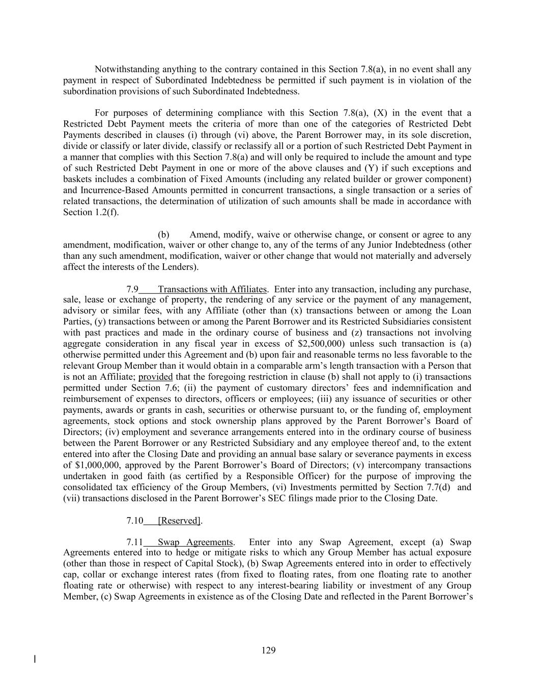Notwithstanding anything to the contrary contained in this Section 7.8(a), in no event shall any payment in respect of Subordinated Indebtedness be permitted if such payment is in violation of the subordination provisions of such Subordinated Indebtedness. For purposes of determining compliance with this Section 7.8(a), (X) in the event that a Restricted Debt Payment meets the criteria of more than one of the categories of Restricted Debt Payments described in clauses (i) through (vi) above, the Parent Borrower may, in its sole discretion, divide or classify or later divide, classify or reclassify all or a portion of such Restricted Debt Payment in a manner that complies with this Section 7.8(a) and will only be required to include the amount and type of such Restricted Debt Payment in one or more of the above clauses and (Y) if such exceptions and baskets includes a combination of Fixed Amounts (including any related builder or grower component) and Incurrence-Based Amounts permitted in concurrent transactions, a single transaction or a series of related transactions, the determination of utilization of such amounts shall be made in accordance with Section 1.2(f). (b) Amend, modify, waive or otherwise change, or consent or agree to any amendment, modification, waiver or other change to, any of the terms of any Junior Indebtedness (other than any such amendment, modification, waiver or other change that would not materially and adversely affect the interests of the Lenders). 7.9 Transactions with Affiliates. Enter into any transaction, including any purchase, sale, lease or exchange of property, the rendering of any service or the payment of any management, advisory or similar fees, with any Affiliate (other than (x) transactions between or among the Loan Parties, (y) transactions between or among the Parent Borrower and its Restricted Subsidiaries consistent with past practices and made in the ordinary course of business and (z) transactions not involving aggregate consideration in any fiscal year in excess of $2,500,000) unless such transaction is (a) otherwise permitted under this Agreement and (b) upon fair and reasonable terms no less favorable to the relevant Group Member than it would obtain in a comparable arm’s length transaction with a Person that is not an Affiliate; provided that the foregoing restriction in clause (b) shall not apply to (i) transactions permitted under Section 7.6; (ii) the payment of customary directors’ fees and indemnification and reimbursement of expenses to directors, officers or employees; (iii) any issuance of securities or other payments, awards or grants in cash, securities or otherwise pursuant to, or the funding of, employment agreements, stock options and stock ownership plans approved by the Parent Borrower’s Board of Directors; (iv) employment and severance arrangements entered into in the ordinary course of business between the Parent Borrower or any Restricted Subsidiary and any employee thereof and, to the extent entered into after the Closing Date and providing an annual base salary or severance payments in excess of $1,000,000, approved by the Parent Borrower’s Board of Directors; (v) intercompany transactions undertaken in good faith (as certified by a Responsible Officer) for the purpose of improving the consolidated tax efficiency of the Group Members, (vi) Investments permitted by Section 7.7(d) and (vii) transactions disclosed in the Parent Borrower’s SEC filings made prior to the Closing Date. 7.10 [Reserved]. 7.11 Swap Agreements. Enter into any Swap Agreement, except (a) Swap Agreements entered into to hedge or mitigate risks to which any Group Member has actual exposure (other than those in respect of Capital Stock), (b) Swap Agreements entered into in order to effectively cap, collar or exchange interest rates (from fixed to floating rates, from one floating rate to another floating rate or otherwise) with respect to any interest-bearing liability or investment of any Group Member, (c) Swap Agreements in existence as of the Closing Date and reflected in the Parent Borrower’s 129
