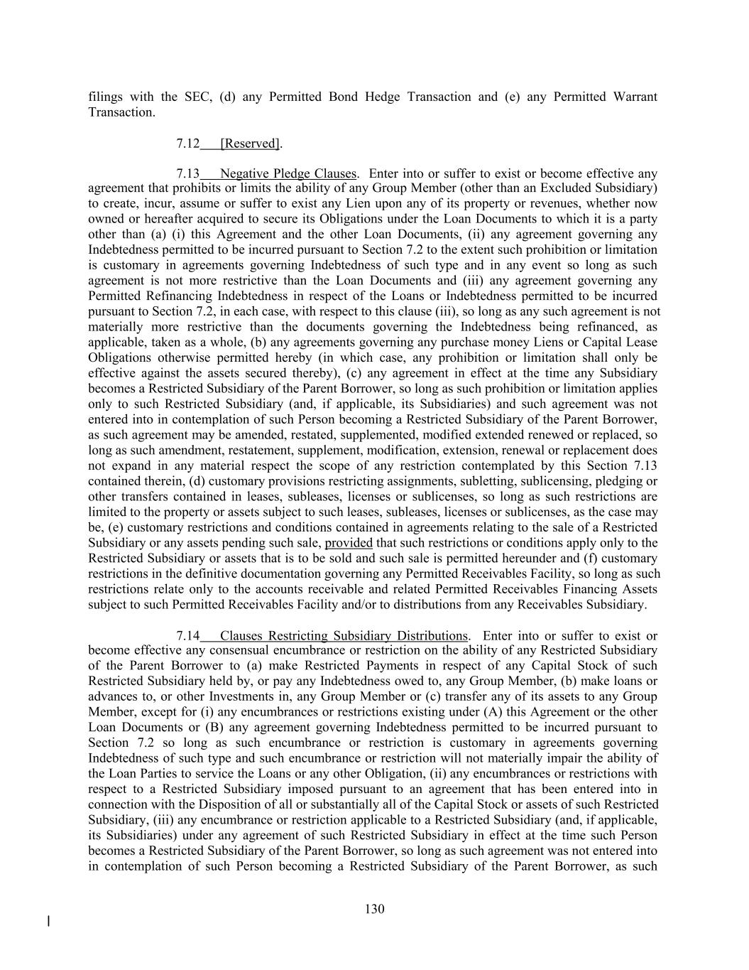 filings with the SEC, (d) any Permitted Bond Hedge Transaction and (e) any Permitted Warrant Transaction. 7.12 [Reserved]. 7.13 Negative Pledge Clauses. Enter into or suffer to exist or become effective any agreement that prohibits or limits the ability of any Group Member (other than an Excluded Subsidiary) to create, incur, assume or suffer to exist any Lien upon any of its property or revenues, whether now owned or hereafter acquired to secure its Obligations under the Loan Documents to which it is a party other than (a) (i) this Agreement and the other Loan Documents, (ii) any agreement governing any Indebtedness permitted to be incurred pursuant to Section 7.2 to the extent such prohibition or limitation is customary in agreements governing Indebtedness of such type and in any event so long as such agreement is not more restrictive than the Loan Documents and (iii) any agreement governing any Permitted Refinancing Indebtedness in respect of the Loans or Indebtedness permitted to be incurred pursuant to Section 7.2, in each case, with respect to this clause (iii), so long as any such agreement is not materially more restrictive than the documents governing the Indebtedness being refinanced, as applicable, taken as a whole, (b) any agreements governing any purchase money Liens or Capital Lease Obligations otherwise permitted hereby (in which case, any prohibition or limitation shall only be effective against the assets secured thereby), (c) any agreement in effect at the time any Subsidiary becomes a Restricted Subsidiary of the Parent Borrower, so long as such prohibition or limitation applies only to such Restricted Subsidiary (and, if applicable, its Subsidiaries) and such agreement was not entered into in contemplation of such Person becoming a Restricted Subsidiary of the Parent Borrower, as such agreement may be amended, restated, supplemented, modified extended renewed or replaced, so long as such amendment, restatement, supplement, modification, extension, renewal or replacement does not expand in any material respect the scope of any restriction contemplated by this Section 7.13 contained therein, (d) customary provisions restricting assignments, subletting, sublicensing, pledging or other transfers contained in leases, subleases, licenses or sublicenses, so long as such restrictions are limited to the property or assets subject to such leases, subleases, licenses or sublicenses, as the case may be, (e) customary restrictions and conditions contained in agreements relating to the sale of a Restricted Subsidiary or any assets pending such sale, provided that such restrictions or conditions apply only to the Restricted Subsidiary or assets that is to be sold and such sale is permitted hereunder and (f) customary restrictions in the definitive documentation governing any Permitted Receivables Facility, so long as such restrictions relate only to the accounts receivable and related Permitted Receivables Financing Assets subject to such Permitted Receivables Facility and/or to distributions from any Receivables Subsidiary. 7.14 Clauses Restricting Subsidiary Distributions. Enter into or suffer to exist or become effective any consensual encumbrance or restriction on the ability of any Restricted Subsidiary of the Parent Borrower to (a) make Restricted Payments in respect of any Capital Stock of such Restricted Subsidiary held by, or pay any Indebtedness owed to, any Group Member, (b) make loans or advances to, or other Investments in, any Group Member or (c) transfer any of its assets to any Group Member, except for (i) any encumbrances or restrictions existing under (A) this Agreement or the other Loan Documents or (B) any agreement governing Indebtedness permitted to be incurred pursuant to Section 7.2 so long as such encumbrance or restriction is customary in agreements governing Indebtedness of such type and such encumbrance or restriction will not materially impair the ability of the Loan Parties to service the Loans or any other Obligation, (ii) any encumbrances or restrictions with respect to a Restricted Subsidiary imposed pursuant to an agreement that has been entered into in connection with the Disposition of all or substantially all of the Capital Stock or assets of such Restricted Subsidiary, (iii) any encumbrance or restriction applicable to a Restricted Subsidiary (and, if applicable, its Subsidiaries) under any agreement of such Restricted Subsidiary in effect at the time such Person becomes a Restricted Subsidiary of the Parent Borrower, so long as such agreement was not entered into in contemplation of such Person becoming a Restricted Subsidiary of the Parent Borrower, as such 130