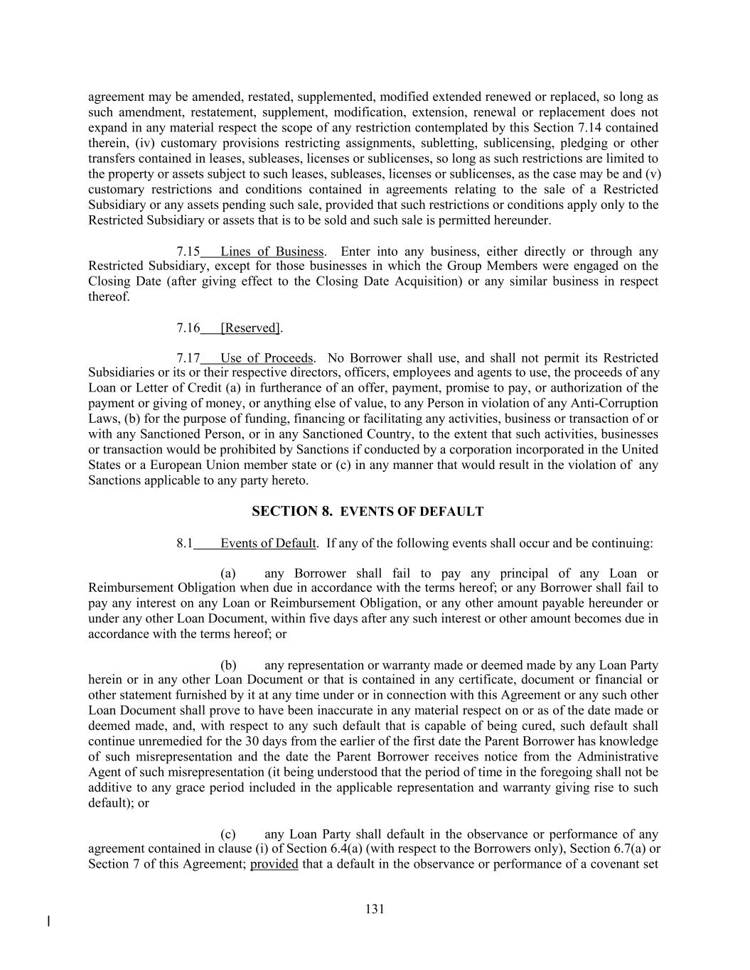 agreement may be amended, restated, supplemented, modified extended renewed or replaced, so long as such amendment, restatement, supplement, modification, extension, renewal or replacement does not expand in any material respect the scope of any restriction contemplated by this Section 7.14 contained therein, (iv) customary provisions restricting assignments, subletting, sublicensing, pledging or other transfers contained in leases, subleases, licenses or sublicenses, so long as such restrictions are limited to the property or assets subject to such leases, subleases, licenses or sublicenses, as the case may be and (v) customary restrictions and conditions contained in agreements relating to the sale of a Restricted Subsidiary or any assets pending such sale, provided that such restrictions or conditions apply only to the Restricted Subsidiary or assets that is to be sold and such sale is permitted hereunder. 7.15 Lines of Business. Enter into any business, either directly or through any Restricted Subsidiary, except for those businesses in which the Group Members were engaged on the Closing Date (after giving effect to the Closing Date Acquisition) or any similar business in respect thereof. 7.16 [Reserved]. 7.17 Use of Proceeds. No Borrower shall use, and shall not permit its Restricted Subsidiaries or its or their respective directors, officers, employees and agents to use, the proceeds of any Loan or Letter of Credit (a) in furtherance of an offer, payment, promise to pay, or authorization of the payment or giving of money, or anything else of value, to any Person in violation of any Anti-Corruption Laws, (b) for the purpose of funding, financing or facilitating any activities, business or transaction of or with any Sanctioned Person, or in any Sanctioned Country, to the extent that such activities, businesses or transaction would be prohibited by Sanctions if conducted by a corporation incorporated in the United States or a European Union member state or (c) in any manner that would result in the violation of any Sanctions applicable to any party hereto. SECTION 8. EVENTS OF DEFAULT 8.1 Events of Default. If any of the following events shall occur and be continuing: (a) any Borrower shall fail to pay any principal of any Loan or Reimbursement Obligation when due in accordance with the terms hereof; or any Borrower shall fail to pay any interest on any Loan or Reimbursement Obligation, or any other amount payable hereunder or under any other Loan Document, within five days after any such interest or other amount becomes due in accordance with the terms hereof; or (b) any representation or warranty made or deemed made by any Loan Party herein or in any other Loan Document or that is contained in any certificate, document or financial or other statement furnished by it at any time under or in connection with this Agreement or any such other Loan Document shall prove to have been inaccurate in any material respect on or as of the date made or deemed made, and, with respect to any such default that is capable of being cured, such default shall continue unremedied for the 30 days from the earlier of the first date the Parent Borrower has knowledge of such misrepresentation and the date the Parent Borrower receives notice from the Administrative Agent of such misrepresentation (it being understood that the period of time in the foregoing shall not be additive to any grace period included in the applicable representation and warranty giving rise to such default); or (c) any Loan Party shall default in the observance or performance of any agreement contained in clause (i) of Section 6.4(a) (with respect to the Borrowers only), Section 6.7(a) or Section 7 of this Agreement; provided that a default in the observance or performance of a covenant set 131