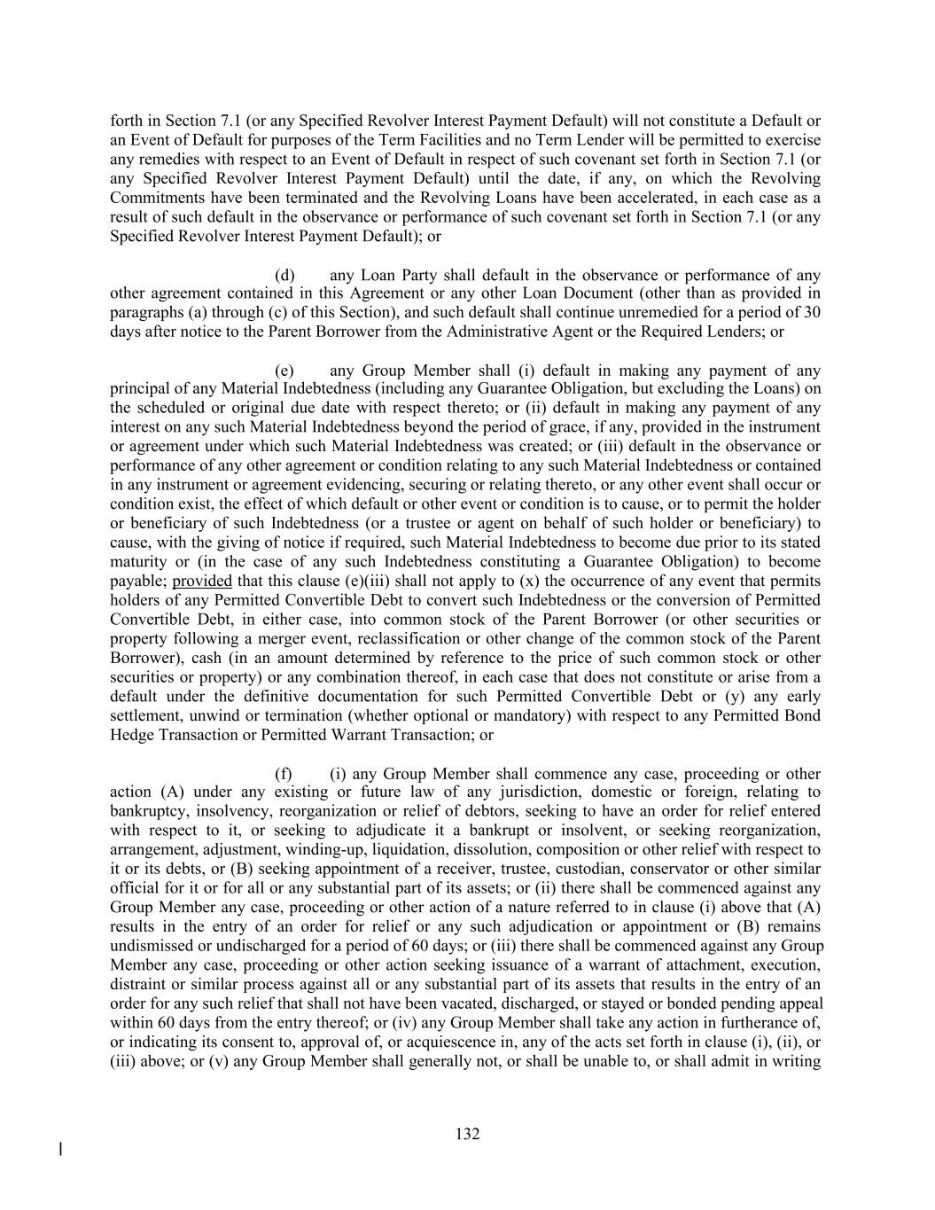 forth in Section 7.1 (or any Specified Revolver Interest Payment Default) will not constitute a Default or an Event of Default for purposes of the Term Facilities and no Term Lender will be permitted to exercise any remedies with respect to an Event of Default in respect of such covenant set forth in Section 7.1 (or any Specified Revolver Interest Payment Default) until the date, if any, on which the Revolving Commitments have been terminated and the Revolving Loans have been accelerated, in each case as a result of such default in the observance or performance of such covenant set forth in Section 7.1 (or any Specified Revolver Interest Payment Default); or (d) any Loan Party shall default in the observance or performance of any other agreement contained in this Agreement or any other Loan Document (other than as provided in paragraphs (a) through (c) of this Section), and such default shall continue unremedied for a period of 30 days after notice to the Parent Borrower from the Administrative Agent or the Required Lenders; or (e) any Group Member shall (i) default in making any payment of any principal of any Material Indebtedness (including any Guarantee Obligation, but excluding the Loans) on the scheduled or original due date with respect thereto; or (ii) default in making any payment of any interest on any such Material Indebtedness beyond the period of grace, if any, provided in the instrument or agreement under which such Material Indebtedness was created; or (iii) default in the observance or performance of any other agreement or condition relating to any such Material Indebtedness or contained in any instrument or agreement evidencing, securing or relating thereto, or any other event shall occur or condition exist, the effect of which default or other event or condition is to cause, or to permit the holder or beneficiary of such Indebtedness (or a trustee or agent on behalf of such holder or beneficiary) to cause, with the giving of notice if required, such Material Indebtedness to become due prior to its stated maturity or (in the case of any such Indebtedness constituting a Guarantee Obligation) to become payable; provided that this clause (e)(iii) shall not apply to (x) the occurrence of any event that permits holders of any Permitted Convertible Debt to convert such Indebtedness or the conversion of Permitted Convertible Debt, in either case, into common stock of the Parent Borrower (or other securities or property following a merger event, reclassification or other change of the common stock of the Parent Borrower), cash (in an amount determined by reference to the price of such common stock or other securities or property) or any combination thereof, in each case that does not constitute or arise from a default under the definitive documentation for such Permitted Convertible Debt or (y) any early settlement, unwind or termination (whether optional or mandatory) with respect to any Permitted Bond Hedge Transaction or Permitted Warrant Transaction; or (f) (i) any Group Member shall commence any case, proceeding or other action (A) under any existing or future law of any jurisdiction, domestic or foreign, relating to bankruptcy, insolvency, reorganization or relief of debtors, seeking to have an order for relief entered with respect to it, or seeking to adjudicate it a bankrupt or insolvent, or seeking reorganization, arrangement, adjustment, winding-up, liquidation, dissolution, composition or other relief with respect to it or its debts, or (B) seeking appointment of a receiver, trustee, custodian, conservator or other similar official for it or for all or any substantial part of its assets; or (ii) there shall be commenced against any Group Member any case, proceeding or other action of a nature referred to in clause (i) above that (A) results in the entry of an order for relief or any such adjudication or appointment or (B) remains undismissed or undischarged for a period of 60 days; or (iii) there shall be commenced against any Group Member any case, proceeding or other action seeking issuance of a warrant of attachment, execution, distraint or similar process against all or any substantial part of its assets that results in the entry of an order for any such relief that shall not have been vacated, discharged, or stayed or bonded pending appeal within 60 days from the entry thereof; or (iv) any Group Member shall take any action in furtherance of, or indicating its consent to, approval of, or acquiescence in, any of the acts set forth in clause (i), (ii), or (iii) above; or (v) any Group Member shall generally not, or shall be unable to, or shall admit in writing 132