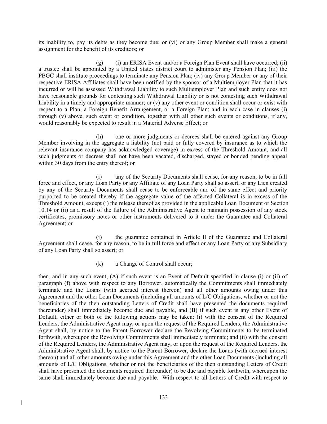 its inability to, pay its debts as they become due; or (vi) or any Group Member shall make a general assignment for the benefit of its creditors; or (g) (i) an ERISA Event and/or a Foreign Plan Event shall have occurred; (ii) a trustee shall be appointed by a United States district court to administer any Pension Plan; (iii) the PBGC shall institute proceedings to terminate any Pension Plan; (iv) any Group Member or any of their respective ERISA Affiliates shall have been notified by the sponsor of a Multiemployer Plan that it has incurred or will be assessed Withdrawal Liability to such Multiemployer Plan and such entity does not have reasonable grounds for contesting such Withdrawal Liability or is not contesting such Withdrawal Liability in a timely and appropriate manner; or (v) any other event or condition shall occur or exist with respect to a Plan, a Foreign Benefit Arrangement, or a Foreign Plan; and in each case in clauses (i) through (v) above, such event or condition, together with all other such events or conditions, if any, would reasonably be expected to result in a Material Adverse Effect; or (h) one or more judgments or decrees shall be entered against any Group Member involving in the aggregate a liability (not paid or fully covered by insurance as to which the relevant insurance company has acknowledged coverage) in excess of the Threshold Amount, and all such judgments or decrees shall not have been vacated, discharged, stayed or bonded pending appeal within 30 days from the entry thereof; or (i) any of the Security Documents shall cease, for any reason, to be in full force and effect, or any Loan Party or any Affiliate of any Loan Party shall so assert, or any Lien created by any of the Security Documents shall cease to be enforceable and of the same effect and priority purported to be created thereby if the aggregate value of the affected Collateral is in excess of the Threshold Amount, except (i) the release thereof as provided in the applicable Loan Document or Section 10.14 or (ii) as a result of the failure of the Administrative Agent to maintain possession of any stock certificates, promissory notes or other instruments delivered to it under the Guarantee and Collateral Agreement; or (j) the guarantee contained in Article II of the Guarantee and Collateral Agreement shall cease, for any reason, to be in full force and effect or any Loan Party or any Subsidiary of any Loan Party shall so assert; or (k) a Change of Control shall occur; then, and in any such event, (A) if such event is an Event of Default specified in clause (i) or (ii) of paragraph (f) above with respect to any Borrower, automatically the Commitments shall immediately terminate and the Loans (with accrued interest thereon) and all other amounts owing under this Agreement and the other Loan Documents (including all amounts of L/C Obligations, whether or not the beneficiaries of the then outstanding Letters of Credit shall have presented the documents required thereunder) shall immediately become due and payable, and (B) if such event is any other Event of Default, either or both of the following actions may be taken: (i) with the consent of the Required Lenders, the Administrative Agent may, or upon the request of the Required Lenders, the Administrative Agent shall, by notice to the Parent Borrower declare the Revolving Commitments to be terminated forthwith, whereupon the Revolving Commitments shall immediately terminate; and (ii) with the consent of the Required Lenders, the Administrative Agent may, or upon the request of the Required Lenders, the Administrative Agent shall, by notice to the Parent Borrower, declare the Loans (with accrued interest thereon) and all other amounts owing under this Agreement and the other Loan Documents (including all amounts of L/C Obligations, whether or not the beneficiaries of the then outstanding Letters of Credit shall have presented the documents required thereunder) to be due and payable forthwith, whereupon the same shall immediately become due and payable. With respect to all Letters of Credit with respect to 133