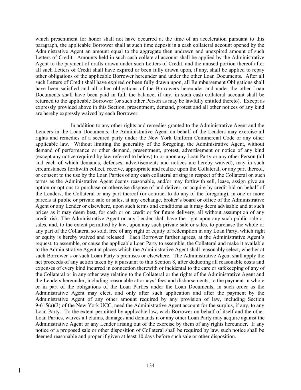 which presentment for honor shall not have occurred at the time of an acceleration pursuant to this paragraph, the applicable Borrower shall at such time deposit in a cash collateral account opened by the Administrative Agent an amount equal to the aggregate then undrawn and unexpired amount of such Letters of Credit. Amounts held in such cash collateral account shall be applied by the Administrative Agent to the payment of drafts drawn under such Letters of Credit, and the unused portion thereof after all such Letters of Credit shall have expired or been fully drawn upon, if any, shall be applied to repay other obligations of the applicable Borrower hereunder and under the other Loan Documents. After all such Letters of Credit shall have expired or been fully drawn upon, all Reimbursement Obligations shall have been satisfied and all other obligations of the Borrowers hereunder and under the other Loan Documents shall have been paid in full, the balance, if any, in such cash collateral account shall be returned to the applicable Borrower (or such other Person as may be lawfully entitled thereto). Except as expressly provided above in this Section, presentment, demand, protest and all other notices of any kind are hereby expressly waived by each Borrower. In addition to any other rights and remedies granted to the Administrative Agent and the Lenders in the Loan Documents, the Administrative Agent on behalf of the Lenders may exercise all rights and remedies of a secured party under the New York Uniform Commercial Code or any other applicable law. Without limiting the generality of the foregoing, the Administrative Agent, without demand of performance or other demand, presentment, protest, advertisement or notice of any kind (except any notice required by law referred to below) to or upon any Loan Party or any other Person (all and each of which demands, defenses, advertisements and notices are hereby waived), may in such circumstances forthwith collect, receive, appropriate and realize upon the Collateral, or any part thereof, or consent to the use by the Loan Parties of any cash collateral arising in respect of the Collateral on such terms as the Administrative Agent deems reasonable, and/or may forthwith sell, lease, assign give an option or options to purchase or otherwise dispose of and deliver, or acquire by credit bid on behalf of the Lenders, the Collateral or any part thereof (or contract to do any of the foregoing), in one or more parcels at public or private sale or sales, at any exchange, broker’s board or office of the Administrative Agent or any Lender or elsewhere, upon such terms and conditions as it may deem advisable and at such prices as it may deem best, for cash or on credit or for future delivery, all without assumption of any credit risk. The Administrative Agent or any Lender shall have the right upon any such public sale or sales, and, to the extent permitted by law, upon any such private sale or sales, to purchase the whole or any part of the Collateral so sold, free of any right or equity of redemption in any Loan Party, which right or equity is hereby waived and released. Each Borrower further agrees, at the Administrative Agent’s request, to assemble, or cause the applicable Loan Party to assemble, the Collateral and make it available to the Administrative Agent at places which the Administrative Agent shall reasonably select, whether at such Borrower’s or such Loan Party’s premises or elsewhere. The Administrative Agent shall apply the net proceeds of any action taken by it pursuant to this Section 8, after deducting all reasonable costs and expenses of every kind incurred in connection therewith or incidental to the care or safekeeping of any of the Collateral or in any other way relating to the Collateral or the rights of the Administrative Agent and the Lenders hereunder, including reasonable attorneys’ fees and disbursements, to the payment in whole or in part of the obligations of the Loan Parties under the Loan Documents, in such order as the Administrative Agent may elect, and only after such application and after the payment by the Administrative Agent of any other amount required by any provision of law, including Section 9-615(a)(3) of the New York UCC, need the Administrative Agent account for the surplus, if any, to any Loan Party. To the extent permitted by applicable law, each Borrower on behalf of itself and the other Loan Parties, waives all claims, damages and demands it or any other Loan Party may acquire against the Administrative Agent or any Lender arising out of the exercise by them of any rights hereunder. If any notice of a proposed sale or other disposition of Collateral shall be required by law, such notice shall be deemed reasonable and proper if given at least 10 days before such sale or other disposition. 134