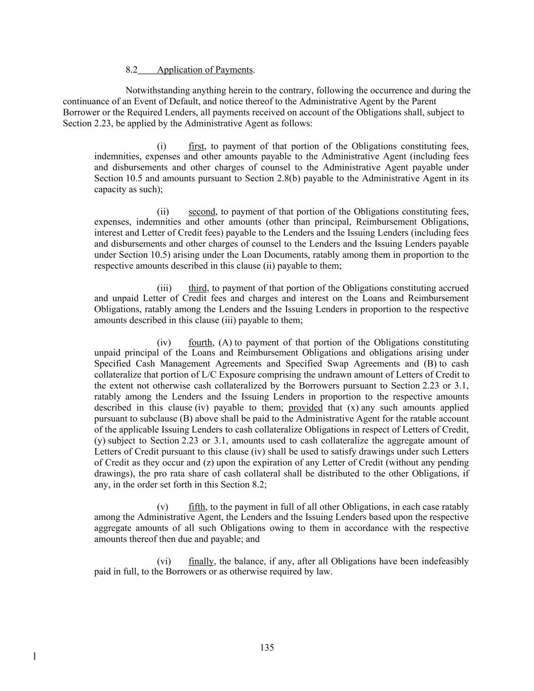 8.2 Application of Payments. Notwithstanding anything herein to the contrary, following the occurrence and during the continuance of an Event of Default, and notice thereof to the Administrative Agent by the Parent Borrower or the Required Lenders, all payments received on account of the Obligations shall, subject to Section 2.23, be applied by the Administrative Agent as follows: (i) first, to payment of that portion of the Obligations constituting fees, indemnities, expenses and other amounts payable to the Administrative Agent (including fees and disbursements and other charges of counsel to the Administrative Agent payable under Section 10.5 and amounts pursuant to Section 2.8(b) payable to the Administrative Agent in its capacity as such); (ii) second, to payment of that portion of the Obligations constituting fees, expenses, indemnities and other amounts (other than principal, Reimbursement Obligations, interest and Letter of Credit fees) payable to the Lenders and the Issuing Lenders (including fees and disbursements and other charges of counsel to the Lenders and the Issuing Lenders payable under Section 10.5) arising under the Loan Documents, ratably among them in proportion to the respective amounts described in this clause (ii) payable to them; (iii) third, to payment of that portion of the Obligations constituting accrued and unpaid Letter of Credit fees and charges and interest on the Loans and Reimbursement Obligations, ratably among the Lenders and the Issuing Lenders in proportion to the respective amounts described in this clause (iii) payable to them; (iv) fourth, (A) to payment of that portion of the Obligations constituting unpaid principal of the Loans and Reimbursement Obligations and obligations arising under Specified Cash Management Agreements and Specified Swap Agreements and (B) to cash collateralize that portion of L/C Exposure comprising the undrawn amount of Letters of Credit to the extent not otherwise cash collateralized by the Borrowers pursuant to Section 2.23 or 3.1, ratably among the Lenders and the Issuing Lenders in proportion to the respective amounts described in this clause (iv) payable to them; provided that (x) any such amounts applied pursuant to subclause (B) above shall be paid to the Administrative Agent for the ratable account of the applicable Issuing Lenders to cash collateralize Obligations in respect of Letters of Credit, (y) subject to Section 2.23 or 3.1, amounts used to cash collateralize the aggregate amount of Letters of Credit pursuant to this clause (iv) shall be used to satisfy drawings under such Letters of Credit as they occur and (z) upon the expiration of any Letter of Credit (without any pending drawings), the pro rata share of cash collateral shall be distributed to the other Obligations, if any, in the order set forth in this Section 8.2; (v) fifth, to the payment in full of all other Obligations, in each case ratably among the Administrative Agent, the Lenders and the Issuing Lenders based upon the respective aggregate amounts of all such Obligations owing to them in accordance with the respective amounts thereof then due and payable; and (vi) finally, the balance, if any, after all Obligations have been indefeasibly paid in full, to the Borrowers or as otherwise required by law. 135
