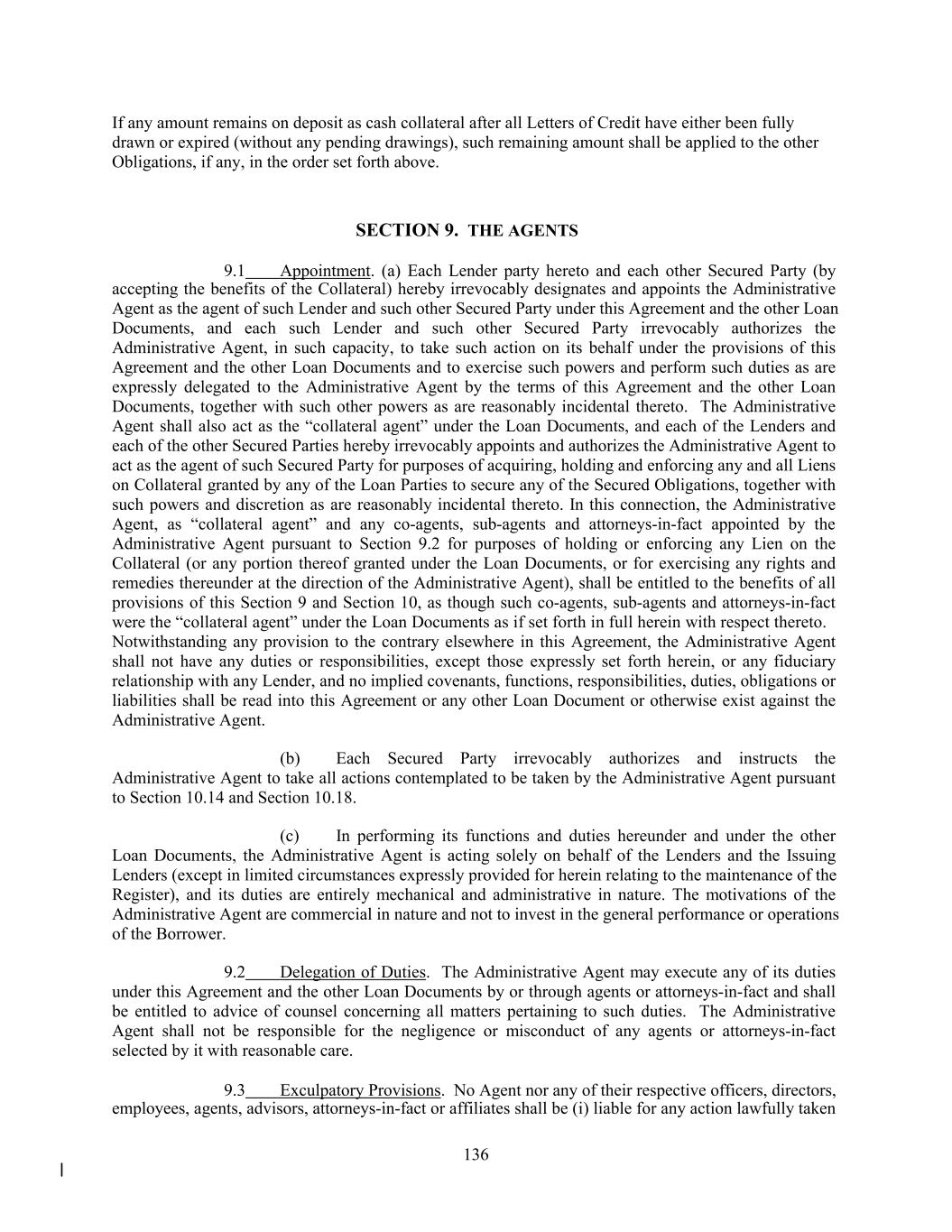 If any amount remains on deposit as cash collateral after all Letters of Credit have either been fully drawn or expired (without any pending drawings), such remaining amount shall be applied to the other Obligations, if any, in the order set forth above. SECTION 9. THE AGENTS 9.1 Appointment. (a) Each Lender party hereto and each other Secured Party (by accepting the benefits of the Collateral) hereby irrevocably designates and appoints the Administrative Agent as the agent of such Lender and such other Secured Party under this Agreement and the other Loan Documents, and each such Lender and such other Secured Party irrevocably authorizes the Administrative Agent, in such capacity, to take such action on its behalf under the provisions of this Agreement and the other Loan Documents and to exercise such powers and perform such duties as are expressly delegated to the Administrative Agent by the terms of this Agreement and the other Loan Documents, together with such other powers as are reasonably incidental thereto. The Administrative Agent shall also act as the “collateral agent” under the Loan Documents, and each of the Lenders and each of the other Secured Parties hereby irrevocably appoints and authorizes the Administrative Agent to act as the agent of such Secured Party for purposes of acquiring, holding and enforcing any and all Liens on Collateral granted by any of the Loan Parties to secure any of the Secured Obligations, together with such powers and discretion as are reasonably incidental thereto. In this connection, the Administrative Agent, as “collateral agent” and any co-agents, sub-agents and attorneys-in-fact appointed by the Administrative Agent pursuant to Section 9.2 for purposes of holding or enforcing any Lien on the Collateral (or any portion thereof granted under the Loan Documents, or for exercising any rights and remedies thereunder at the direction of the Administrative Agent), shall be entitled to the benefits of all provisions of this Section 9 and Section 10, as though such co-agents, sub-agents and attorneys-in-fact were the “collateral agent” under the Loan Documents as if set forth in full herein with respect thereto. Notwithstanding any provision to the contrary elsewhere in this Agreement, the Administrative Agent shall not have any duties or responsibilities, except those expressly set forth herein, or any fiduciary relationship with any Lender, and no implied covenants, functions, responsibilities, duties, obligations or liabilities shall be read into this Agreement or any other Loan Document or otherwise exist against the Administrative Agent. (b) Each Secured Party irrevocably authorizes and instructs the Administrative Agent to take all actions contemplated to be taken by the Administrative Agent pursuant to Section 10.14 and Section 10.18. (c) In performing its functions and duties hereunder and under the other Loan Documents, the Administrative Agent is acting solely on behalf of the Lenders and the Issuing Lenders (except in limited circumstances expressly provided for herein relating to the maintenance of the Register), and its duties are entirely mechanical and administrative in nature. The motivations of the Administrative Agent are commercial in nature and not to invest in the general performance or operations of the Borrower. 9.2 Delegation of Duties. The Administrative Agent may execute any of its duties under this Agreement and the other Loan Documents by or through agents or attorneys-in-fact and shall be entitled to advice of counsel concerning all matters pertaining to such duties. The Administrative Agent shall not be responsible for the negligence or misconduct of any agents or attorneys-in-fact selected by it with reasonable care. 9.3 Exculpatory Provisions. No Agent nor any of their respective officers, directors, employees, agents, advisors, attorneys-in-fact or affiliates shall be (i) liable for any action lawfully taken 136