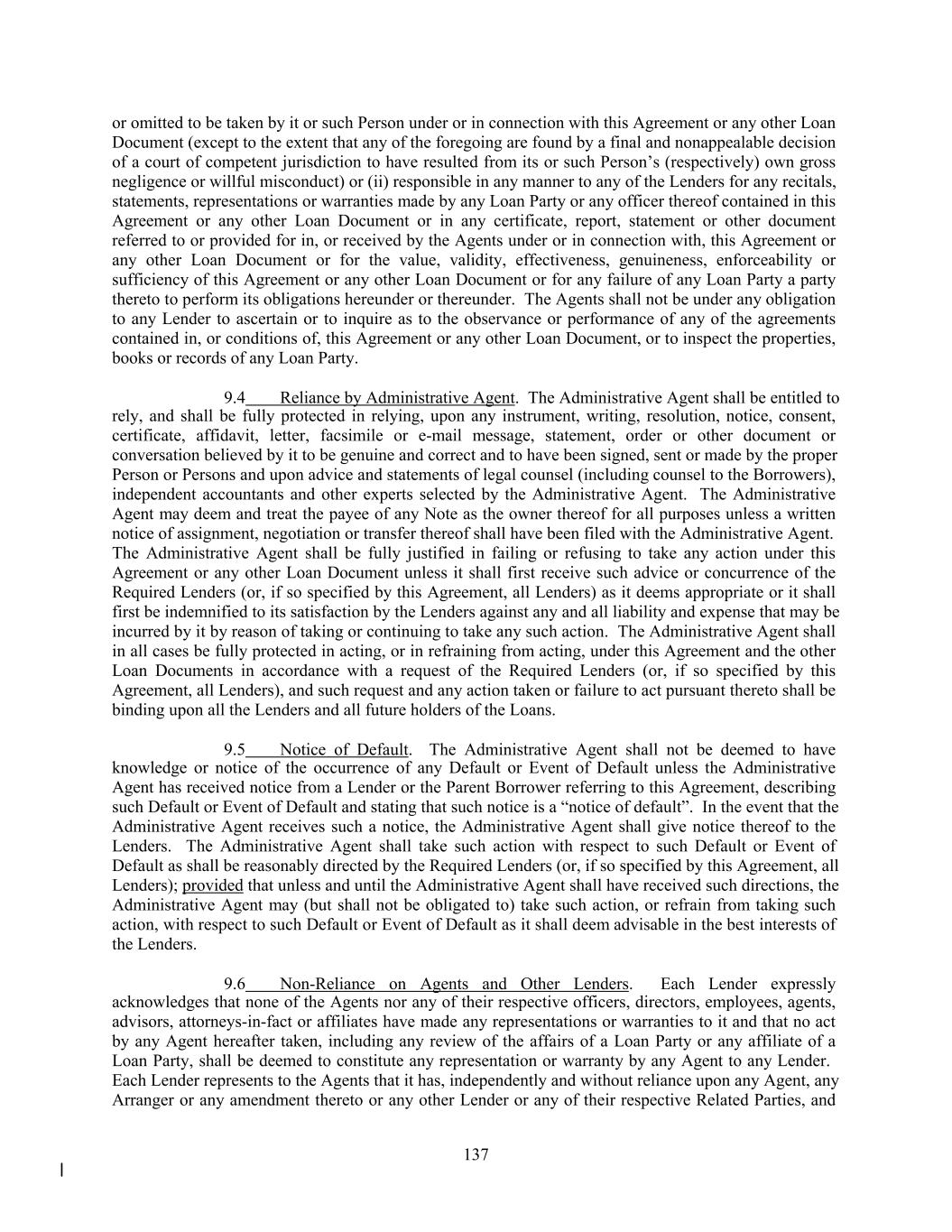 or omitted to be taken by it or such Person under or in connection with this Agreement or any other Loan Document (except to the extent that any of the foregoing are found by a final and nonappealable decision of a court of competent jurisdiction to have resulted from its or such Person’s (respectively) own gross negligence or willful misconduct) or (ii) responsible in any manner to any of the Lenders for any recitals, statements, representations or warranties made by any Loan Party or any officer thereof contained in this Agreement or any other Loan Document or in any certificate, report, statement or other document referred to or provided for in, or received by the Agents under or in connection with, this Agreement or any other Loan Document or for the value, validity, effectiveness, genuineness, enforceability or sufficiency of this Agreement or any other Loan Document or for any failure of any Loan Party a party thereto to perform its obligations hereunder or thereunder. The Agents shall not be under any obligation to any Lender to ascertain or to inquire as to the observance or performance of any of the agreements contained in, or conditions of, this Agreement or any other Loan Document, or to inspect the properties, books or records of any Loan Party. 9.4 Reliance by Administrative Agent. The Administrative Agent shall be entitled to rely, and shall be fully protected in relying, upon any instrument, writing, resolution, notice, consent, certificate, affidavit, letter, facsimile or e-mail message, statement, order or other document or conversation believed by it to be genuine and correct and to have been signed, sent or made by the proper Person or Persons and upon advice and statements of legal counsel (including counsel to the Borrowers), independent accountants and other experts selected by the Administrative Agent. The Administrative Agent may deem and treat the payee of any Note as the owner thereof for all purposes unless a written notice of assignment, negotiation or transfer thereof shall have been filed with the Administrative Agent. The Administrative Agent shall be fully justified in failing or refusing to take any action under this Agreement or any other Loan Document unless it shall first receive such advice or concurrence of the Required Lenders (or, if so specified by this Agreement, all Lenders) as it deems appropriate or it shall first be indemnified to its satisfaction by the Lenders against any and all liability and expense that may be incurred by it by reason of taking or continuing to take any such action. The Administrative Agent shall in all cases be fully protected in acting, or in refraining from acting, under this Agreement and the other Loan Documents in accordance with a request of the Required Lenders (or, if so specified by this Agreement, all Lenders), and such request and any action taken or failure to act pursuant thereto shall be binding upon all the Lenders and all future holders of the Loans. 9.5 Notice of Default. The Administrative Agent shall not be deemed to have knowledge or notice of the occurrence of any Default or Event of Default unless the Administrative Agent has received notice from a Lender or the Parent Borrower referring to this Agreement, describing such Default or Event of Default and stating that such notice is a “notice of default”. In the event that the Administrative Agent receives such a notice, the Administrative Agent shall give notice thereof to the Lenders. The Administrative Agent shall take such action with respect to such Default or Event of Default as shall be reasonably directed by the Required Lenders (or, if so specified by this Agreement, all Lenders); provided that unless and until the Administrative Agent shall have received such directions, the Administrative Agent may (but shall not be obligated to) take such action, or refrain from taking such action, with respect to such Default or Event of Default as it shall deem advisable in the best interests of the Lenders. 9.6 Non-Reliance on Agents and Other Lenders. Each Lender expressly acknowledges that none of the Agents nor any of their respective officers, directors, employees, agents, advisors, attorneys-in-fact or affiliates have made any representations or warranties to it and that no act by any Agent hereafter taken, including any review of the affairs of a Loan Party or any affiliate of a Loan Party, shall be deemed to constitute any representation or warranty by any Agent to any Lender. Each Lender represents to the Agents that it has, independently and without reliance upon any Agent, any Arranger or any amendment thereto or any other Lender or any of their respective Related Parties, and 137