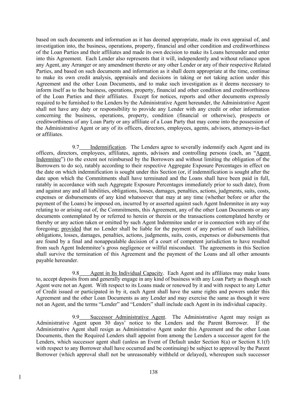 based on such documents and information as it has deemed appropriate, made its own appraisal of, and investigation into, the business, operations, property, financial and other condition and creditworthiness of the Loan Parties and their affiliates and made its own decision to make its Loans hereunder and enter into this Agreement. Each Lender also represents that it will, independently and without reliance upon any Agent, any Arranger or any amendment thereto or any other Lender or any of their respective Related Parties, and based on such documents and information as it shall deem appropriate at the time, continue to make its own credit analysis, appraisals and decisions in taking or not taking action under this Agreement and the other Loan Documents, and to make such investigation as it deems necessary to inform itself as to the business, operations, property, financial and other condition and creditworthiness of the Loan Parties and their affiliates. Except for notices, reports and other documents expressly required to be furnished to the Lenders by the Administrative Agent hereunder, the Administrative Agent shall not have any duty or responsibility to provide any Lender with any credit or other information concerning the business, operations, property, condition (financial or otherwise), prospects or creditworthiness of any Loan Party or any affiliate of a Loan Party that may come into the possession of the Administrative Agent or any of its officers, directors, employees, agents, advisors, attorneys-in-fact or affiliates. 9.7 Indemnification. The Lenders agree to severally indemnify each Agent and its officers, directors, employees, affiliates, agents, advisors and controlling persons (each, an “Agent Indemnitee”) (to the extent not reimbursed by the Borrowers and without limiting the obligation of the Borrowers to do so), ratably according to their respective Aggregate Exposure Percentages in effect on the date on which indemnification is sought under this Section (or, if indemnification is sought after the date upon which the Commitments shall have terminated and the Loans shall have been paid in full, ratably in accordance with such Aggregate Exposure Percentages immediately prior to such date), from and against any and all liabilities, obligations, losses, damages, penalties, actions, judgments, suits, costs, expenses or disbursements of any kind whatsoever that may at any time (whether before or after the payment of the Loans) be imposed on, incurred by or asserted against such Agent Indemnitee in any way relating to or arising out of, the Commitments, this Agreement, any of the other Loan Documents or any documents contemplated by or referred to herein or therein or the transactions contemplated hereby or thereby or any action taken or omitted by such Agent Indemnitee under or in connection with any of the foregoing; provided that no Lender shall be liable for the payment of any portion of such liabilities, obligations, losses, damages, penalties, actions, judgments, suits, costs, expenses or disbursements that are found by a final and nonappealable decision of a court of competent jurisdiction to have resulted from such Agent Indemnitee’s gross negligence or willful misconduct. The agreements in this Section shall survive the termination of this Agreement and the payment of the Loans and all other amounts payable hereunder. 9.8 Agent in Its Individual Capacity. Each Agent and its affiliates may make loans to, accept deposits from and generally engage in any kind of business with any Loan Party as though such Agent were not an Agent. With respect to its Loans made or renewed by it and with respect to any Letter of Credit issued or participated in by it, each Agent shall have the same rights and powers under this Agreement and the other Loan Documents as any Lender and may exercise the same as though it were not an Agent, and the terms “Lender” and “Lenders” shall include each Agent in its individual capacity. 9.9 Successor Administrative Agent. The Administrative Agent may resign as Administrative Agent upon 30 days’ notice to the Lenders and the Parent Borrower. If the Administrative Agent shall resign as Administrative Agent under this Agreement and the other Loan Documents, then the Required Lenders shall appoint from among the Lenders a successor agent for the Lenders, which successor agent shall (unless an Event of Default under Section 8(a) or Section 8.1(f) with respect to any Borrower shall have occurred and be continuing) be subject to approval by the Parent Borrower (which approval shall not be unreasonably withheld or delayed), whereupon such successor 138