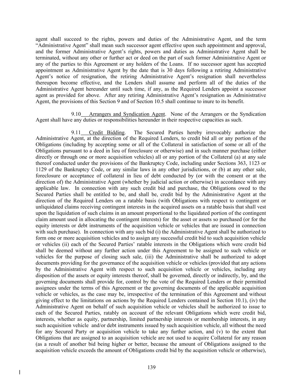 agent shall succeed to the rights, powers and duties of the Administrative Agent, and the term “Administrative Agent” shall mean such successor agent effective upon such appointment and approval, and the former Administrative Agent’s rights, powers and duties as Administrative Agent shall be terminated, without any other or further act or deed on the part of such former Administrative Agent or any of the parties to this Agreement or any holders of the Loans. If no successor agent has accepted appointment as Administrative Agent by the date that is 30 days following a retiring Administrative Agent’s notice of resignation, the retiring Administrative Agent’s resignation shall nevertheless thereupon become effective, and the Lenders shall assume and perform all of the duties of the Administrative Agent hereunder until such time, if any, as the Required Lenders appoint a successor agent as provided for above. After any retiring Administrative Agent’s resignation as Administrative Agent, the provisions of this Section 9 and of Section 10.5 shall continue to inure to its benefit. 9.10 Arrangers and Syndication Agent. None of the Arrangers or the Syndication Agent shall have any duties or responsibilities hereunder in their respective capacities as such. 9.11 Credit Bidding. The Secured Parties hereby irrevocably authorize the Administrative Agent, at the direction of the Required Lenders, to credit bid all or any portion of the Obligations (including by accepting some or all of the Collateral in satisfaction of some or all of the Obligations pursuant to a deed in lieu of foreclosure or otherwise) and in such manner purchase (either directly or through one or more acquisition vehicles) all or any portion of the Collateral (a) at any sale thereof conducted under the provisions of the Bankruptcy Code, including under Sections 363, 1123 or 1129 of the Bankruptcy Code, or any similar laws in any other jurisdictions, or (b) at any other sale, foreclosure or acceptance of collateral in lieu of debt conducted by (or with the consent or at the direction of) the Administrative Agent (whether by judicial action or otherwise) in accordance with any applicable law. In connection with any such credit bid and purchase, the Obligations owed to the Secured Parties shall be entitled to be, and shall be, credit bid by the Administrative Agent at the direction of the Required Lenders on a ratable basis (with Obligations with respect to contingent or unliquidated claims receiving contingent interests in the acquired assets on a ratable basis that shall vest upon the liquidation of such claims in an amount proportional to the liquidated portion of the contingent claim amount used in allocating the contingent interests) for the asset or assets so purchased (or for the equity interests or debt instruments of the acquisition vehicle or vehicles that are issued in connection with such purchase). In connection with any such bid (i) the Administrative Agent shall be authorized to form one or more acquisition vehicles and to assign any successful credit bid to such acquisition vehicle or vehicles (ii) each of the Secured Parties’ ratable interests in the Obligations which were credit bid shall be deemed without any further action under this Agreement to be assigned to such vehicle or vehicles for the purpose of closing such sale, (iii) the Administrative shall be authorized to adopt documents providing for the governance of the acquisition vehicle or vehicles (provided that any actions by the Administrative Agent with respect to such acquisition vehicle or vehicles, including any disposition of the assets or equity interests thereof, shall be governed, directly or indirectly, by, and the governing documents shall provide for, control by the vote of the Required Lenders or their permitted assignees under the terms of this Agreement or the governing documents of the applicable acquisition vehicle or vehicles, as the case may be, irrespective of the termination of this Agreement and without giving effect to the limitations on actions by the Required Lenders contained in Section 10.1), (iv) the Administrative Agent on behalf of such acquisition vehicle or vehicles shall be authorized to issue to each of the Secured Parties, ratably on account of the relevant Obligations which were credit bid, interests, whether as equity, partnership, limited partnership interests or membership interests, in any such acquisition vehicle and/or debt instruments issued by such acquisition vehicle, all without the need for any Secured Party or acquisition vehicle to take any further action, and (v) to the extent that Obligations that are assigned to an acquisition vehicle are not used to acquire Collateral for any reason (as a result of another bid being higher or better, because the amount of Obligations assigned to the acquisition vehicle exceeds the amount of Obligations credit bid by the acquisition vehicle or otherwise), 139