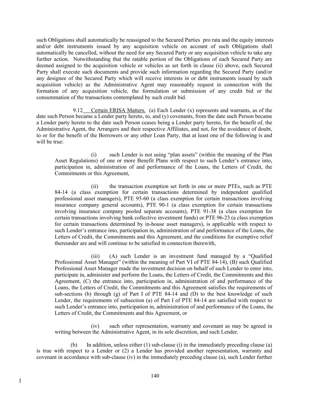such Obligations shall automatically be reassigned to the Secured Parties pro rata and the equity interests and/or debt instruments issued by any acquisition vehicle on account of such Obligations shall automatically be cancelled, without the need for any Secured Party or any acquisition vehicle to take any further action. Notwithstanding that the ratable portion of the Obligations of each Secured Party are deemed assigned to the acquisition vehicle or vehicles as set forth in clause (ii) above, each Secured Party shall execute such documents and provide such information regarding the Secured Party (and/or any designee of the Secured Party which will receive interests in or debt instruments issued by such acquisition vehicle) as the Administrative Agent may reasonably request in connection with the formation of any acquisition vehicle, the formulation or submission of any credit bid or the consummation of the transactions contemplated by such credit bid. 9.12 Certain ERISA Matters. (a) Each Lender (x) represents and warrants, as of the date such Person became a Lender party hereto, to, and (y) covenants, from the date such Person became a Lender party hereto to the date such Person ceases being a Lender party hereto, for the benefit of, the Administrative Agent, the Arrangers and their respective Affiliates, and not, for the avoidance of doubt, to or for the benefit of the Borrowers or any other Loan Party, that at least one of the following is and will be true: (i) such Lender is not using “plan assets” (within the meaning of the Plan Asset Regulations) of one or more Benefit Plans with respect to such Lender’s entrance into, participation in, administration of and performance of the Loans, the Letters of Credit, the Commitments or this Agreement, (ii) the transaction exemption set forth in one or more PTEs, such as PTE 84-14 (a class exemption for certain transactions determined by independent qualified professional asset managers), PTE 95-60 (a class exemption for certain transactions involving insurance company general accounts), PTE 90-1 (a class exemption for certain transactions involving insurance company pooled separate accounts), PTE 91-38 (a class exemption for certain transactions involving bank collective investment funds) or PTE 96-23 (a class exemption for certain transactions determined by in-house asset managers), is applicable with respect to such Lender’s entrance into, participation in, administration of and performance of the Loans, the Letters of Credit, the Commitments and this Agreement, and the conditions for exemptive relief thereunder are and will continue to be satisfied in connection therewith, (iii) (A) such Lender is an investment fund managed by a “Qualified Professional Asset Manager” (within the meaning of Part VI of PTE 84-14), (B) such Qualified Professional Asset Manager made the investment decision on behalf of such Lender to enter into, participate in, administer and perform the Loans, the Letters of Credit, the Commitments and this Agreement, (C) the entrance into, participation in, administration of and performance of the Loans, the Letters of Credit, the Commitments and this Agreement satisfies the requirements of sub-sections (b) through (g) of Part I of PTE 84-14 and (D) to the best knowledge of such Lender, the requirements of subsection (a) of Part I of PTE 84-14 are satisfied with respect to such Lender’s entrance into, participation in, administration of and performance of the Loans, the Letters of Credit, the Commitments and this Agreement, or (iv) such other representation, warranty and covenant as may be agreed in writing between the Administrative Agent, in its sole discretion, and such Lender. (b) In addition, unless either (1) sub-clause (i) in the immediately preceding clause (a) is true with respect to a Lender or (2) a Lender has provided another representation, warranty and covenant in accordance with sub-clause (iv) in the immediately preceding clause (a), such Lender further 140