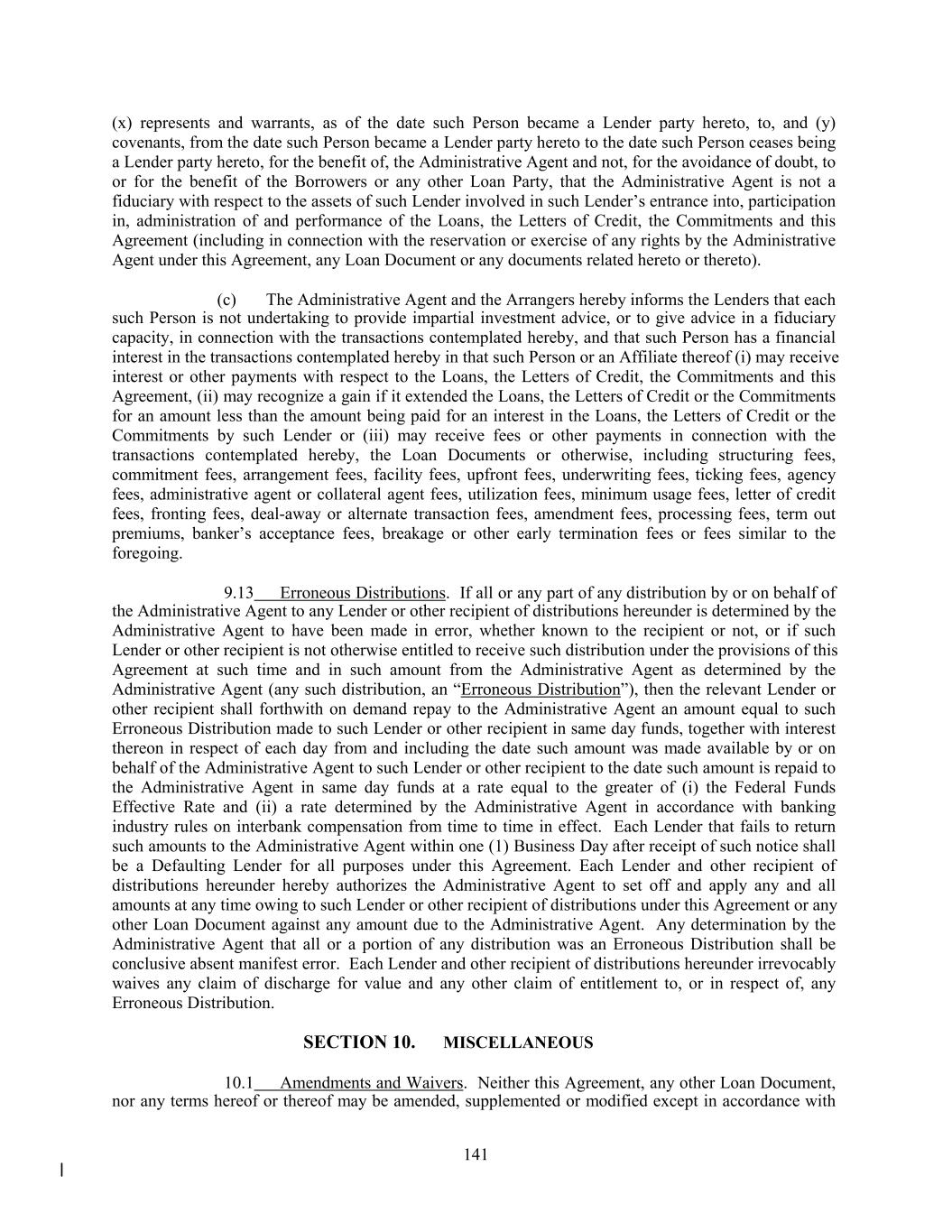 (x) represents and warrants, as of the date such Person became a Lender party hereto, to, and (y) covenants, from the date such Person became a Lender party hereto to the date such Person ceases being a Lender party hereto, for the benefit of, the Administrative Agent and not, for the avoidance of doubt, to or for the benefit of the Borrowers or any other Loan Party, that the Administrative Agent is not a fiduciary with respect to the assets of such Lender involved in such Lender’s entrance into, participation in, administration of and performance of the Loans, the Letters of Credit, the Commitments and this Agreement (including in connection with the reservation or exercise of any rights by the Administrative Agent under this Agreement, any Loan Document or any documents related hereto or thereto). (c) The Administrative Agent and the Arrangers hereby informs the Lenders that each such Person is not undertaking to provide impartial investment advice, or to give advice in a fiduciary capacity, in connection with the transactions contemplated hereby, and that such Person has a financial interest in the transactions contemplated hereby in that such Person or an Affiliate thereof (i) may receive interest or other payments with respect to the Loans, the Letters of Credit, the Commitments and this Agreement, (ii) may recognize a gain if it extended the Loans, the Letters of Credit or the Commitments for an amount less than the amount being paid for an interest in the Loans, the Letters of Credit or the Commitments by such Lender or (iii) may receive fees or other payments in connection with the transactions contemplated hereby, the Loan Documents or otherwise, including structuring fees, commitment fees, arrangement fees, facility fees, upfront fees, underwriting fees, ticking fees, agency fees, administrative agent or collateral agent fees, utilization fees, minimum usage fees, letter of credit fees, fronting fees, deal-away or alternate transaction fees, amendment fees, processing fees, term out premiums, banker’s acceptance fees, breakage or other early termination fees or fees similar to the foregoing. 9.13 Erroneous Distributions. If all or any part of any distribution by or on behalf of the Administrative Agent to any Lender or other recipient of distributions hereunder is determined by the Administrative Agent to have been made in error, whether known to the recipient or not, or if such Lender or other recipient is not otherwise entitled to receive such distribution under the provisions of this Agreement at such time and in such amount from the Administrative Agent as determined by the Administrative Agent (any such distribution, an “Erroneous Distribution”), then the relevant Lender or other recipient shall forthwith on demand repay to the Administrative Agent an amount equal to such Erroneous Distribution made to such Lender or other recipient in same day funds, together with interest thereon in respect of each day from and including the date such amount was made available by or on behalf of the Administrative Agent to such Lender or other recipient to the date such amount is repaid to the Administrative Agent in same day funds at a rate equal to the greater of (i) the Federal Funds Effective Rate and (ii) a rate determined by the Administrative Agent in accordance with banking industry rules on interbank compensation from time to time in effect. Each Lender that fails to return such amounts to the Administrative Agent within one (1) Business Day after receipt of such notice shall be a Defaulting Lender for all purposes under this Agreement. Each Lender and other recipient of distributions hereunder hereby authorizes the Administrative Agent to set off and apply any and all amounts at any time owing to such Lender or other recipient of distributions under this Agreement or any other Loan Document against any amount due to the Administrative Agent. Any determination by the Administrative Agent that all or a portion of any distribution was an Erroneous Distribution shall be conclusive absent manifest error. Each Lender and other recipient of distributions hereunder irrevocably waives any claim of discharge for value and any other claim of entitlement to, or in respect of, any Erroneous Distribution. SECTION 10. MISCELLANEOUS 10.1 Amendments and Waivers. Neither this Agreement, any other Loan Document, nor any terms hereof or thereof may be amended, supplemented or modified except in accordance with 141
