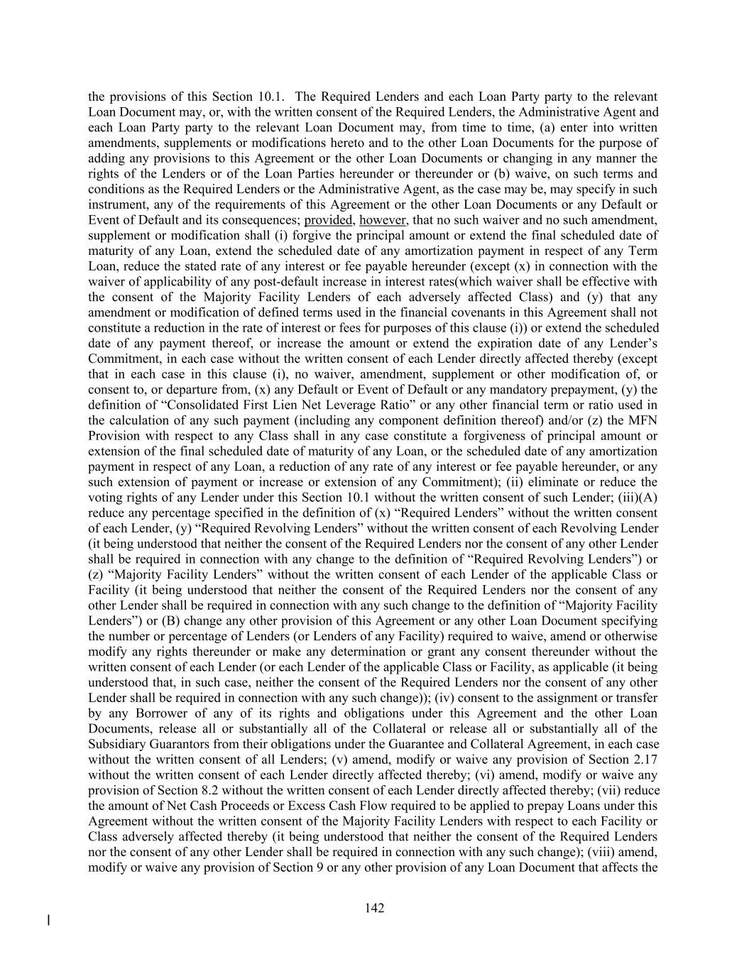 the provisions of this Section 10.1. The Required Lenders and each Loan Party party to the relevant Loan Document may, or, with the written consent of the Required Lenders, the Administrative Agent and each Loan Party party to the relevant Loan Document may, from time to time, (a) enter into written amendments, supplements or modifications hereto and to the other Loan Documents for the purpose of adding any provisions to this Agreement or the other Loan Documents or changing in any manner the rights of the Lenders or of the Loan Parties hereunder or thereunder or (b) waive, on such terms and conditions as the Required Lenders or the Administrative Agent, as the case may be, may specify in such instrument, any of the requirements of this Agreement or the other Loan Documents or any Default or Event of Default and its consequences; provided, however, that no such waiver and no such amendment, supplement or modification shall (i) forgive the principal amount or extend the final scheduled date of maturity of any Loan, extend the scheduled date of any amortization payment in respect of any Term Loan, reduce the stated rate of any interest or fee payable hereunder (except (x) in connection with the waiver of applicability of any post-default increase in interest rates(which waiver shall be effective with the consent of the Majority Facility Lenders of each adversely affected Class) and (y) that any amendment or modification of defined terms used in the financial covenants in this Agreement shall not constitute a reduction in the rate of interest or fees for purposes of this clause (i)) or extend the scheduled date of any payment thereof, or increase the amount or extend the expiration date of any Lender’s Commitment, in each case without the written consent of each Lender directly affected thereby (except that in each case in this clause (i), no waiver, amendment, supplement or other modification of, or consent to, or departure from, (x) any Default or Event of Default or any mandatory prepayment, (y) the definition of “Consolidated First Lien Net Leverage Ratio” or any other financial term or ratio used in the calculation of any such payment (including any component definition thereof) and/or (z) the MFN Provision with respect to any Class shall in any case constitute a forgiveness of principal amount or extension of the final scheduled date of maturity of any Loan, or the scheduled date of any amortization payment in respect of any Loan, a reduction of any rate of any interest or fee payable hereunder, or any such extension of payment or increase or extension of any Commitment); (ii) eliminate or reduce the voting rights of any Lender under this Section 10.1 without the written consent of such Lender; (iii)(A) reduce any percentage specified in the definition of (x) “Required Lenders” without the written consent of each Lender, (y) “Required Revolving Lenders” without the written consent of each Revolving Lender (it being understood that neither the consent of the Required Lenders nor the consent of any other Lender shall be required in connection with any change to the definition of “Required Revolving Lenders”) or (z) “Majority Facility Lenders” without the written consent of each Lender of the applicable Class or Facility (it being understood that neither the consent of the Required Lenders nor the consent of any other Lender shall be required in connection with any such change to the definition of “Majority Facility Lenders”) or (B) change any other provision of this Agreement or any other Loan Document specifying the number or percentage of Lenders (or Lenders of any Facility) required to waive, amend or otherwise modify any rights thereunder or make any determination or grant any consent thereunder without the written consent of each Lender (or each Lender of the applicable Class or Facility, as applicable (it being understood that, in such case, neither the consent of the Required Lenders nor the consent of any other Lender shall be required in connection with any such change)); (iv) consent to the assignment or transfer by any Borrower of any of its rights and obligations under this Agreement and the other Loan Documents, release all or substantially all of the Collateral or release all or substantially all of the Subsidiary Guarantors from their obligations under the Guarantee and Collateral Agreement, in each case without the written consent of all Lenders; (v) amend, modify or waive any provision of Section 2.17 without the written consent of each Lender directly affected thereby; (vi) amend, modify or waive any provision of Section 8.2 without the written consent of each Lender directly affected thereby; (vii) reduce the amount of Net Cash Proceeds or Excess Cash Flow required to be applied to prepay Loans under this Agreement without the written consent of the Majority Facility Lenders with respect to each Facility or Class adversely affected thereby (it being understood that neither the consent of the Required Lenders nor the consent of any other Lender shall be required in connection with any such change); (viii) amend, modify or waive any provision of Section 9 or any other provision of any Loan Document that affects the 142