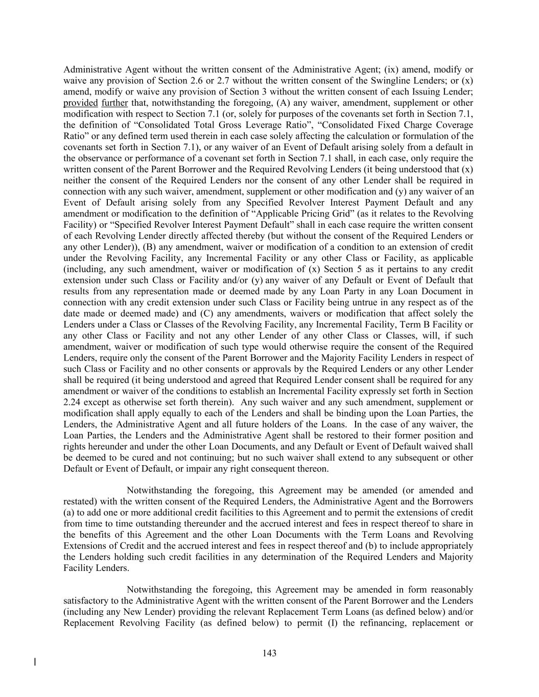 Administrative Agent without the written consent of the Administrative Agent; (ix) amend, modify or waive any provision of Section 2.6 or 2.7 without the written consent of the Swingline Lenders; or (x) amend, modify or waive any provision of Section 3 without the written consent of each Issuing Lender; provided further that, notwithstanding the foregoing, (A) any waiver, amendment, supplement or other modification with respect to Section 7.1 (or, solely for purposes of the covenants set forth in Section 7.1, the definition of “Consolidated Total Gross Leverage Ratio”, “Consolidated Fixed Charge Coverage Ratio” or any defined term used therein in each case solely affecting the calculation or formulation of the covenants set forth in Section 7.1), or any waiver of an Event of Default arising solely from a default in the observance or performance of a covenant set forth in Section 7.1 shall, in each case, only require the written consent of the Parent Borrower and the Required Revolving Lenders (it being understood that (x) neither the consent of the Required Lenders nor the consent of any other Lender shall be required in connection with any such waiver, amendment, supplement or other modification and (y) any waiver of an Event of Default arising solely from any Specified Revolver Interest Payment Default and any amendment or modification to the definition of “Applicable Pricing Grid” (as it relates to the Revolving Facility) or “Specified Revolver Interest Payment Default” shall in each case require the written consent of each Revolving Lender directly affected thereby (but without the consent of the Required Lenders or any other Lender)), (B) any amendment, waiver or modification of a condition to an extension of credit under the Revolving Facility, any Incremental Facility or any other Class or Facility, as applicable (including, any such amendment, waiver or modification of (x) Section 5 as it pertains to any credit extension under such Class or Facility and/or (y) any waiver of any Default or Event of Default that results from any representation made or deemed made by any Loan Party in any Loan Document in connection with any credit extension under such Class or Facility being untrue in any respect as of the date made or deemed made) and (C) any amendments, waivers or modification that affect solely the Lenders under a Class or Classes of the Revolving Facility, any Incremental Facility, Term B Facility or any other Class or Facility and not any other Lender of any other Class or Classes, will, if such amendment, waiver or modification of such type would otherwise require the consent of the Required Lenders, require only the consent of the Parent Borrower and the Majority Facility Lenders in respect of such Class or Facility and no other consents or approvals by the Required Lenders or any other Lender shall be required (it being understood and agreed that Required Lender consent shall be required for any amendment or waiver of the conditions to establish an Incremental Facility expressly set forth in Section 2.24 except as otherwise set forth therein). Any such waiver and any such amendment, supplement or modification shall apply equally to each of the Lenders and shall be binding upon the Loan Parties, the Lenders, the Administrative Agent and all future holders of the Loans. In the case of any waiver, the Loan Parties, the Lenders and the Administrative Agent shall be restored to their former position and rights hereunder and under the other Loan Documents, and any Default or Event of Default waived shall be deemed to be cured and not continuing; but no such waiver shall extend to any subsequent or other Default or Event of Default, or impair any right consequent thereon. Notwithstanding the foregoing, this Agreement may be amended (or amended and restated) with the written consent of the Required Lenders, the Administrative Agent and the Borrowers (a) to add one or more additional credit facilities to this Agreement and to permit the extensions of credit from time to time outstanding thereunder and the accrued interest and fees in respect thereof to share in the benefits of this Agreement and the other Loan Documents with the Term Loans and Revolving Extensions of Credit and the accrued interest and fees in respect thereof and (b) to include appropriately the Lenders holding such credit facilities in any determination of the Required Lenders and Majority Facility Lenders. Notwithstanding the foregoing, this Agreement may be amended in form reasonably satisfactory to the Administrative Agent with the written consent of the Parent Borrower and the Lenders (including any New Lender) providing the relevant Replacement Term Loans (as defined below) and/or Replacement Revolving Facility (as defined below) to permit (I) the refinancing, replacement or 143
