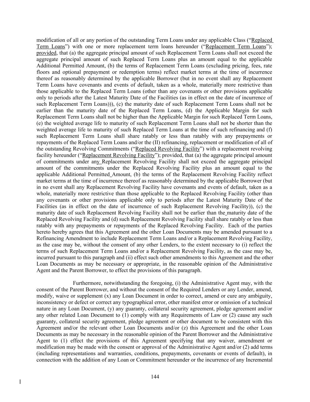 modification of all or any portion of the outstanding Term Loans under any applicable Class (“Replaced Term Loans”) with one or more replacement term loans hereunder (“Replacement Term Loans”); provided, that (a) the aggregate principal amount of such Replacement Term Loans shall not exceed the aggregate principal amount of such Replaced Term Loans plus an amount equal to the applicable Additional Permitted Amount, (b) the terms of Replacement Term Loans (excluding pricing, fees, rate floors and optional prepayment or redemption terms) reflect market terms at the time of incurrence thereof as reasonably determined by the applicable Borrower (but in no event shall any Replacement Term Loans have covenants and events of default, taken as a whole, materially more restrictive than those applicable to the Replaced Term Loans (other than any covenants or other provisions applicable only to periods after the Latest Maturity Date of the Facilities (as in effect on the date of incurrence of such Replacement Term Loans))), (c) the maturity date of such Replacement Term Loans shall not be earlier than the maturity date of the Replaced Term Loans, (d) the Applicable Margin for such Replacement Term Loans shall not be higher than the Applicable Margin for such Replaced Term Loans, (e) the weighted average life to maturity of such Replacement Term Loans shall not be shorter than the weighted average life to maturity of such Replaced Term Loans at the time of such refinancing and (f) such Replacement Term Loans shall share ratably or less than ratably with any prepayments or repayments of the Replaced Term Loans and/or the (II) refinancing, replacement or modification of all of the outstanding Revolving Commitments (“Replaced Revolving Facility”) with a replacement revolving facility hereunder (“Replacement Revolving Facility”); provided, that (a) the aggregate principal amount of commitments under any Replacement Revolving Facility shall not exceed the aggregate principal amount of the commitments under the Replaced Revolving Facility plus an amount equal to the applicable Additional Permitted Amount, (b) the terms of the Replacement Revolving Facility reflect market terms at the time of incurrence thereof as reasonably determined by the applicable Borrower (but in no event shall any Replacement Revolving Facility have covenants and events of default, taken as a whole, materially more restrictive than those applicable to the Replaced Revolving Facility (other than any covenants or other provisions applicable only to periods after the Latest Maturity Date of the Facilities (as in effect on the date of incurrence of such Replacement Revolving Facility)), (c) the maturity date of such Replacement Revolving Facility shall not be earlier than the maturity date of the Replaced Revolving Facility and (d) such Replacement Revolving Facility shall share ratably or less than ratably with any prepayments or repayments of the Replaced Revolving Facility. Each of the parties hereto hereby agrees that this Agreement and the other Loan Documents may be amended pursuant to a Refinancing Amendment to include Replacement Term Loans and/or a Replacement Revolving Facility, as the case may be, without the consent of any other Lenders, to the extent necessary to (i) reflect the terms of such Replacement Term Loans and/or a Replacement Revolving Facility, as the case may be, incurred pursuant to this paragraph and (ii) effect such other amendments to this Agreement and the other Loan Documents as may be necessary or appropriate, in the reasonable opinion of the Administrative Agent and the Parent Borrower, to effect the provisions of this paragraph. Furthermore, notwithstanding the foregoing, (i) the Administrative Agent may, with the consent of the Parent Borrower, and without the consent of the Required Lenders or any Lender, amend, modify, waive or supplement (x) any Loan Document in order to correct, amend or cure any ambiguity, inconsistency or defect or correct any typographical error, other manifest error or omission of a technical nature in any Loan Document, (y) any guaranty, collateral security agreement, pledge agreement and/or any other related Loan Document to (1) comply with any Requirements of Law or (2) cause any such guaranty, collateral security agreement, pledge agreement or other document to be consistent with this Agreement and/or the relevant other Loan Documents and/or (z) this Agreement and the other Loan Documents as may be necessary in the reasonable opinion of the Parent Borrower and the Administrative Agent to (1) effect the provisions of this Agreement specifying that any waiver, amendment or modification may be made with the consent or approval of the Administrative Agent and/or (2) add terms (including representations and warranties, conditions, prepayments, covenants or events of default), in connection with the addition of any Loan or Commitment hereunder or the incurrence of any Incremental 144