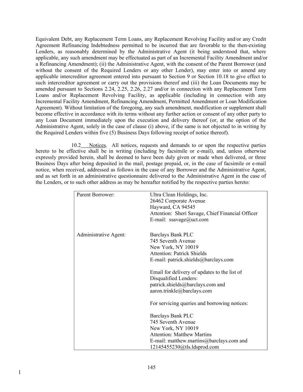 145 Ultra Clean Holdings, Inc. 26462 Corporate Avenue Hayward, CA 94545 Attention: Sheri Savage, Chief Financial Officer E-mail: ssavage@uct.com Equivalent Debt, any Replacement Term Loans, any Replacement Revolving Facility and/or any Credit Agreement Refinancing Indebtedness permitted to be incurred that are favorable to the then-existing Lenders, as reasonably determined by the Administrative Agent (it being understood that, where applicable, any such amendment may be effectuated as part of an Incremental Facility Amendment and/or a Refinancing Amendment); (ii) the Administrative Agent, with the consent of the Parent Borrower (and without the consent of the Required Lenders or any other Lender), may enter into or amend any applicable intercreditor agreement entered into pursuant to Section 9 or Section 10.18 to give effect to such intercreditor agreement or carry out the provisions thereof and (iii) the Loan Documents may be amended pursuant to Sections 2.24, 2.25, 2.26, 2.27 and/or in connection with any Replacement Term Loans and/or Replacement Revolving Facility, as applicable (including in connection with any Incremental Facility Amendment, Refinancing Amendment, Permitted Amendment or Loan Modification Agreement). Without limitation of the foregoing, any such amendment, modification or supplement shall become effective in accordance with its terms without any further action or consent of any other party to any Loan Document immediately upon the execution and delivery thereof (or, at the option of the Administrative Agent, solely in the case of clause (i) above, if the same is not objected to in writing by the Required Lenders within five (5) Business Days following receipt of notice thereof). 10.2 Notices. All notices, requests and demands to or upon the respective parties hereto to be effective shall be in writing (including by facsimile or e-mail), and, unless otherwise expressly provided herein, shall be deemed to have been duly given or made when delivered, or three Business Days after being deposited in the mail, postage prepaid, or, in the case of facsimile or e-mail notice, when received, addressed as follows in the case of any Borrower and the Administrative Agent, and as set forth in an administrative questionnaire delivered to the Administrative Agent in the case of the Lenders, or to such other address as may be hereafter notified by the respective parties hereto: Administrative Agent: Barclays Bank PLC 745 Seventh Avenue New York, NY 10019 Attention: Patrick Shields E-mail: patrick.shields@barclays.com Email for delivery of updates to the list of Disqualified Lenders: patrick.shields@barclays.com and aaron.trinkle@barclays.com For servicing queries and borrowing notices: Barclays Bank PLC 745 Seventh Avenue New York, NY 10019 Attention: Matthew Martins E-mail: matthew.martins@barclays.com and 12145455230@tls.ldsprod.com Parent Borrower: