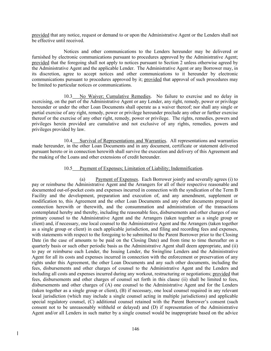 provided that any notice, request or demand to or upon the Administrative Agent or the Lenders shall not be effective until received. Notices and other communications to the Lenders hereunder may be delivered or furnished by electronic communications pursuant to procedures approved by the Administrative Agent; provided that the foregoing shall not apply to notices pursuant to Section 2 unless otherwise agreed by the Administrative Agent and the applicable Lender. The Administrative Agent or any Borrower may, in its discretion, agree to accept notices and other communications to it hereunder by electronic communications pursuant to procedures approved by it; provided that approval of such procedures may be limited to particular notices or communications. 10.3 No Waiver; Cumulative Remedies. No failure to exercise and no delay in exercising, on the part of the Administrative Agent or any Lender, any right, remedy, power or privilege hereunder or under the other Loan Documents shall operate as a waiver thereof; nor shall any single or partial exercise of any right, remedy, power or privilege hereunder preclude any other or further exercise thereof or the exercise of any other right, remedy, power or privilege. The rights, remedies, powers and privileges herein provided are cumulative and not exclusive of any rights, remedies, powers and privileges provided by law. 10.4 Survival of Representations and Warranties. All representations and warranties made hereunder, in the other Loan Documents and in any document, certificate or statement delivered pursuant hereto or in connection herewith shall survive the execution and delivery of this Agreement and the making of the Loans and other extensions of credit hereunder. 10.5 Payment of Expenses; Limitation of Liability; Indemnification. (a) Payment of Expenses. Each Borrower jointly and severally agrees (i) to pay or reimburse the Administrative Agent and the Arrangers for all of their respective reasonable and documented out-of-pocket costs and expenses incurred in connection with the syndication of the Term B Facility and the development, preparation and execution of, and any amendment, supplement or modification to, this Agreement and the other Loan Documents and any other documents prepared in connection herewith or therewith, and the consummation and administration of the transactions contemplated hereby and thereby, including the reasonable fees, disbursements and other charges of one primary counsel to the Administrative Agent and the Arrangers (taken together as a single group or client) and, if necessary, one local counsel to the Administrative Agent and the Arrangers (taken together as a single group or client) in each applicable jurisdiction, and filing and recording fees and expenses, with statements with respect to the foregoing to be submitted to the Parent Borrower prior to the Closing Date (in the case of amounts to be paid on the Closing Date) and from time to time thereafter on a quarterly basis or such other periodic basis as the Administrative Agent shall deem appropriate, and (ii) to pay or reimburse each Lender, the Issuing Lender, the Swingline Lenders and the Administrative Agent for all its costs and expenses incurred in connection with the enforcement or preservation of any rights under this Agreement, the other Loan Documents and any such other documents, including the fees, disbursements and other charges of counsel to the Administrative Agent and the Lenders and including all costs and expenses incurred during any workout, restructuring or negotiations; provided that fees, disbursements and other charges of counsel set forth in this clause (ii) shall be limited to fees, disbursements and other charges of (A) one counsel to the Administrative Agent and for the Lenders (taken together as a single group or client), (B) if necessary, one local counsel required in any relevant local jurisdiction (which may include a single counsel acting in multiple jurisdictions) and applicable special regulatory counsel, (C) additional counsel retained with the Parent Borrower’s consent (such consent not to be unreasonably withheld or delayed) and (D) if representation of the Administrative Agent and/or all Lenders in such matter by a single counsel would be inappropriate based on the advice 146