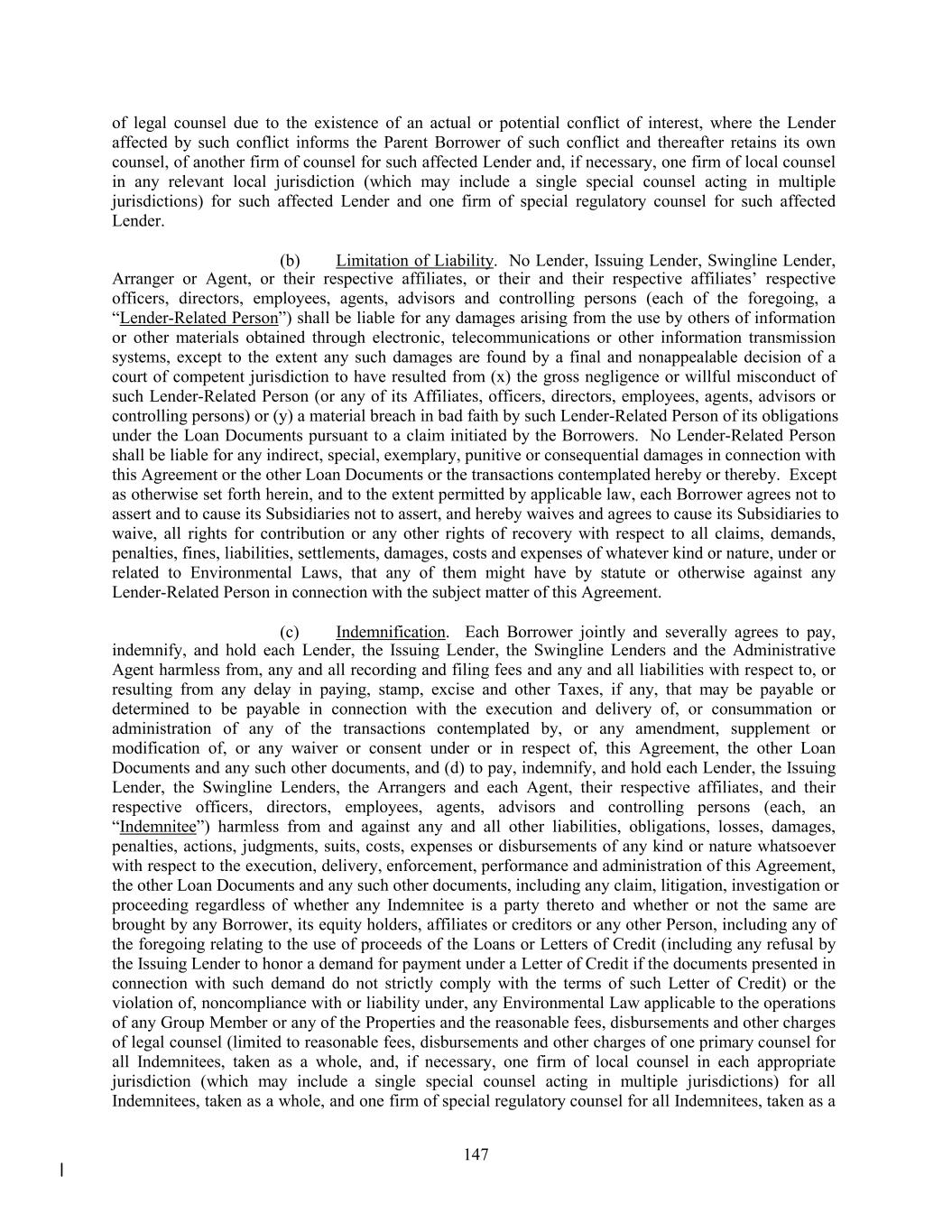 of legal counsel due to the existence of an actual or potential conflict of interest, where the Lender affected by such conflict informs the Parent Borrower of such conflict and thereafter retains its own counsel, of another firm of counsel for such affected Lender and, if necessary, one firm of local counsel in any relevant local jurisdiction (which may include a single special counsel acting in multiple jurisdictions) for such affected Lender and one firm of special regulatory counsel for such affected Lender. (b) Limitation of Liability. No Lender, Issuing Lender, Swingline Lender, Arranger or Agent, or their respective affiliates, or their and their respective affiliates’ respective officers, directors, employees, agents, advisors and controlling persons (each of the foregoing, a “Lender-Related Person”) shall be liable for any damages arising from the use by others of information or other materials obtained through electronic, telecommunications or other information transmission systems, except to the extent any such damages are found by a final and nonappealable decision of a court of competent jurisdiction to have resulted from (x) the gross negligence or willful misconduct of such Lender-Related Person (or any of its Affiliates, officers, directors, employees, agents, advisors or controlling persons) or (y) a material breach in bad faith by such Lender-Related Person of its obligations under the Loan Documents pursuant to a claim initiated by the Borrowers. No Lender-Related Person shall be liable for any indirect, special, exemplary, punitive or consequential damages in connection with this Agreement or the other Loan Documents or the transactions contemplated hereby or thereby. Except as otherwise set forth herein, and to the extent permitted by applicable law, each Borrower agrees not to assert and to cause its Subsidiaries not to assert, and hereby waives and agrees to cause its Subsidiaries to waive, all rights for contribution or any other rights of recovery with respect to all claims, demands, penalties, fines, liabilities, settlements, damages, costs and expenses of whatever kind or nature, under or related to Environmental Laws, that any of them might have by statute or otherwise against any Lender-Related Person in connection with the subject matter of this Agreement. (c) Indemnification. Each Borrower jointly and severally agrees to pay, indemnify, and hold each Lender, the Issuing Lender, the Swingline Lenders and the Administrative Agent harmless from, any and all recording and filing fees and any and all liabilities with respect to, or resulting from any delay in paying, stamp, excise and other Taxes, if any, that may be payable or determined to be payable in connection with the execution and delivery of, or consummation or administration of any of the transactions contemplated by, or any amendment, supplement or modification of, or any waiver or consent under or in respect of, this Agreement, the other Loan Documents and any such other documents, and (d) to pay, indemnify, and hold each Lender, the Issuing Lender, the Swingline Lenders, the Arrangers and each Agent, their respective affiliates, and their respective officers, directors, employees, agents, advisors and controlling persons (each, an “Indemnitee”) harmless from and against any and all other liabilities, obligations, losses, damages, penalties, actions, judgments, suits, costs, expenses or disbursements of any kind or nature whatsoever with respect to the execution, delivery, enforcement, performance and administration of this Agreement, the other Loan Documents and any such other documents, including any claim, litigation, investigation or proceeding regardless of whether any Indemnitee is a party thereto and whether or not the same are brought by any Borrower, its equity holders, affiliates or creditors or any other Person, including any of the foregoing relating to the use of proceeds of the Loans or Letters of Credit (including any refusal by the Issuing Lender to honor a demand for payment under a Letter of Credit if the documents presented in connection with such demand do not strictly comply with the terms of such Letter of Credit) or the violation of, noncompliance with or liability under, any Environmental Law applicable to the operations of any Group Member or any of the Properties and the reasonable fees, disbursements and other charges of legal counsel (limited to reasonable fees, disbursements and other charges of one primary counsel for all Indemnitees, taken as a whole, and, if necessary, one firm of local counsel in each appropriate jurisdiction (which may include a single special counsel acting in multiple jurisdictions) for all Indemnitees, taken as a whole, and one firm of special regulatory counsel for all Indemnitees, taken as a 147