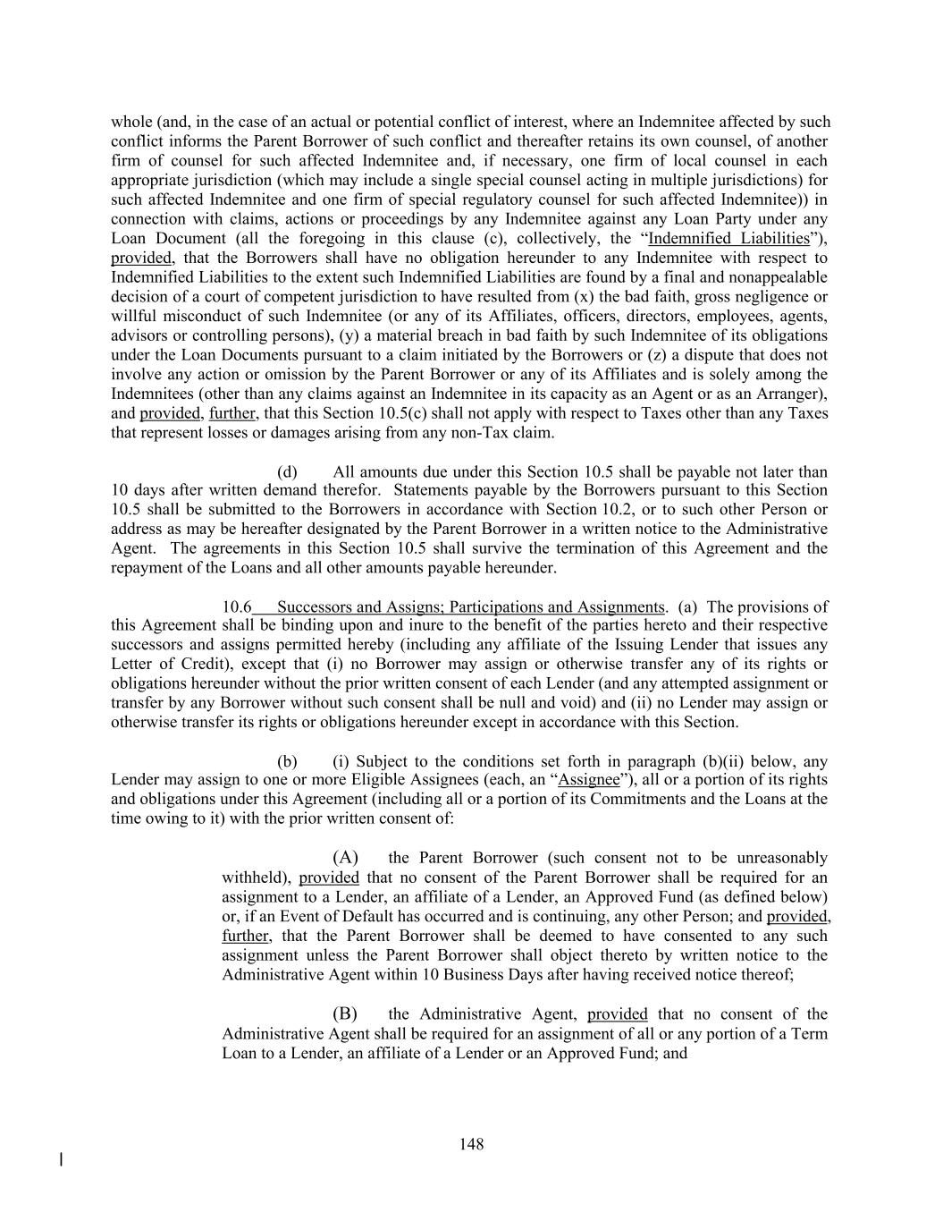 whole (and, in the case of an actual or potential conflict of interest, where an Indemnitee affected by such conflict informs the Parent Borrower of such conflict and thereafter retains its own counsel, of another firm of counsel for such affected Indemnitee and, if necessary, one firm of local counsel in each appropriate jurisdiction (which may include a single special counsel acting in multiple jurisdictions) for such affected Indemnitee and one firm of special regulatory counsel for such affected Indemnitee)) in connection with claims, actions or proceedings by any Indemnitee against any Loan Party under any Loan Document (all the foregoing in this clause (c), collectively, the “Indemnified Liabilities”), provided, that the Borrowers shall have no obligation hereunder to any Indemnitee with respect to Indemnified Liabilities to the extent such Indemnified Liabilities are found by a final and nonappealable decision of a court of competent jurisdiction to have resulted from (x) the bad faith, gross negligence or willful misconduct of such Indemnitee (or any of its Affiliates, officers, directors, employees, agents, advisors or controlling persons), (y) a material breach in bad faith by such Indemnitee of its obligations under the Loan Documents pursuant to a claim initiated by the Borrowers or (z) a dispute that does not involve any action or omission by the Parent Borrower or any of its Affiliates and is solely among the Indemnitees (other than any claims against an Indemnitee in its capacity as an Agent or as an Arranger), and provided, further, that this Section 10.5(c) shall not apply with respect to Taxes other than any Taxes that represent losses or damages arising from any non-Tax claim. (d) All amounts due under this Section 10.5 shall be payable not later than 10 days after written demand therefor. Statements payable by the Borrowers pursuant to this Section 10.5 shall be submitted to the Borrowers in accordance with Section 10.2, or to such other Person or address as may be hereafter designated by the Parent Borrower in a written notice to the Administrative Agent. The agreements in this Section 10.5 shall survive the termination of this Agreement and the repayment of the Loans and all other amounts payable hereunder. 10.6 Successors and Assigns; Participations and Assignments. (a) The provisions of this Agreement shall be binding upon and inure to the benefit of the parties hereto and their respective successors and assigns permitted hereby (including any affiliate of the Issuing Lender that issues any Letter of Credit), except that (i) no Borrower may assign or otherwise transfer any of its rights or obligations hereunder without the prior written consent of each Lender (and any attempted assignment or transfer by any Borrower without such consent shall be null and void) and (ii) no Lender may assign or otherwise transfer its rights or obligations hereunder except in accordance with this Section. (b) (i) Subject to the conditions set forth in paragraph (b)(ii) below, any Lender may assign to one or more Eligible Assignees (each, an “Assignee”), all or a portion of its rights and obligations under this Agreement (including all or a portion of its Commitments and the Loans at the time owing to it) with the prior written consent of: (A) the Parent Borrower (such consent not to be unreasonably withheld), provided that no consent of the Parent Borrower shall be required for an assignment to a Lender, an affiliate of a Lender, an Approved Fund (as defined below) or, if an Event of Default has occurred and is continuing, any other Person; and provided, further, that the Parent Borrower shall be deemed to have consented to any such assignment unless the Parent Borrower shall object thereto by written notice to the Administrative Agent within 10 Business Days after having received notice thereof; (B) the Administrative Agent, provided that no consent of the Administrative Agent shall be required for an assignment of all or any portion of a Term Loan to a Lender, an affiliate of a Lender or an Approved Fund; and 148