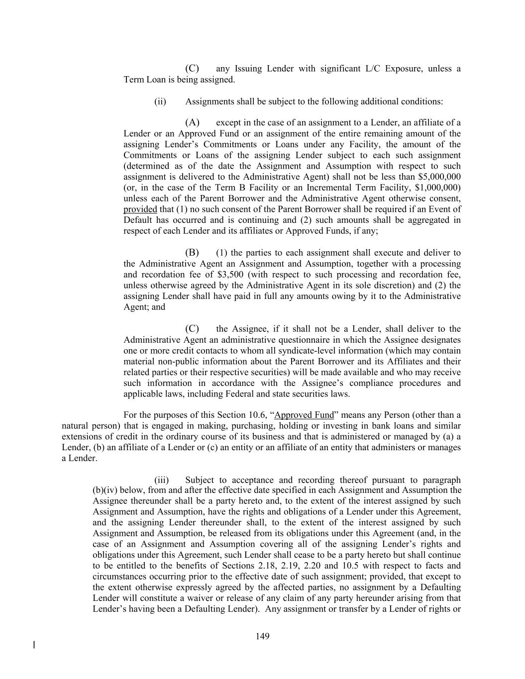 (C) any Issuing Lender with significant L/C Exposure, unless a Term Loan is being assigned. (ii) Assignments shall be subject to the following additional conditions: (A) except in the case of an assignment to a Lender, an affiliate of a Lender or an Approved Fund or an assignment of the entire remaining amount of the assigning Lender’s Commitments or Loans under any Facility, the amount of the Commitments or Loans of the assigning Lender subject to each such assignment (determined as of the date the Assignment and Assumption with respect to such assignment is delivered to the Administrative Agent) shall not be less than $5,000,000 (or, in the case of the Term B Facility or an Incremental Term Facility, $1,000,000) unless each of the Parent Borrower and the Administrative Agent otherwise consent, provided that (1) no such consent of the Parent Borrower shall be required if an Event of Default has occurred and is continuing and (2) such amounts shall be aggregated in respect of each Lender and its affiliates or Approved Funds, if any; (B) (1) the parties to each assignment shall execute and deliver to the Administrative Agent an Assignment and Assumption, together with a processing and recordation fee of $3,500 (with respect to such processing and recordation fee, unless otherwise agreed by the Administrative Agent in its sole discretion) and (2) the assigning Lender shall have paid in full any amounts owing by it to the Administrative Agent; and (C) the Assignee, if it shall not be a Lender, shall deliver to the Administrative Agent an administrative questionnaire in which the Assignee designates one or more credit contacts to whom all syndicate-level information (which may contain material non-public information about the Parent Borrower and its Affiliates and their related parties or their respective securities) will be made available and who may receive such information in accordance with the Assignee’s compliance procedures and applicable laws, including Federal and state securities laws. For the purposes of this Section 10.6, “Approved Fund” means any Person (other than a natural person) that is engaged in making, purchasing, holding or investing in bank loans and similar extensions of credit in the ordinary course of its business and that is administered or managed by (a) a Lender, (b) an affiliate of a Lender or (c) an entity or an affiliate of an entity that administers or manages a Lender. (iii) Subject to acceptance and recording thereof pursuant to paragraph (b)(iv) below, from and after the effective date specified in each Assignment and Assumption the Assignee thereunder shall be a party hereto and, to the extent of the interest assigned by such Assignment and Assumption, have the rights and obligations of a Lender under this Agreement, and the assigning Lender thereunder shall, to the extent of the interest assigned by such Assignment and Assumption, be released from its obligations under this Agreement (and, in the case of an Assignment and Assumption covering all of the assigning Lender’s rights and obligations under this Agreement, such Lender shall cease to be a party hereto but shall continue to be entitled to the benefits of Sections 2.18, 2.19, 2.20 and 10.5 with respect to facts and circumstances occurring prior to the effective date of such assignment; provided, that except to the extent otherwise expressly agreed by the affected parties, no assignment by a Defaulting Lender will constitute a waiver or release of any claim of any party hereunder arising from that Lender’s having been a Defaulting Lender). Any assignment or transfer by a Lender of rights or 149