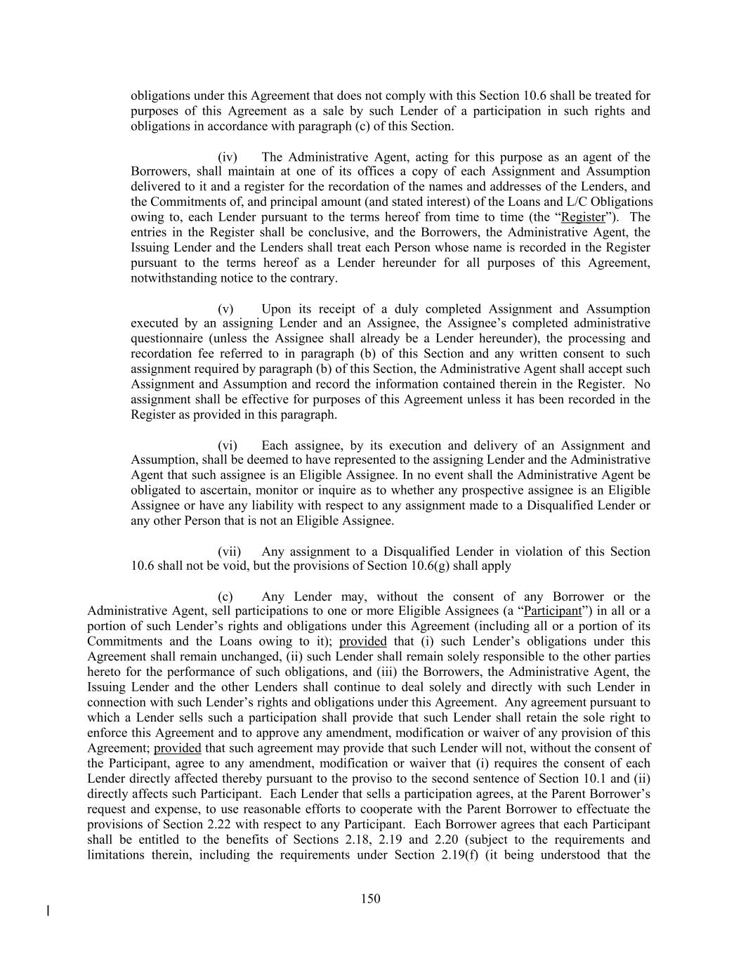 obligations under this Agreement that does not comply with this Section 10.6 shall be treated for purposes of this Agreement as a sale by such Lender of a participation in such rights and obligations in accordance with paragraph (c) of this Section. (iv) The Administrative Agent, acting for this purpose as an agent of the Borrowers, shall maintain at one of its offices a copy of each Assignment and Assumption delivered to it and a register for the recordation of the names and addresses of the Lenders, and the Commitments of, and principal amount (and stated interest) of the Loans and L/C Obligations owing to, each Lender pursuant to the terms hereof from time to time (the “Register”). The entries in the Register shall be conclusive, and the Borrowers, the Administrative Agent, the Issuing Lender and the Lenders shall treat each Person whose name is recorded in the Register pursuant to the terms hereof as a Lender hereunder for all purposes of this Agreement, notwithstanding notice to the contrary. (v) Upon its receipt of a duly completed Assignment and Assumption executed by an assigning Lender and an Assignee, the Assignee’s completed administrative questionnaire (unless the Assignee shall already be a Lender hereunder), the processing and recordation fee referred to in paragraph (b) of this Section and any written consent to such assignment required by paragraph (b) of this Section, the Administrative Agent shall accept such Assignment and Assumption and record the information contained therein in the Register. No assignment shall be effective for purposes of this Agreement unless it has been recorded in the Register as provided in this paragraph. (vi) Each assignee, by its execution and delivery of an Assignment and Assumption, shall be deemed to have represented to the assigning Lender and the Administrative Agent that such assignee is an Eligible Assignee. In no event shall the Administrative Agent be obligated to ascertain, monitor or inquire as to whether any prospective assignee is an Eligible Assignee or have any liability with respect to any assignment made to a Disqualified Lender or any other Person that is not an Eligible Assignee. (vii) Any assignment to a Disqualified Lender in violation of this Section 10.6 shall not be void, but the provisions of Section 10.6(g) shall apply (c) Any Lender may, without the consent of any Borrower or the Administrative Agent, sell participations to one or more Eligible Assignees (a “Participant”) in all or a portion of such Lender’s rights and obligations under this Agreement (including all or a portion of its Commitments and the Loans owing to it); provided that (i) such Lender’s obligations under this Agreement shall remain unchanged, (ii) such Lender shall remain solely responsible to the other parties hereto for the performance of such obligations, and (iii) the Borrowers, the Administrative Agent, the Issuing Lender and the other Lenders shall continue to deal solely and directly with such Lender in connection with such Lender’s rights and obligations under this Agreement. Any agreement pursuant to which a Lender sells such a participation shall provide that such Lender shall retain the sole right to enforce this Agreement and to approve any amendment, modification or waiver of any provision of this Agreement; provided that such agreement may provide that such Lender will not, without the consent of the Participant, agree to any amendment, modification or waiver that (i) requires the consent of each Lender directly affected thereby pursuant to the proviso to the second sentence of Section 10.1 and (ii) directly affects such Participant. Each Lender that sells a participation agrees, at the Parent Borrower’s request and expense, to use reasonable efforts to cooperate with the Parent Borrower to effectuate the provisions of Section 2.22 with respect to any Participant. Each Borrower agrees that each Participant shall be entitled to the benefits of Sections 2.18, 2.19 and 2.20 (subject to the requirements and limitations therein, including the requirements under Section 2.19(f) (it being understood that the 150