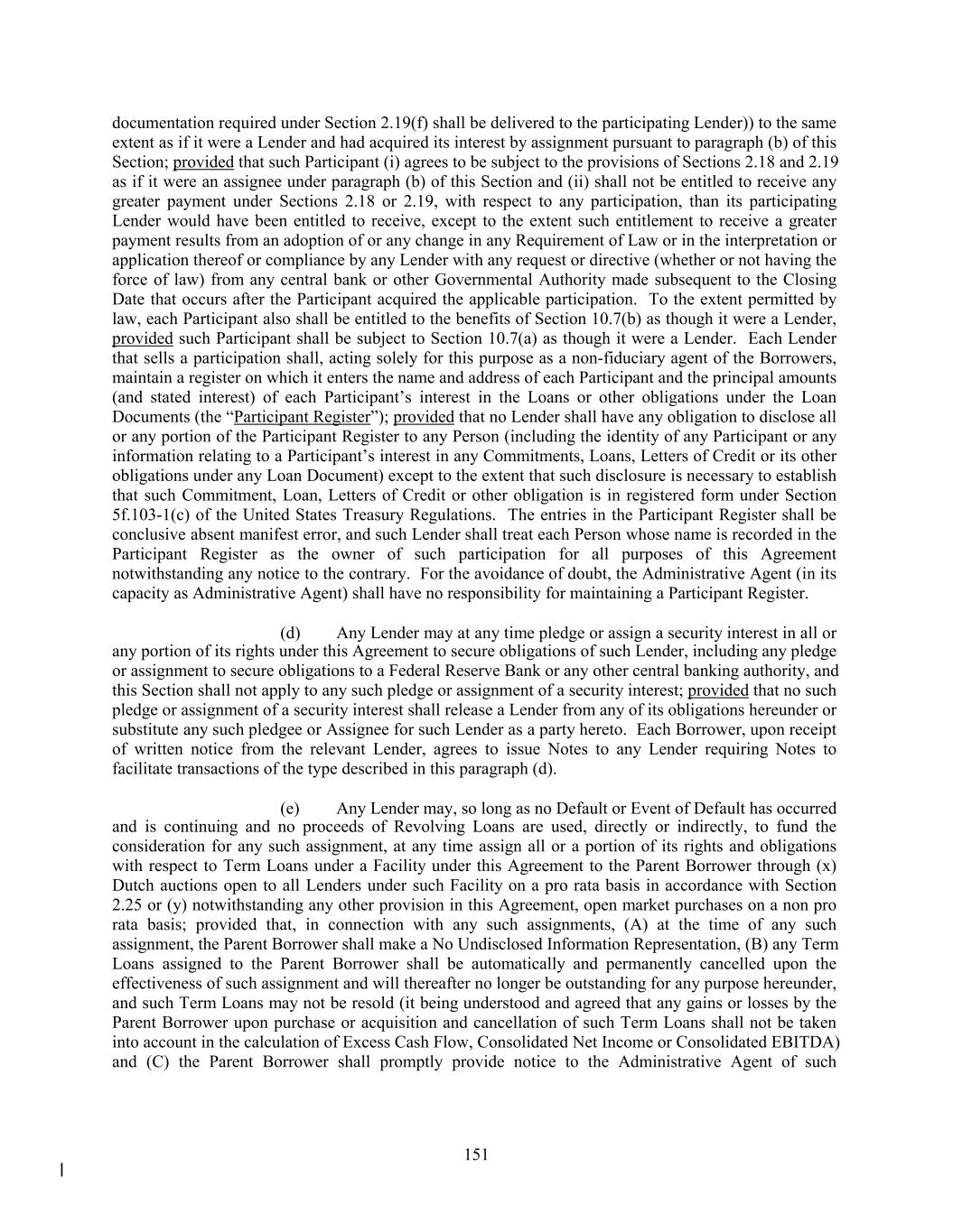 documentation required under Section 2.19(f) shall be delivered to the participating Lender)) to the same extent as if it were a Lender and had acquired its interest by assignment pursuant to paragraph (b) of this Section; provided that such Participant (i) agrees to be subject to the provisions of Sections 2.18 and 2.19 as if it were an assignee under paragraph (b) of this Section and (ii) shall not be entitled to receive any greater payment under Sections 2.18 or 2.19, with respect to any participation, than its participating Lender would have been entitled to receive, except to the extent such entitlement to receive a greater payment results from an adoption of or any change in any Requirement of Law or in the interpretation or application thereof or compliance by any Lender with any request or directive (whether or not having the force of law) from any central bank or other Governmental Authority made subsequent to the Closing Date that occurs after the Participant acquired the applicable participation. To the extent permitted by law, each Participant also shall be entitled to the benefits of Section 10.7(b) as though it were a Lender, provided such Participant shall be subject to Section 10.7(a) as though it were a Lender. Each Lender that sells a participation shall, acting solely for this purpose as a non-fiduciary agent of the Borrowers, maintain a register on which it enters the name and address of each Participant and the principal amounts (and stated interest) of each Participant’s interest in the Loans or other obligations under the Loan Documents (the “Participant Register”); provided that no Lender shall have any obligation to disclose all or any portion of the Participant Register to any Person (including the identity of any Participant or any information relating to a Participant’s interest in any Commitments, Loans, Letters of Credit or its other obligations under any Loan Document) except to the extent that such disclosure is necessary to establish that such Commitment, Loan, Letters of Credit or other obligation is in registered form under Section 5f.103-1(c) of the United States Treasury Regulations. The entries in the Participant Register shall be conclusive absent manifest error, and such Lender shall treat each Person whose name is recorded in the Participant Register as the owner of such participation for all purposes of this Agreement notwithstanding any notice to the contrary. For the avoidance of doubt, the Administrative Agent (in its capacity as Administrative Agent) shall have no responsibility for maintaining a Participant Register. (d) Any Lender may at any time pledge or assign a security interest in all or any portion of its rights under this Agreement to secure obligations of such Lender, including any pledge or assignment to secure obligations to a Federal Reserve Bank or any other central banking authority, and this Section shall not apply to any such pledge or assignment of a security interest; provided that no such pledge or assignment of a security interest shall release a Lender from any of its obligations hereunder or substitute any such pledgee or Assignee for such Lender as a party hereto. Each Borrower, upon receipt of written notice from the relevant Lender, agrees to issue Notes to any Lender requiring Notes to facilitate transactions of the type described in this paragraph (d). (e) Any Lender may, so long as no Default or Event of Default has occurred and is continuing and no proceeds of Revolving Loans are used, directly or indirectly, to fund the consideration for any such assignment, at any time assign all or a portion of its rights and obligations with respect to Term Loans under a Facility under this Agreement to the Parent Borrower through (x) Dutch auctions open to all Lenders under such Facility on a pro rata basis in accordance with Section 2.25 or (y) notwithstanding any other provision in this Agreement, open market purchases on a non pro rata basis; provided that, in connection with any such assignments, (A) at the time of any such assignment, the Parent Borrower shall make a No Undisclosed Information Representation, (B) any Term Loans assigned to the Parent Borrower shall be automatically and permanently cancelled upon the effectiveness of such assignment and will thereafter no longer be outstanding for any purpose hereunder, and such Term Loans may not be resold (it being understood and agreed that any gains or losses by the Parent Borrower upon purchase or acquisition and cancellation of such Term Loans shall not be taken into account in the calculation of Excess Cash Flow, Consolidated Net Income or Consolidated EBITDA) and (C) the Parent Borrower shall promptly provide notice to the Administrative Agent of such 151