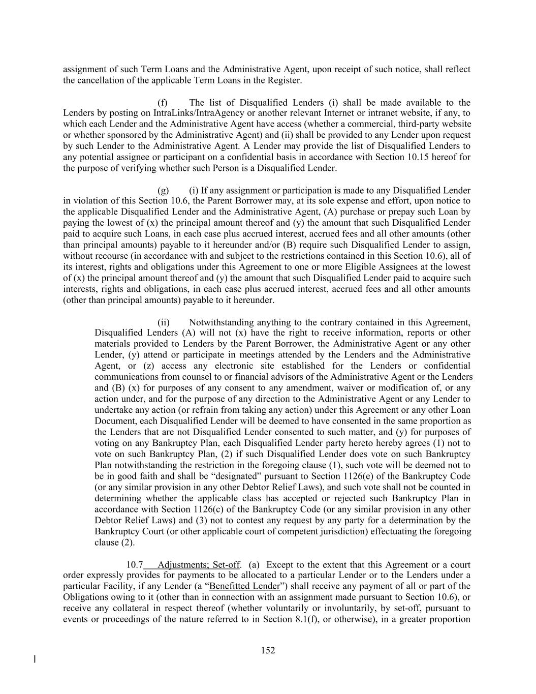 assignment of such Term Loans and the Administrative Agent, upon receipt of such notice, shall reflect the cancellation of the applicable Term Loans in the Register. (f) The list of Disqualified Lenders (i) shall be made available to the Lenders by posting on IntraLinks/IntraAgency or another relevant Internet or intranet website, if any, to which each Lender and the Administrative Agent have access (whether a commercial, third-party website or whether sponsored by the Administrative Agent) and (ii) shall be provided to any Lender upon request by such Lender to the Administrative Agent. A Lender may provide the list of Disqualified Lenders to any potential assignee or participant on a confidential basis in accordance with Section 10.15 hereof for the purpose of verifying whether such Person is a Disqualified Lender. (g) (i) If any assignment or participation is made to any Disqualified Lender in violation of this Section 10.6, the Parent Borrower may, at its sole expense and effort, upon notice to the applicable Disqualified Lender and the Administrative Agent, (A) purchase or prepay such Loan by paying the lowest of (x) the principal amount thereof and (y) the amount that such Disqualified Lender paid to acquire such Loans, in each case plus accrued interest, accrued fees and all other amounts (other than principal amounts) payable to it hereunder and/or (B) require such Disqualified Lender to assign, without recourse (in accordance with and subject to the restrictions contained in this Section 10.6), all of its interest, rights and obligations under this Agreement to one or more Eligible Assignees at the lowest of (x) the principal amount thereof and (y) the amount that such Disqualified Lender paid to acquire such interests, rights and obligations, in each case plus accrued interest, accrued fees and all other amounts (other than principal amounts) payable to it hereunder. (ii) Notwithstanding anything to the contrary contained in this Agreement, Disqualified Lenders (A) will not (x) have the right to receive information, reports or other materials provided to Lenders by the Parent Borrower, the Administrative Agent or any other Lender, (y) attend or participate in meetings attended by the Lenders and the Administrative Agent, or (z) access any electronic site established for the Lenders or confidential communications from counsel to or financial advisors of the Administrative Agent or the Lenders and (B) (x) for purposes of any consent to any amendment, waiver or modification of, or any action under, and for the purpose of any direction to the Administrative Agent or any Lender to undertake any action (or refrain from taking any action) under this Agreement or any other Loan Document, each Disqualified Lender will be deemed to have consented in the same proportion as the Lenders that are not Disqualified Lender consented to such matter, and (y) for purposes of voting on any Bankruptcy Plan, each Disqualified Lender party hereto hereby agrees (1) not to vote on such Bankruptcy Plan, (2) if such Disqualified Lender does vote on such Bankruptcy Plan notwithstanding the restriction in the foregoing clause (1), such vote will be deemed not to be in good faith and shall be “designated” pursuant to Section 1126(e) of the Bankruptcy Code (or any similar provision in any other Debtor Relief Laws), and such vote shall not be counted in determining whether the applicable class has accepted or rejected such Bankruptcy Plan in accordance with Section 1126(c) of the Bankruptcy Code (or any similar provision in any other Debtor Relief Laws) and (3) not to contest any request by any party for a determination by the Bankruptcy Court (or other applicable court of competent jurisdiction) effectuating the foregoing clause (2). 10.7 Adjustments; Set-off. (a) Except to the extent that this Agreement or a court order expressly provides for payments to be allocated to a particular Lender or to the Lenders under a particular Facility, if any Lender (a “Benefitted Lender”) shall receive any payment of all or part of the Obligations owing to it (other than in connection with an assignment made pursuant to Section 10.6), or receive any collateral in respect thereof (whether voluntarily or involuntarily, by set-off, pursuant to events or proceedings of the nature referred to in Section 8.1(f), or otherwise), in a greater proportion 152