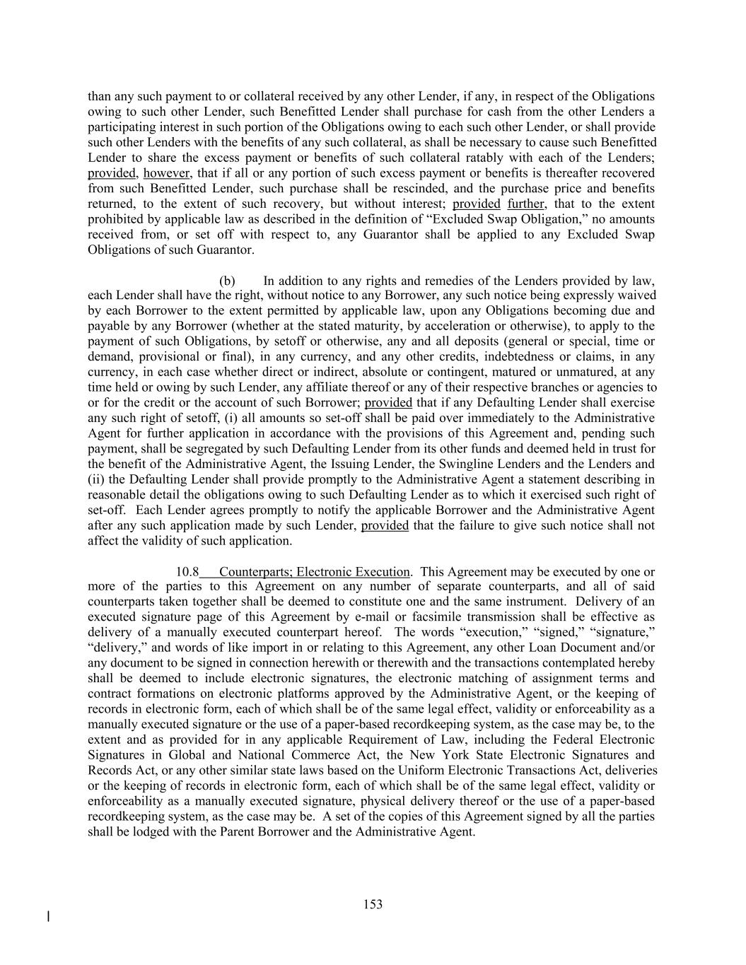 than any such payment to or collateral received by any other Lender, if any, in respect of the Obligations owing to such other Lender, such Benefitted Lender shall purchase for cash from the other Lenders a participating interest in such portion of the Obligations owing to each such other Lender, or shall provide such other Lenders with the benefits of any such collateral, as shall be necessary to cause such Benefitted Lender to share the excess payment or benefits of such collateral ratably with each of the Lenders; provided, however, that if all or any portion of such excess payment or benefits is thereafter recovered from such Benefitted Lender, such purchase shall be rescinded, and the purchase price and benefits returned, to the extent of such recovery, but without interest; provided further, that to the extent prohibited by applicable law as described in the definition of “Excluded Swap Obligation,” no amounts received from, or set off with respect to, any Guarantor shall be applied to any Excluded Swap Obligations of such Guarantor. (b) In addition to any rights and remedies of the Lenders provided by law, each Lender shall have the right, without notice to any Borrower, any such notice being expressly waived by each Borrower to the extent permitted by applicable law, upon any Obligations becoming due and payable by any Borrower (whether at the stated maturity, by acceleration or otherwise), to apply to the payment of such Obligations, by setoff or otherwise, any and all deposits (general or special, time or demand, provisional or final), in any currency, and any other credits, indebtedness or claims, in any currency, in each case whether direct or indirect, absolute or contingent, matured or unmatured, at any time held or owing by such Lender, any affiliate thereof or any of their respective branches or agencies to or for the credit or the account of such Borrower; provided that if any Defaulting Lender shall exercise any such right of setoff, (i) all amounts so set-off shall be paid over immediately to the Administrative Agent for further application in accordance with the provisions of this Agreement and, pending such payment, shall be segregated by such Defaulting Lender from its other funds and deemed held in trust for the benefit of the Administrative Agent, the Issuing Lender, the Swingline Lenders and the Lenders and (ii) the Defaulting Lender shall provide promptly to the Administrative Agent a statement describing in reasonable detail the obligations owing to such Defaulting Lender as to which it exercised such right of set-off. Each Lender agrees promptly to notify the applicable Borrower and the Administrative Agent after any such application made by such Lender, provided that the failure to give such notice shall not affect the validity of such application. 10.8 Counterparts; Electronic Execution. This Agreement may be executed by one or more of the parties to this Agreement on any number of separate counterparts, and all of said counterparts taken together shall be deemed to constitute one and the same instrument. Delivery of an executed signature page of this Agreement by e-mail or facsimile transmission shall be effective as delivery of a manually executed counterpart hereof. The words “execution,” “signed,” “signature,” “delivery,” and words of like import in or relating to this Agreement, any other Loan Document and/or any document to be signed in connection herewith or therewith and the transactions contemplated hereby shall be deemed to include electronic signatures, the electronic matching of assignment terms and contract formations on electronic platforms approved by the Administrative Agent, or the keeping of records in electronic form, each of which shall be of the same legal effect, validity or enforceability as a manually executed signature or the use of a paper-based recordkeeping system, as the case may be, to the extent and as provided for in any applicable Requirement of Law, including the Federal Electronic Signatures in Global and National Commerce Act, the New York State Electronic Signatures and Records Act, or any other similar state laws based on the Uniform Electronic Transactions Act, deliveries or the keeping of records in electronic form, each of which shall be of the same legal effect, validity or enforceability as a manually executed signature, physical delivery thereof or the use of a paper-based recordkeeping system, as the case may be. A set of the copies of this Agreement signed by all the parties shall be lodged with the Parent Borrower and the Administrative Agent. 153