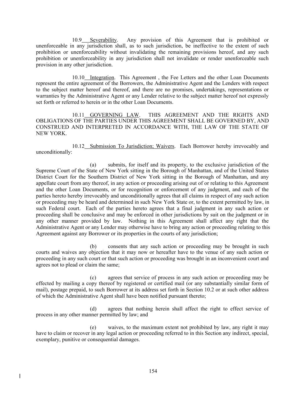 10.9 Severability. Any provision of this Agreement that is prohibited or unenforceable in any jurisdiction shall, as to such jurisdiction, be ineffective to the extent of such prohibition or unenforceability without invalidating the remaining provisions hereof, and any such prohibition or unenforceability in any jurisdiction shall not invalidate or render unenforceable such provision in any other jurisdiction. 10.10 Integration. This Agreement , the Fee Letters and the other Loan Documents represent the entire agreement of the Borrowers, the Administrative Agent and the Lenders with respect to the subject matter hereof and thereof, and there are no promises, undertakings, representations or warranties by the Administrative Agent or any Lender relative to the subject matter hereof not expressly set forth or referred to herein or in the other Loan Documents. 10.11 GOVERNING LAW. THIS AGREEMENT AND THE RIGHTS AND OBLIGATIONS OF THE PARTIES UNDER THIS AGREEMENT SHALL BE GOVERNED BY, AND CONSTRUED AND INTERPRETED IN ACCORDANCE WITH, THE LAW OF THE STATE OF NEW YORK. 10.12 Submission To Jurisdiction; Waivers. Each Borrower hereby irrevocably and unconditionally: (a) submits, for itself and its property, to the exclusive jurisdiction of the Supreme Court of the State of New York sitting in the Borough of Manhattan, and of the United States District Court for the Southern District of New York sitting in the Borough of Manhattan, and any appellate court from any thereof, in any action or proceeding arising out of or relating to this Agreement and the other Loan Documents, or for recognition or enforcement of any judgment, and each of the parties hereto hereby irrevocably and unconditionally agrees that all claims in respect of any such action or proceeding may be heard and determined in such New York State or, to the extent permitted by law, in such Federal court. Each of the parties hereto agrees that a final judgment in any such action or proceeding shall be conclusive and may be enforced in other jurisdictions by suit on the judgment or in any other manner provided by law. Nothing in this Agreement shall affect any right that the Administrative Agent or any Lender may otherwise have to bring any action or proceeding relating to this Agreement against any Borrower or its properties in the courts of any jurisdiction; (b) consents that any such action or proceeding may be brought in such courts and waives any objection that it may now or hereafter have to the venue of any such action or proceeding in any such court or that such action or proceeding was brought in an inconvenient court and agrees not to plead or claim the same; (c) agrees that service of process in any such action or proceeding may be effected by mailing a copy thereof by registered or certified mail (or any substantially similar form of mail), postage prepaid, to such Borrower at its address set forth in Section 10.2 or at such other address of which the Administrative Agent shall have been notified pursuant thereto; (d) agrees that nothing herein shall affect the right to effect service of process in any other manner permitted by law; and (e) waives, to the maximum extent not prohibited by law, any right it may have to claim or recover in any legal action or proceeding referred to in this Section any indirect, special, exemplary, punitive or consequential damages. 154