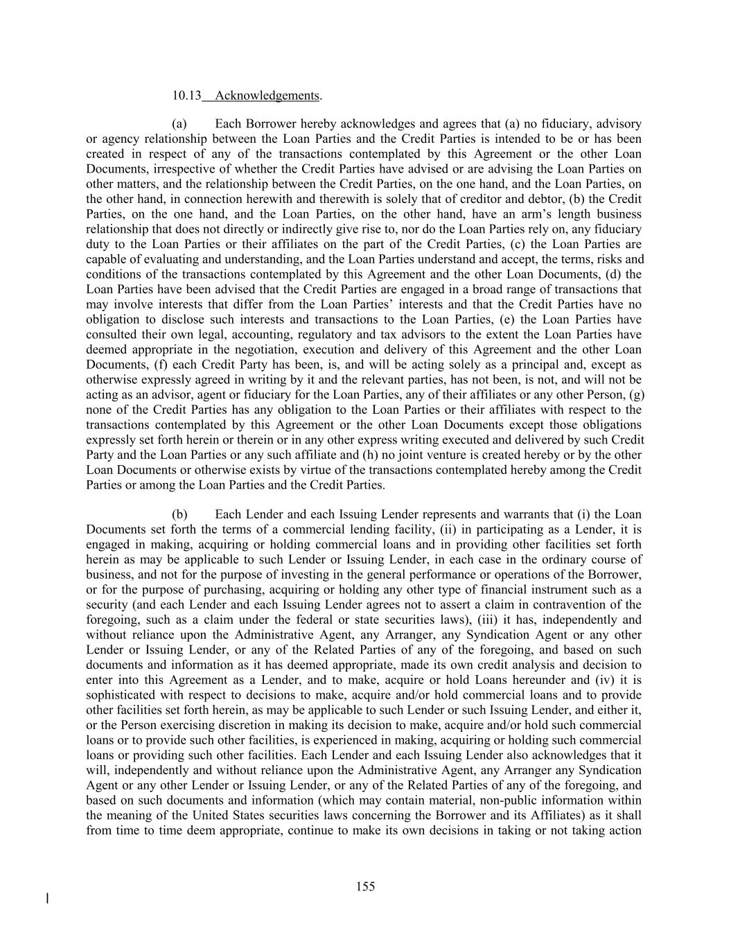 10.13 Acknowledgements. (a) Each Borrower hereby acknowledges and agrees that (a) no fiduciary, advisory or agency relationship between the Loan Parties and the Credit Parties is intended to be or has been created in respect of any of the transactions contemplated by this Agreement or the other Loan Documents, irrespective of whether the Credit Parties have advised or are advising the Loan Parties on other matters, and the relationship between the Credit Parties, on the one hand, and the Loan Parties, on the other hand, in connection herewith and therewith is solely that of creditor and debtor, (b) the Credit Parties, on the one hand, and the Loan Parties, on the other hand, have an arm’s length business relationship that does not directly or indirectly give rise to, nor do the Loan Parties rely on, any fiduciary duty to the Loan Parties or their affiliates on the part of the Credit Parties, (c) the Loan Parties are capable of evaluating and understanding, and the Loan Parties understand and accept, the terms, risks and conditions of the transactions contemplated by this Agreement and the other Loan Documents, (d) the Loan Parties have been advised that the Credit Parties are engaged in a broad range of transactions that may involve interests that differ from the Loan Parties’ interests and that the Credit Parties have no obligation to disclose such interests and transactions to the Loan Parties, (e) the Loan Parties have consulted their own legal, accounting, regulatory and tax advisors to the extent the Loan Parties have deemed appropriate in the negotiation, execution and delivery of this Agreement and the other Loan Documents, (f) each Credit Party has been, is, and will be acting solely as a principal and, except as otherwise expressly agreed in writing by it and the relevant parties, has not been, is not, and will not be acting as an advisor, agent or fiduciary for the Loan Parties, any of their affiliates or any other Person, (g) none of the Credit Parties has any obligation to the Loan Parties or their affiliates with respect to the transactions contemplated by this Agreement or the other Loan Documents except those obligations expressly set forth herein or therein or in any other express writing executed and delivered by such Credit Party and the Loan Parties or any such affiliate and (h) no joint venture is created hereby or by the other Loan Documents or otherwise exists by virtue of the transactions contemplated hereby among the Credit Parties or among the Loan Parties and the Credit Parties. (b) Each Lender and each Issuing Lender represents and warrants that (i) the Loan Documents set forth the terms of a commercial lending facility, (ii) in participating as a Lender, it is engaged in making, acquiring or holding commercial loans and in providing other facilities set forth herein as may be applicable to such Lender or Issuing Lender, in each case in the ordinary course of business, and not for the purpose of investing in the general performance or operations of the Borrower, or for the purpose of purchasing, acquiring or holding any other type of financial instrument such as a security (and each Lender and each Issuing Lender agrees not to assert a claim in contravention of the foregoing, such as a claim under the federal or state securities laws), (iii) it has, independently and without reliance upon the Administrative Agent, any Arranger, any Syndication Agent or any other Lender or Issuing Lender, or any of the Related Parties of any of the foregoing, and based on such documents and information as it has deemed appropriate, made its own credit analysis and decision to enter into this Agreement as a Lender, and to make, acquire or hold Loans hereunder and (iv) it is sophisticated with respect to decisions to make, acquire and/or hold commercial loans and to provide other facilities set forth herein, as may be applicable to such Lender or such Issuing Lender, and either it, or the Person exercising discretion in making its decision to make, acquire and/or hold such commercial loans or to provide such other facilities, is experienced in making, acquiring or holding such commercial loans or providing such other facilities. Each Lender and each Issuing Lender also acknowledges that it will, independently and without reliance upon the Administrative Agent, any Arranger any Syndication Agent or any other Lender or Issuing Lender, or any of the Related Parties of any of the foregoing, and based on such documents and information (which may contain material, non-public information within the meaning of the United States securities laws concerning the Borrower and its Affiliates) as it shall from time to time deem appropriate, continue to make its own decisions in taking or not taking action 155